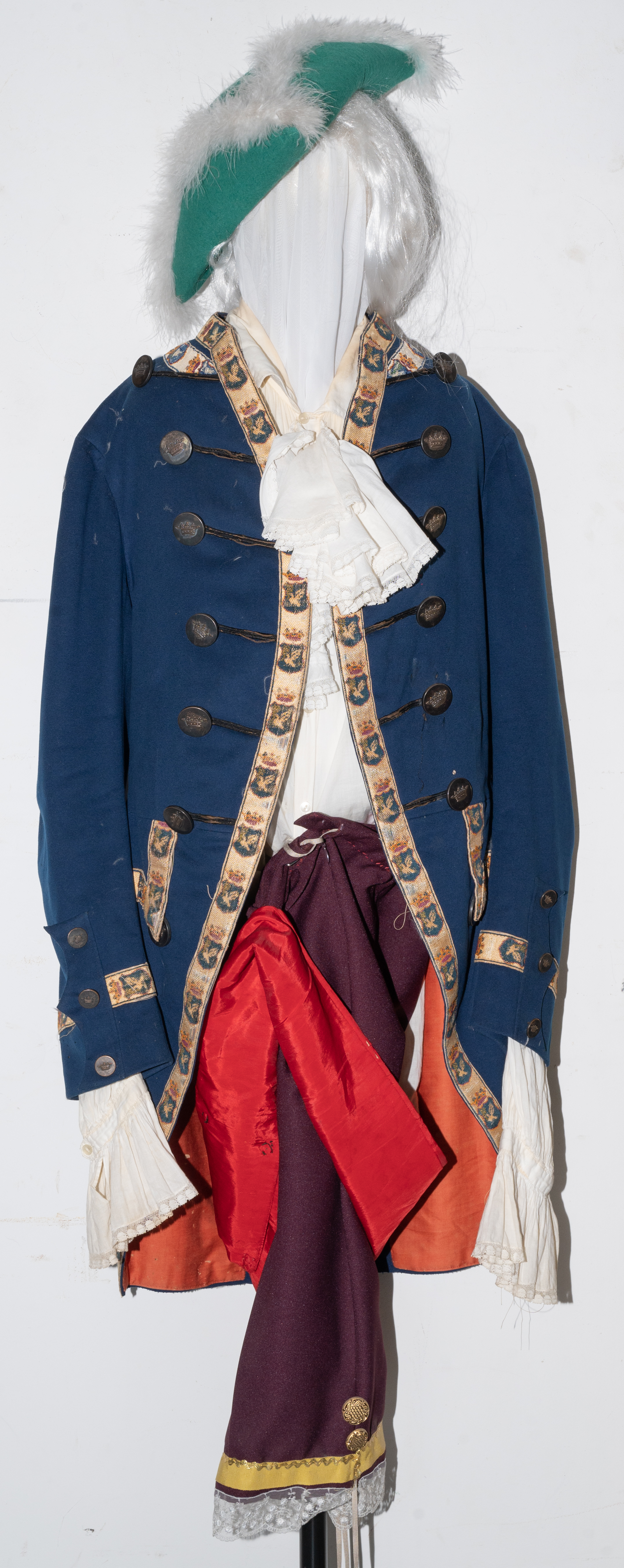 Marsina in panno blu con passamaneria e bottoni con stemma e corona, camicia e plastron bianchi, fascia in damascato rosso, calzoni in tessuto viola, parrucca e cappello. (usure e difetti).