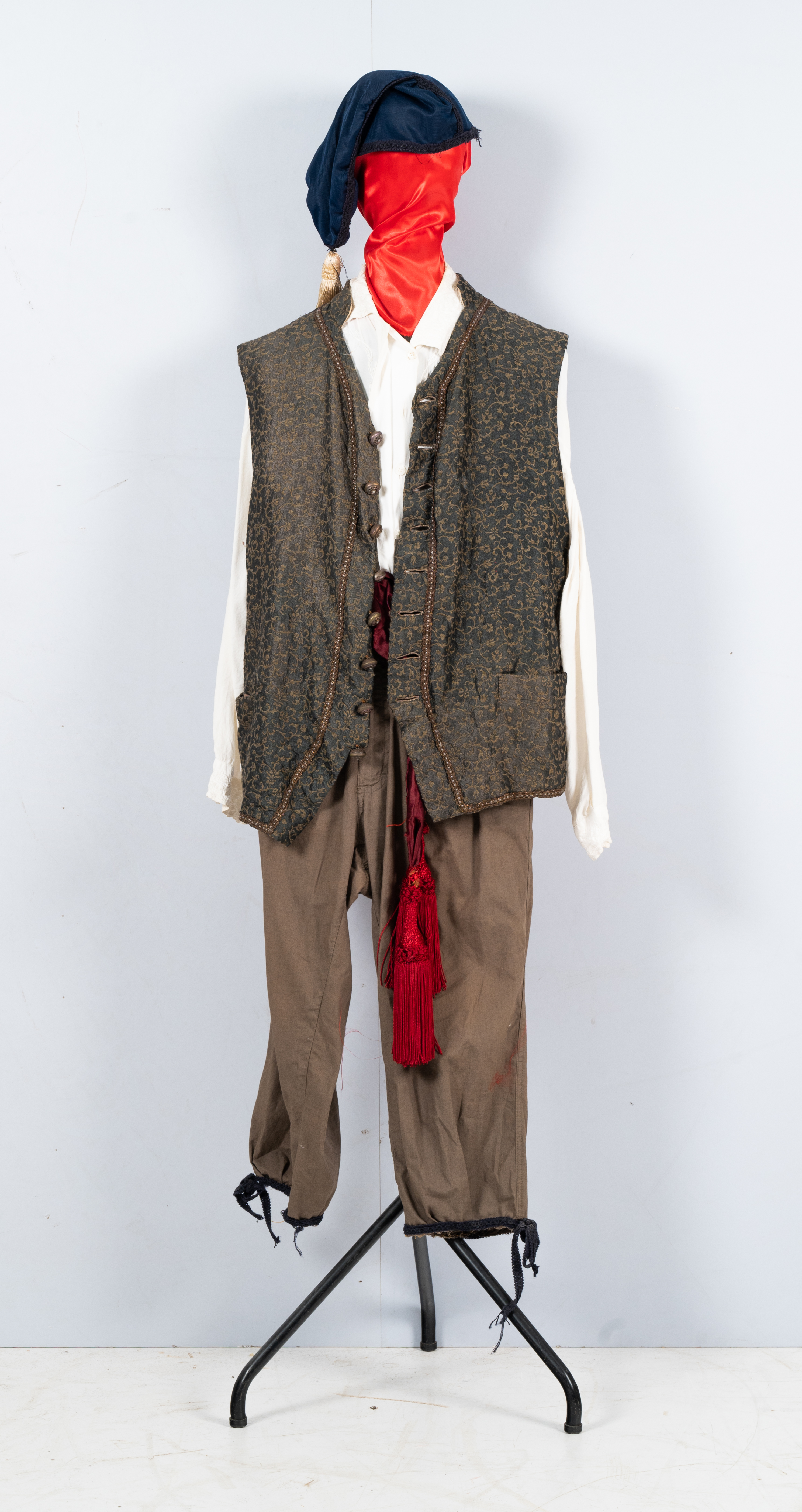 Abito teatrale orientale con manichino composto da gilet in tessuto a ramages marrone e verde, camicia riccamente ricamata, fascia bordeaux, pantaloni marroni, copricapo blu. (usure e difetti).