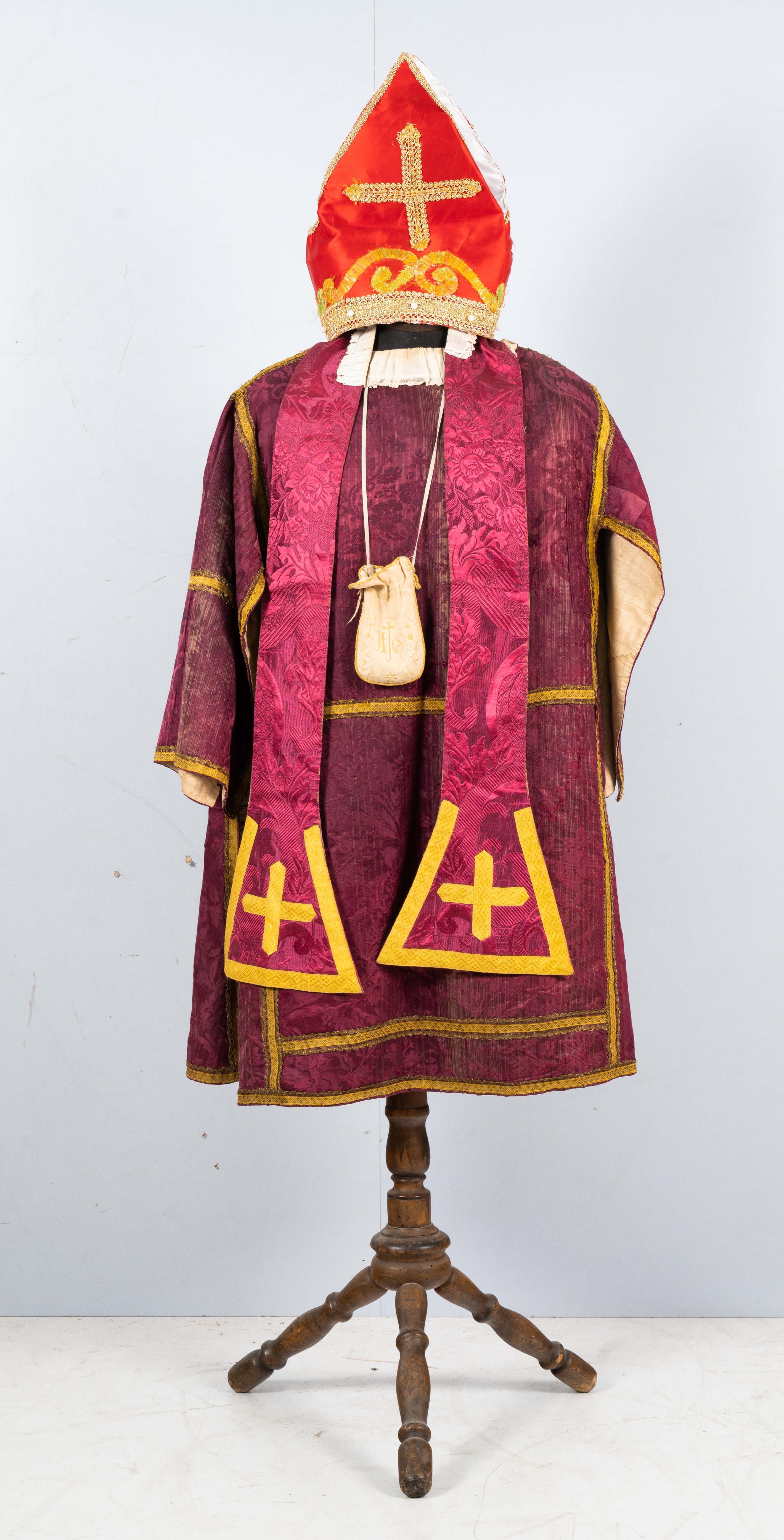 Abito ecclesiale in damasco di seta bordeaux composto da pianeta e stola, corredato da sacchetto ricamato (usure e difetti).