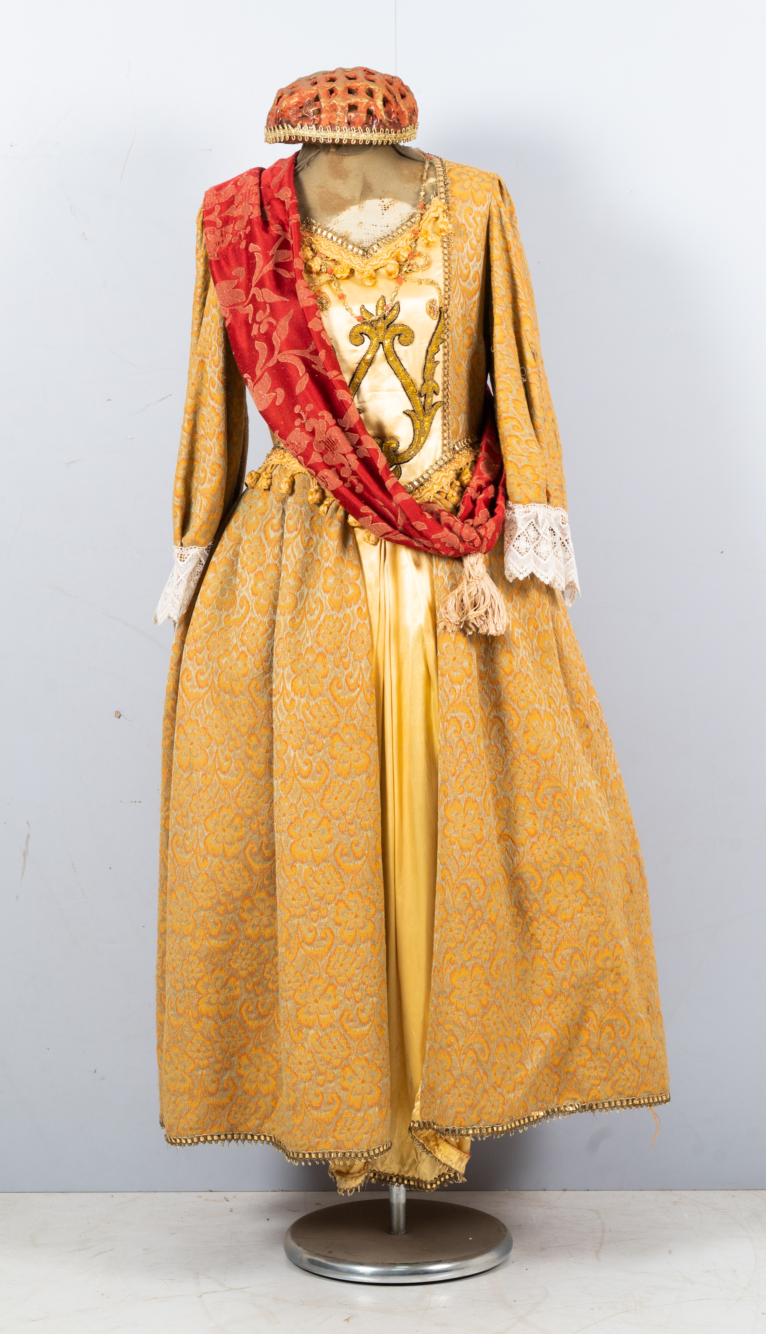 Abito teatrale da dama con manichino in tessuto damascato color ocra, polsi in pizzo, corpetto ricamato con motivi a ramages con passamanerie dorate, fascia in damasco bordeaux, corredato di collana e copricapo (usure e difetti).