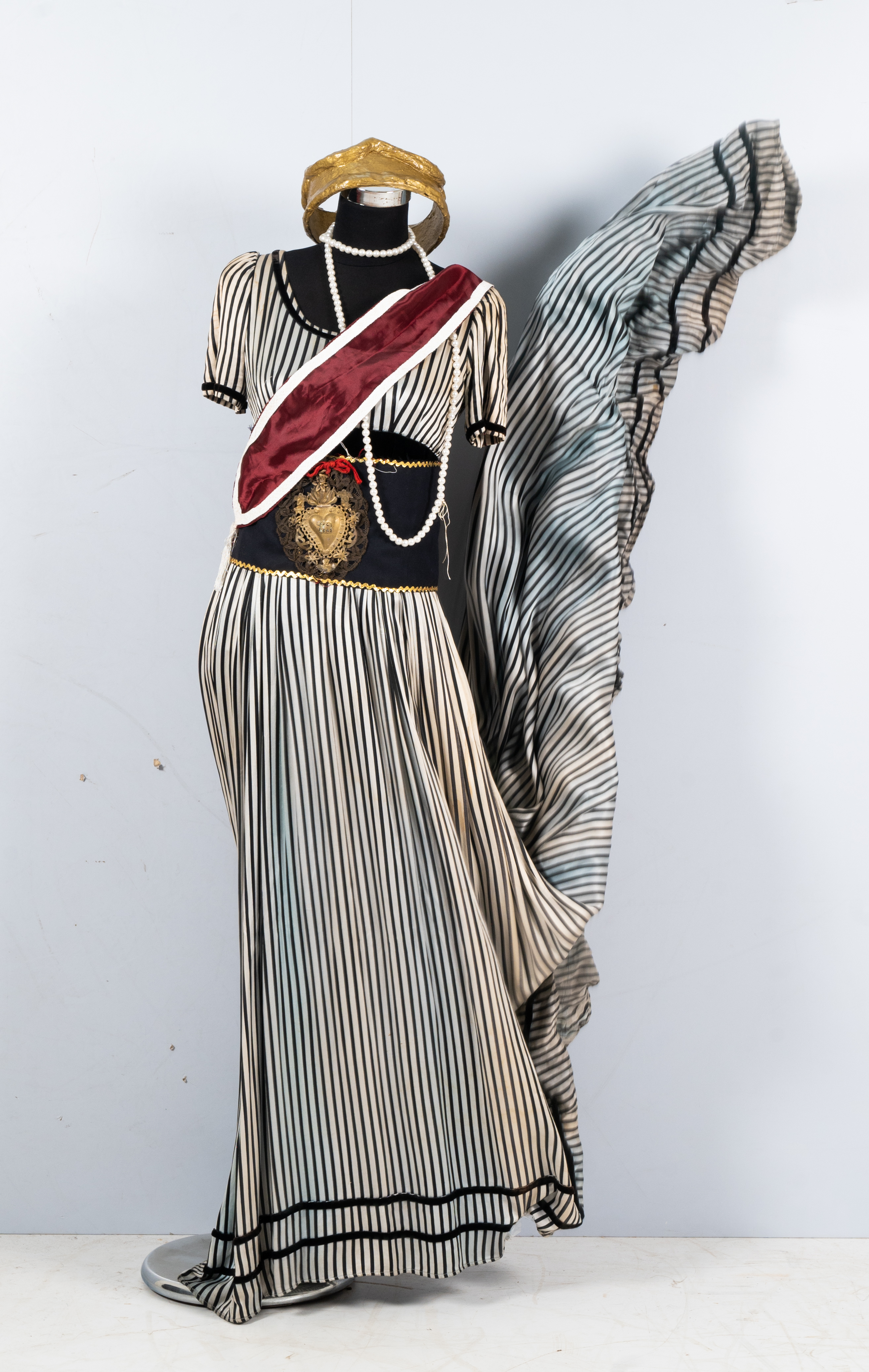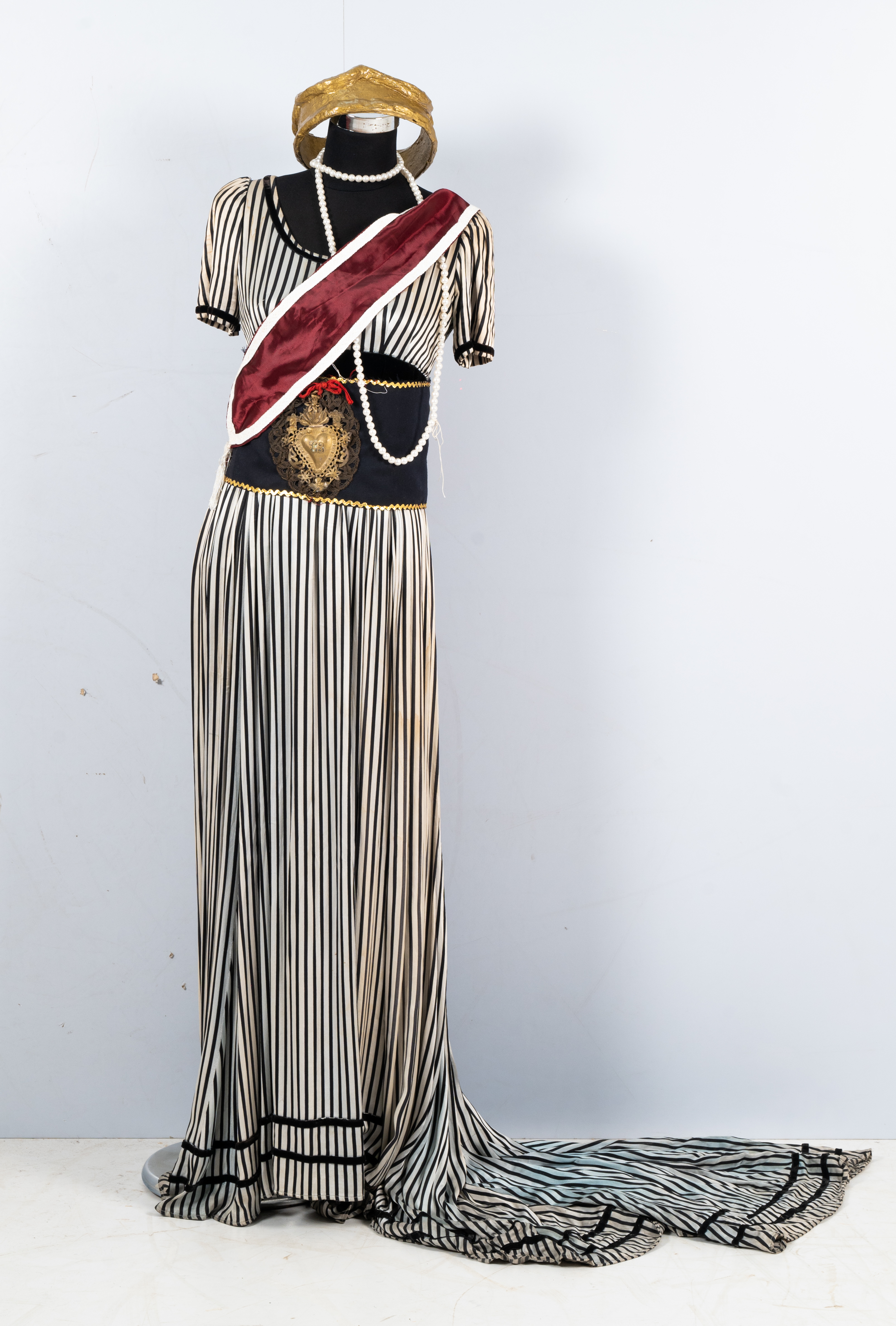 Abito teatrale femminile lungo con manichino in tessuto di raso a righe bianche e nere, mezze maniche, larga fascia in tessuto nero e oro con medaglione in metallo dorato, fascia bordeaux e bianca, corredata da collana in perle e corona dorata (usure e difetti).