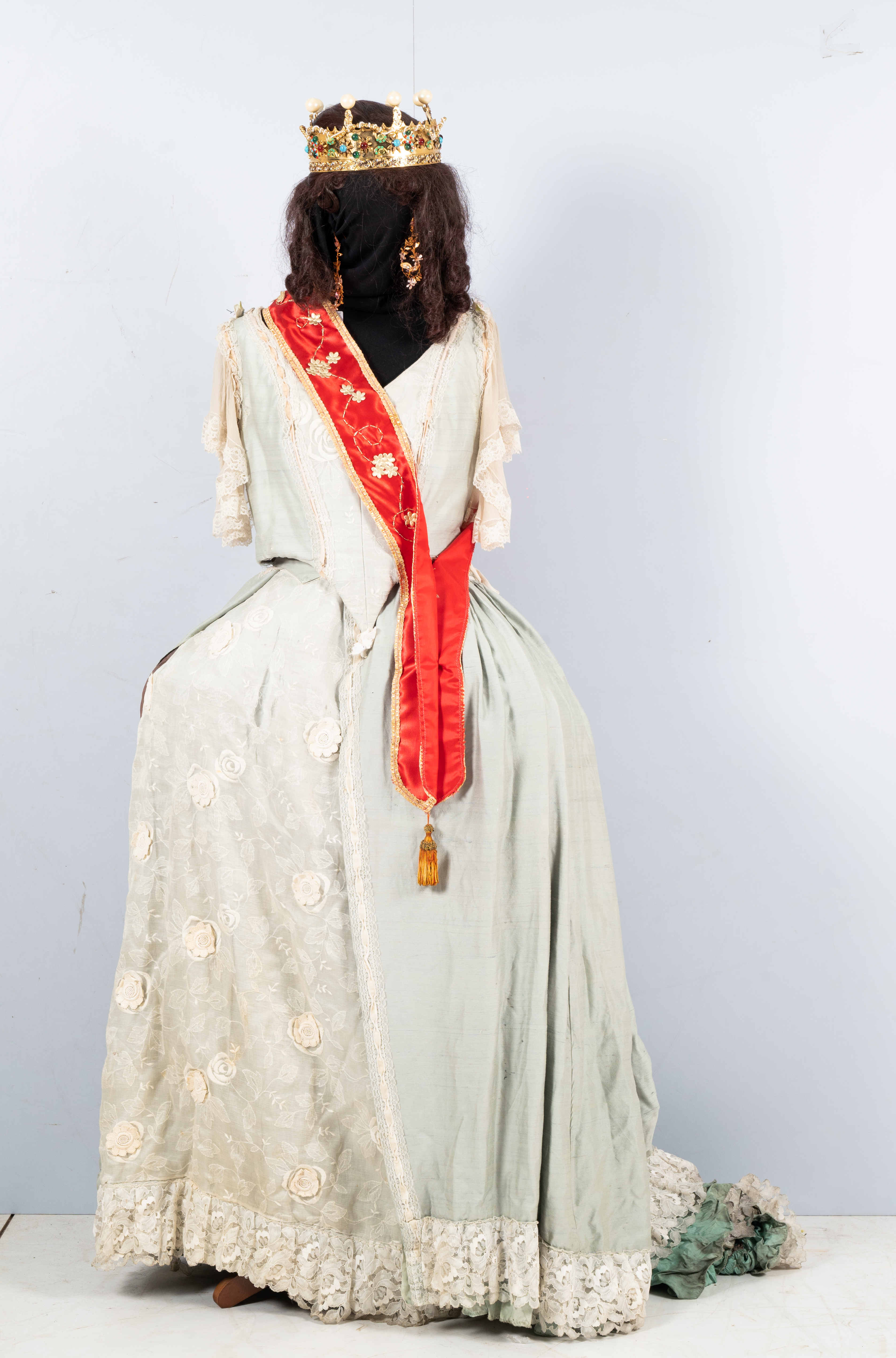 Abito teatrale da dama con manichino composto da corpetto e ampia gonna in tessuto celeste riccamente ricamato con fiori bianchi, manica in tessuto e trina, fascia rossa decorata con ricami dorati floreale, corredata di parrucca e corona in metallo dorato e pietre (usure e difetti).