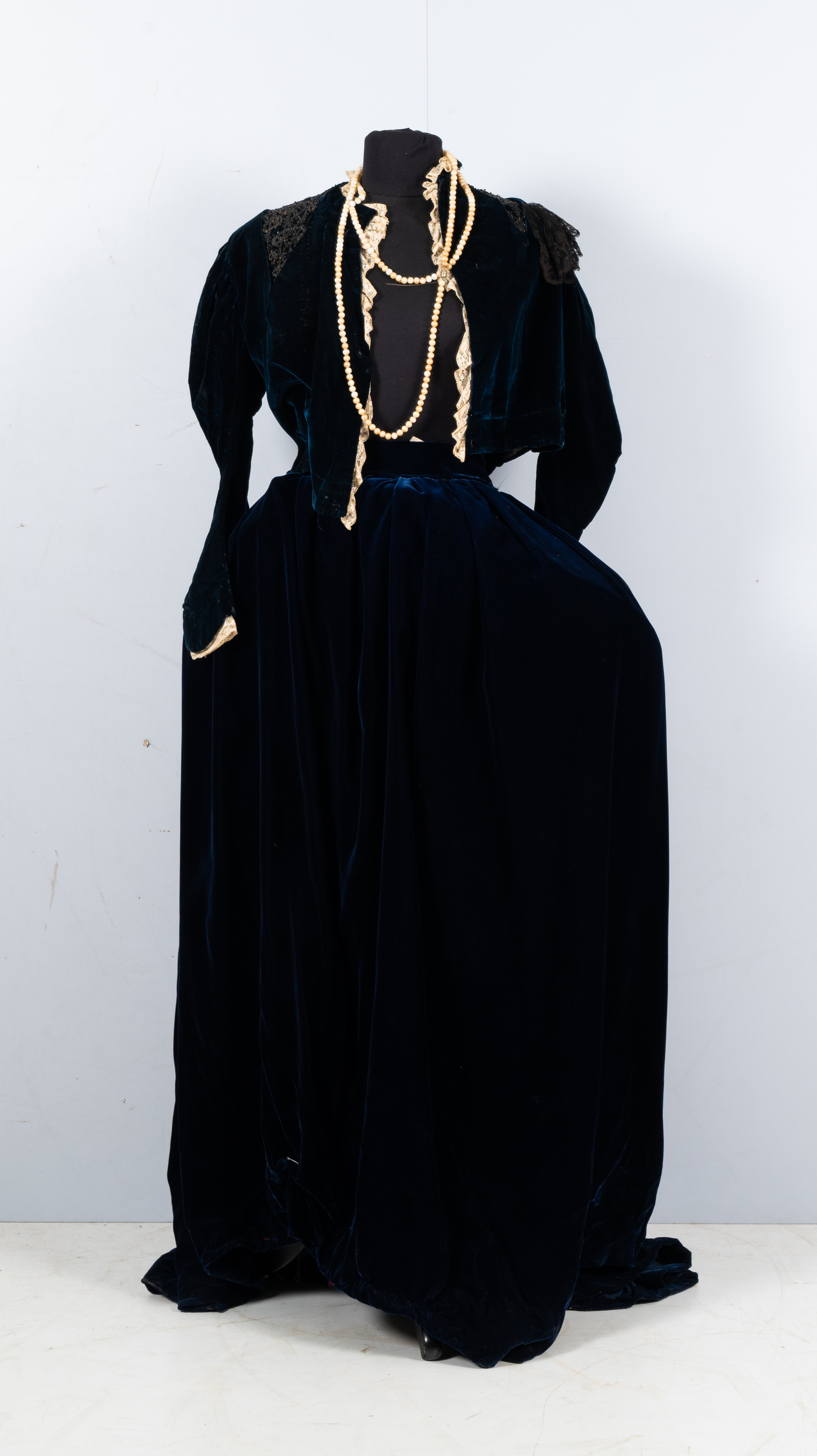 Abito teatrale da dama con manichino composto da un corpetto del XIX secolo in velluto blu bordato di trina e decorato sulle spalle da ricami in cristalli neri e tulle ricamato nero, gonna in velluto blu (usure e difetti).