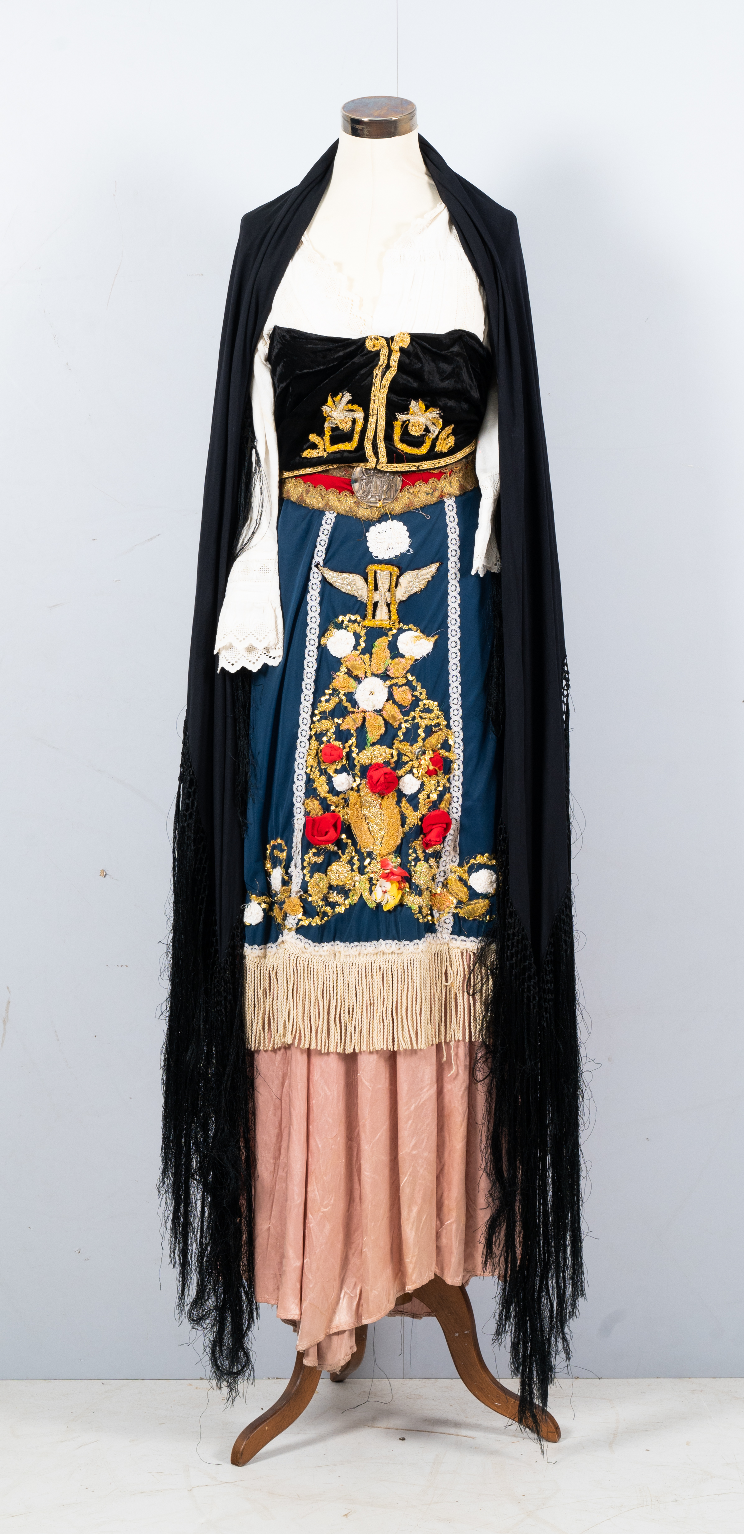 Abito teatrale etnico da donna composto da camicia bianca con ricami, fascia in velluto nera con decori in oro, gonna lunga rosa con balza blu riccamente ricamata con ricami in oro e fiori applicati, cintura in tessuto rosso e gallone dorato con medaglione in metallo argentato, sciallo nero in seta con frange (usure e difetti).