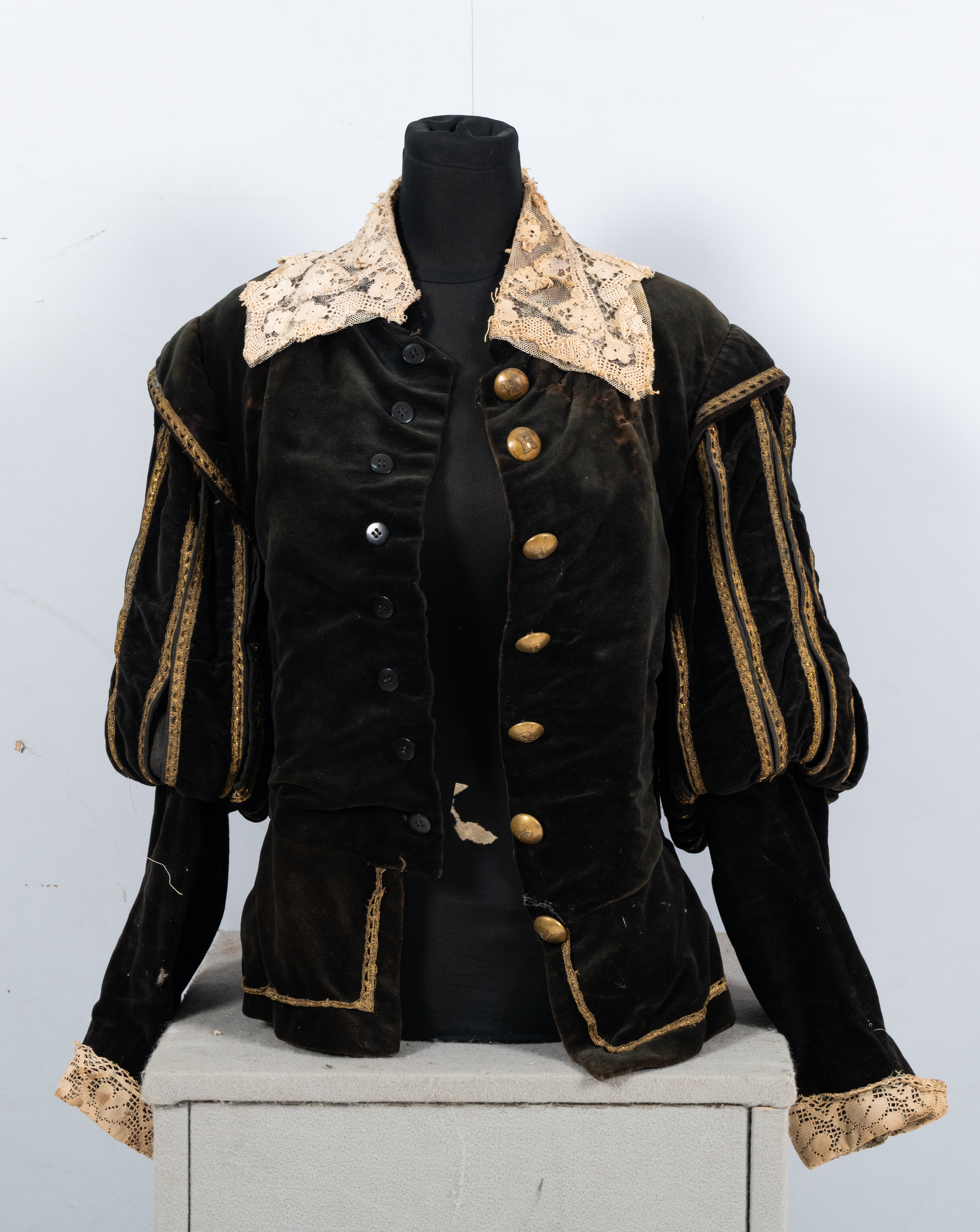 Giacca da teatro con mezzo busto in velluto nero, collo e polsi in trina, maniche a sbuffo decorate con passamaneria dorata, bottoni con monogramma (usure e difetti).