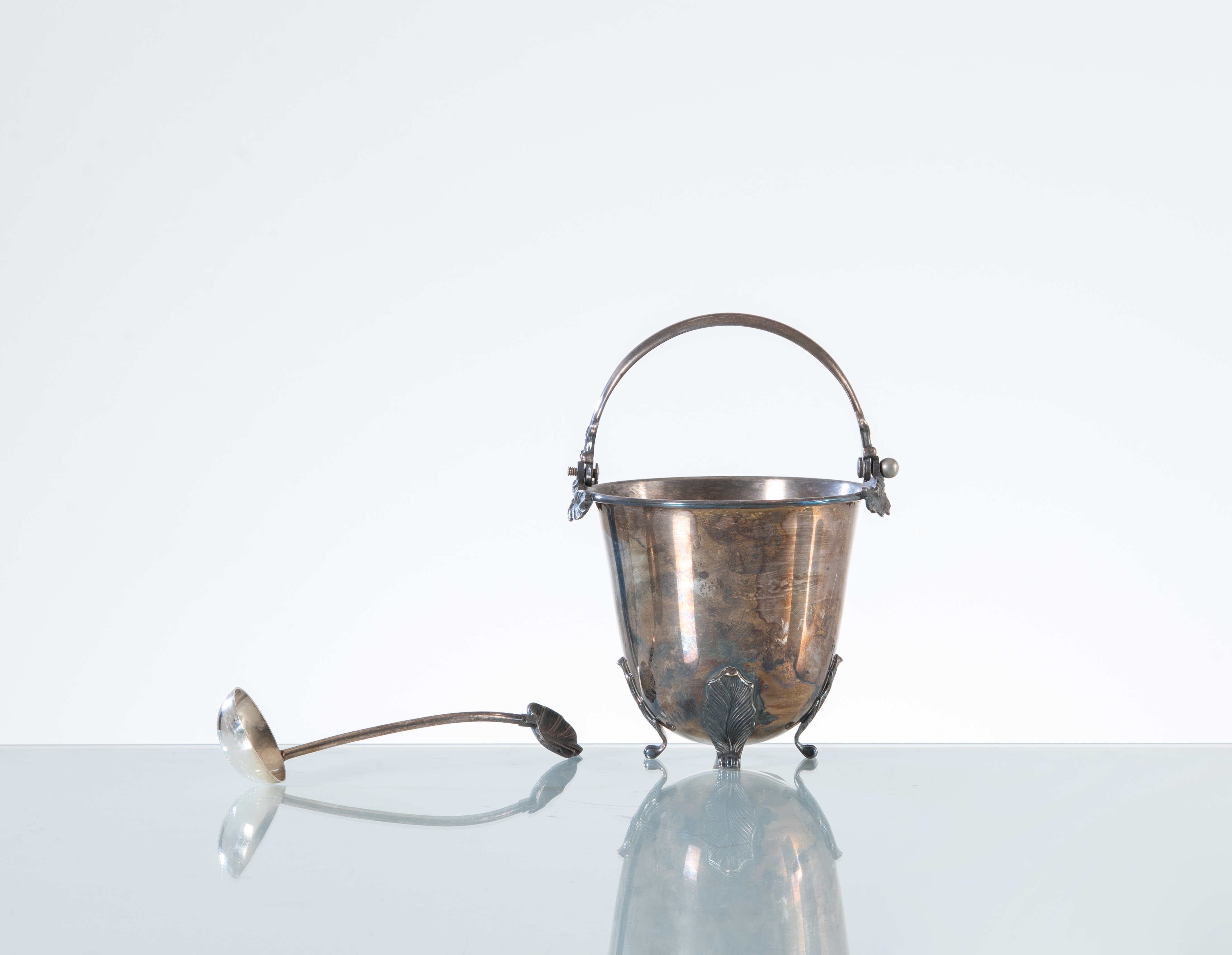 Un secchiello portaghiaccio in metallo argentato, corpo a goccia su quattro piedini ricurvi. Marchio di produzione incusso.