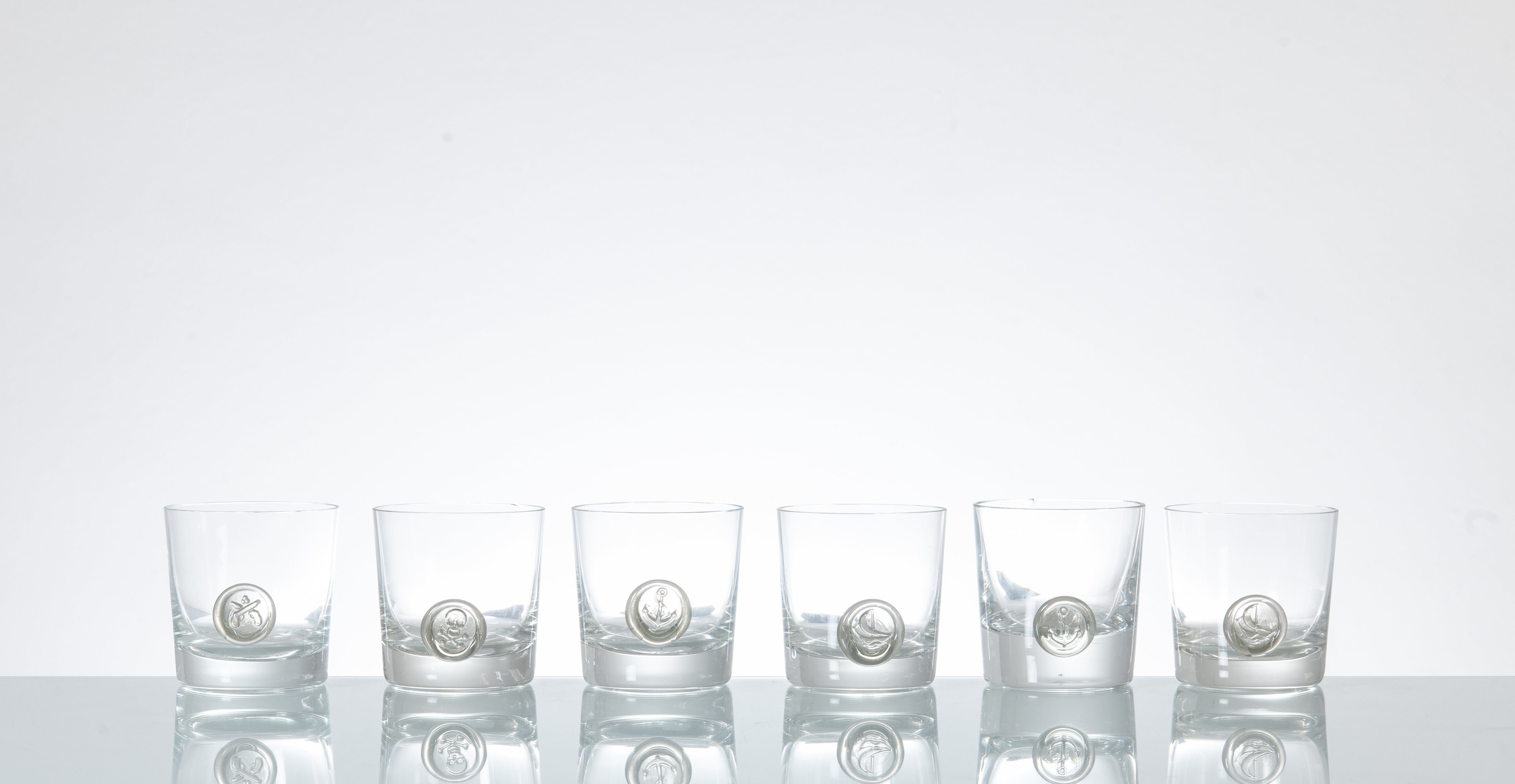 Sei bicchieri in cristallo incolore decorati con pastiglia circolare applicata a caldo con simboli marinari. Marchio all'acido.