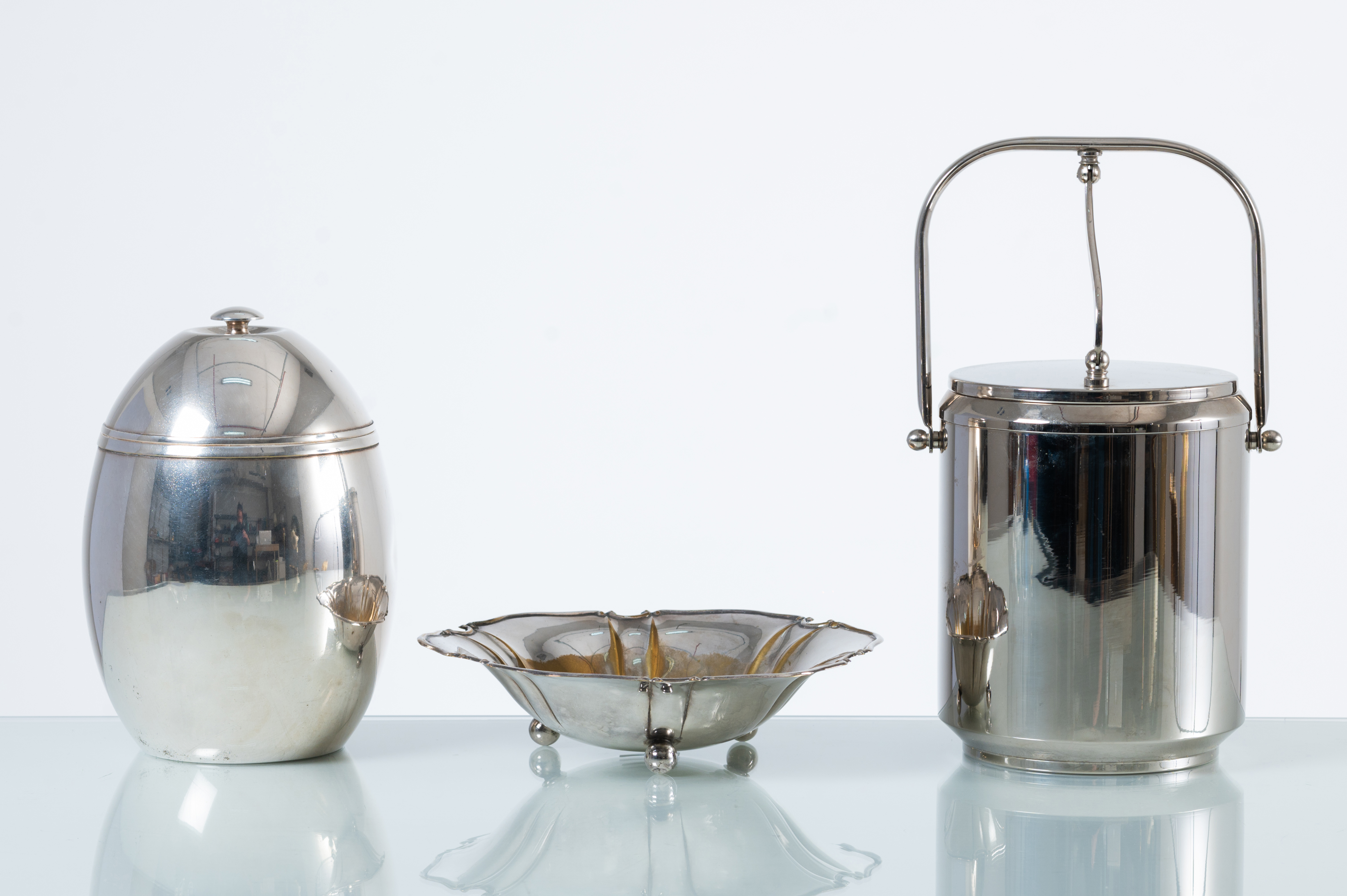 Due contenitori termici in metallo argentato e una ciotola con bordo mosso. Difetti alla placcatura della coppa. Marchio di produzione.