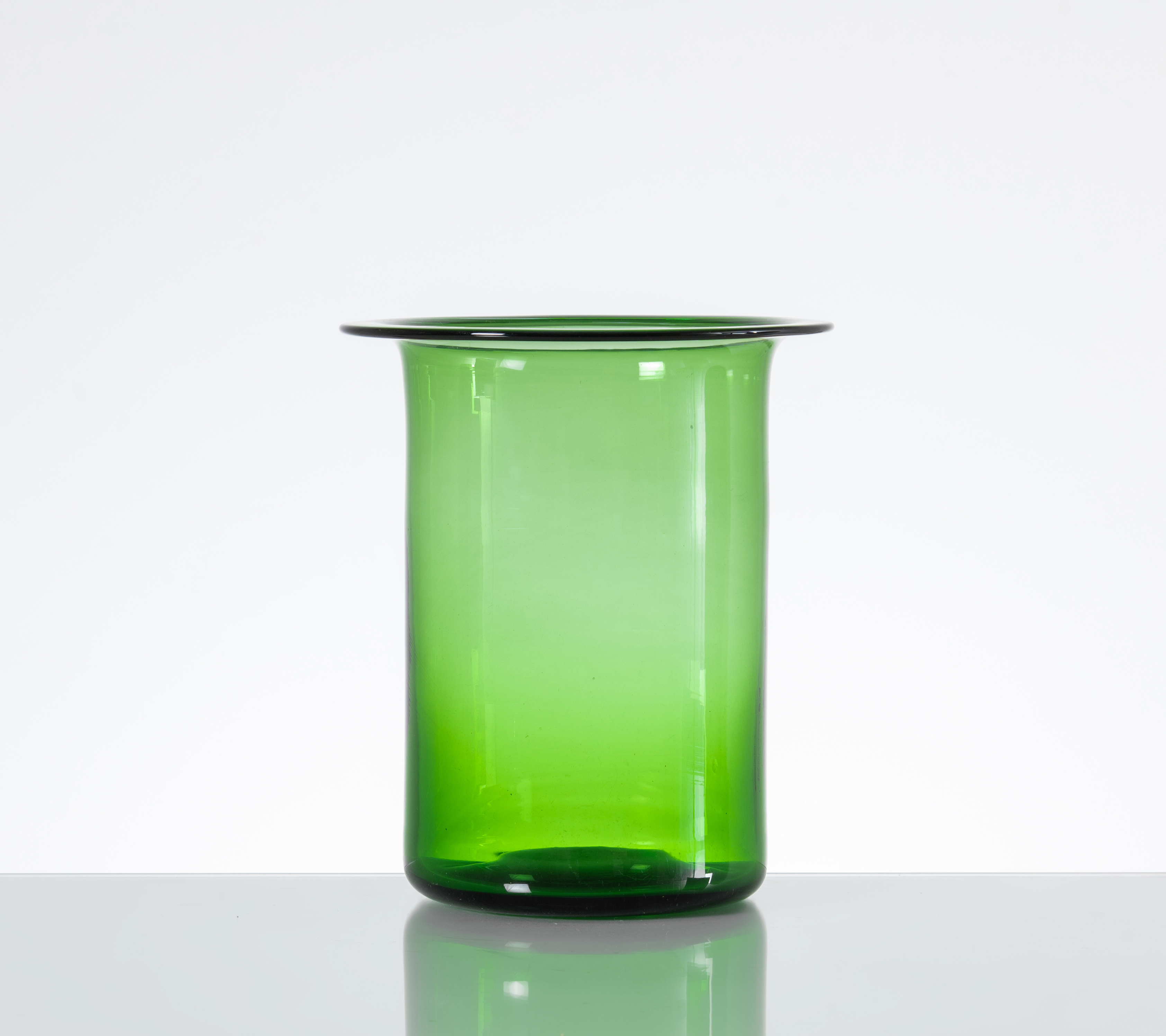 Vaso in vetro soffiato verde, corpo cilindrico con bocca schiacciata piana.