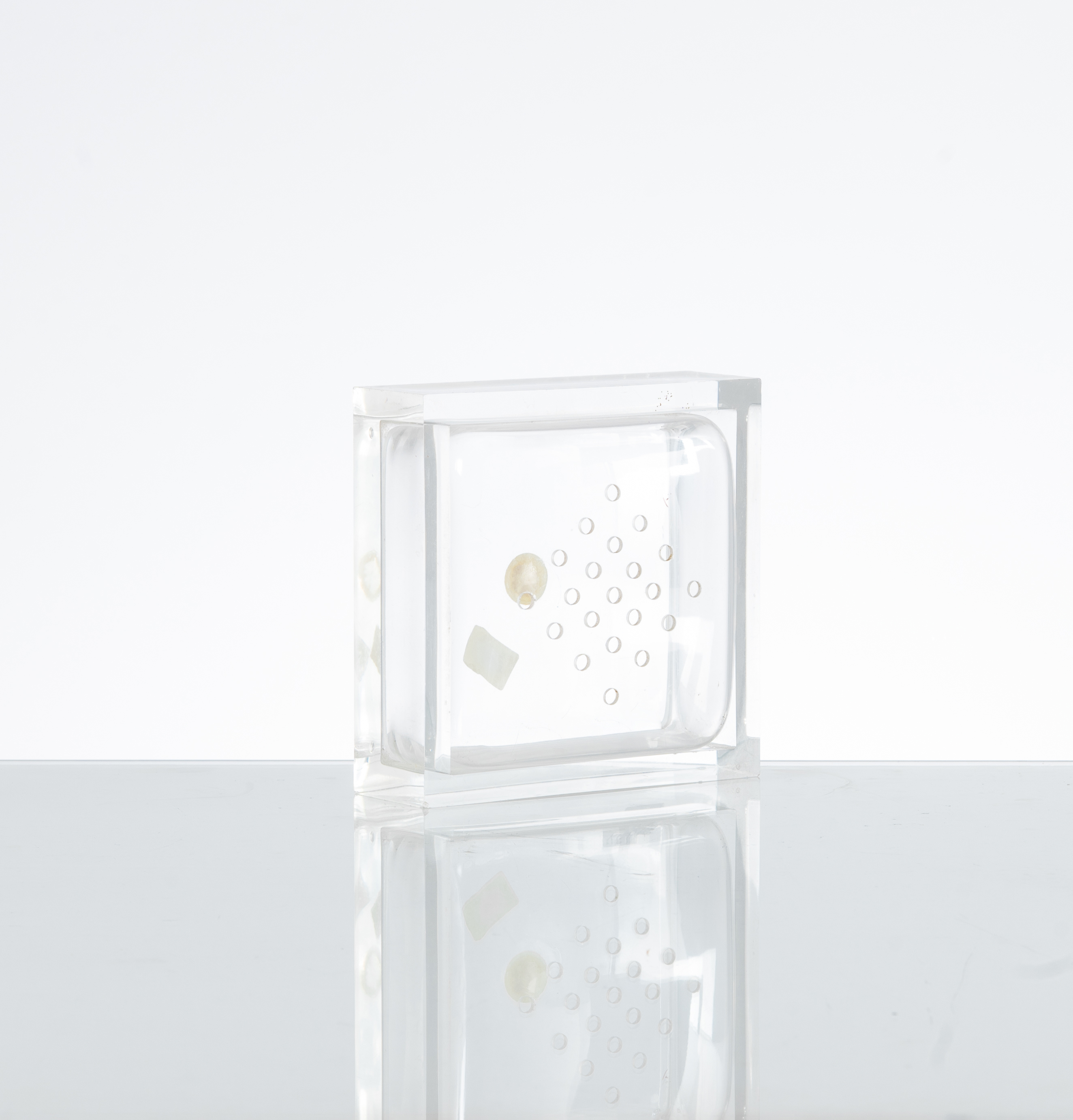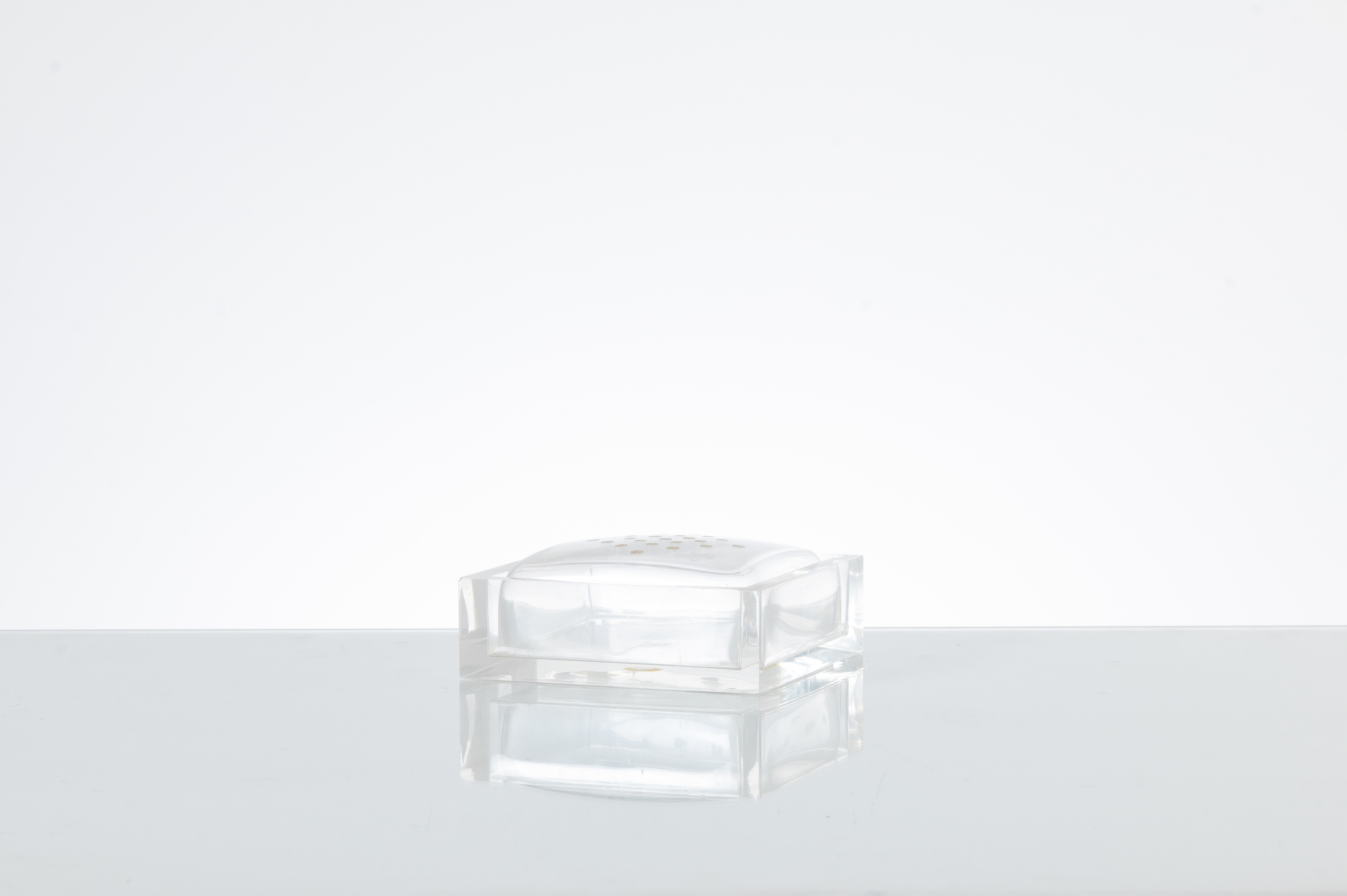 Scatola in plexiglass trasparente, piano quadrato con fori circolari. Lieve sbeccatura ad un angolo. Etichetta di produzione.