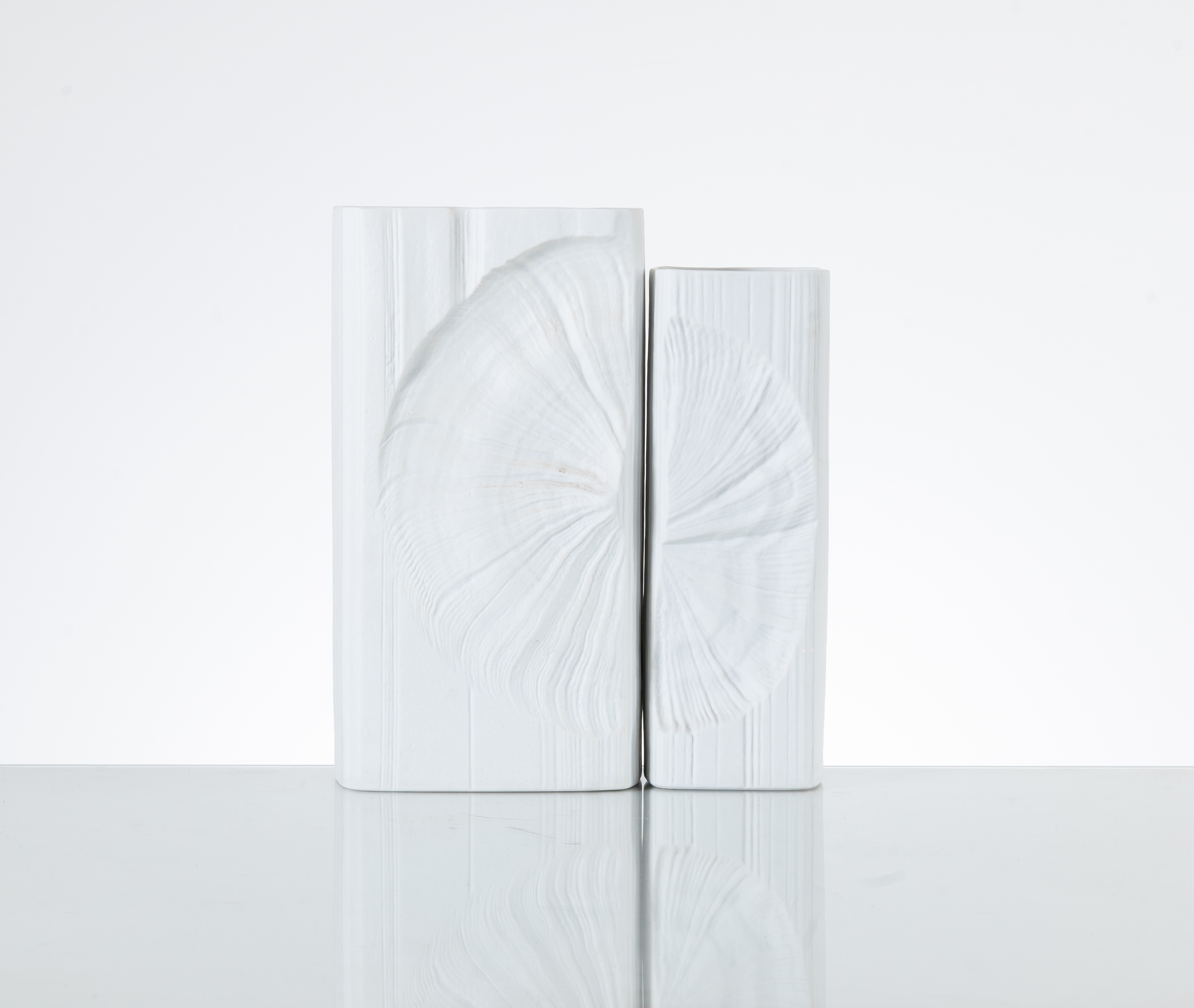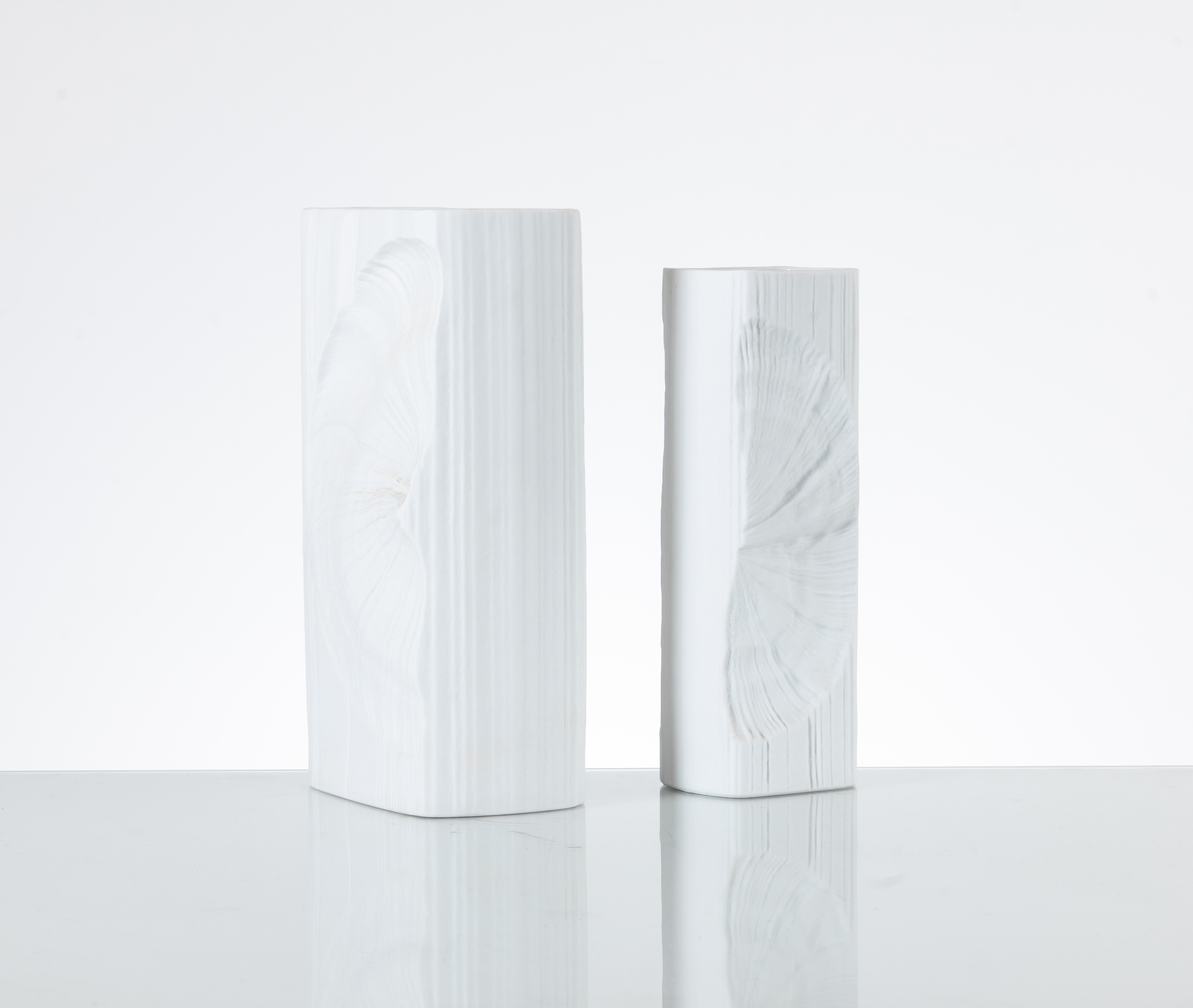 Due vasi della serie “Studio Line” in porcellana bianca a stampo corpo a parallelepipedo con decoro tridimensionale. Marchio di produzione.