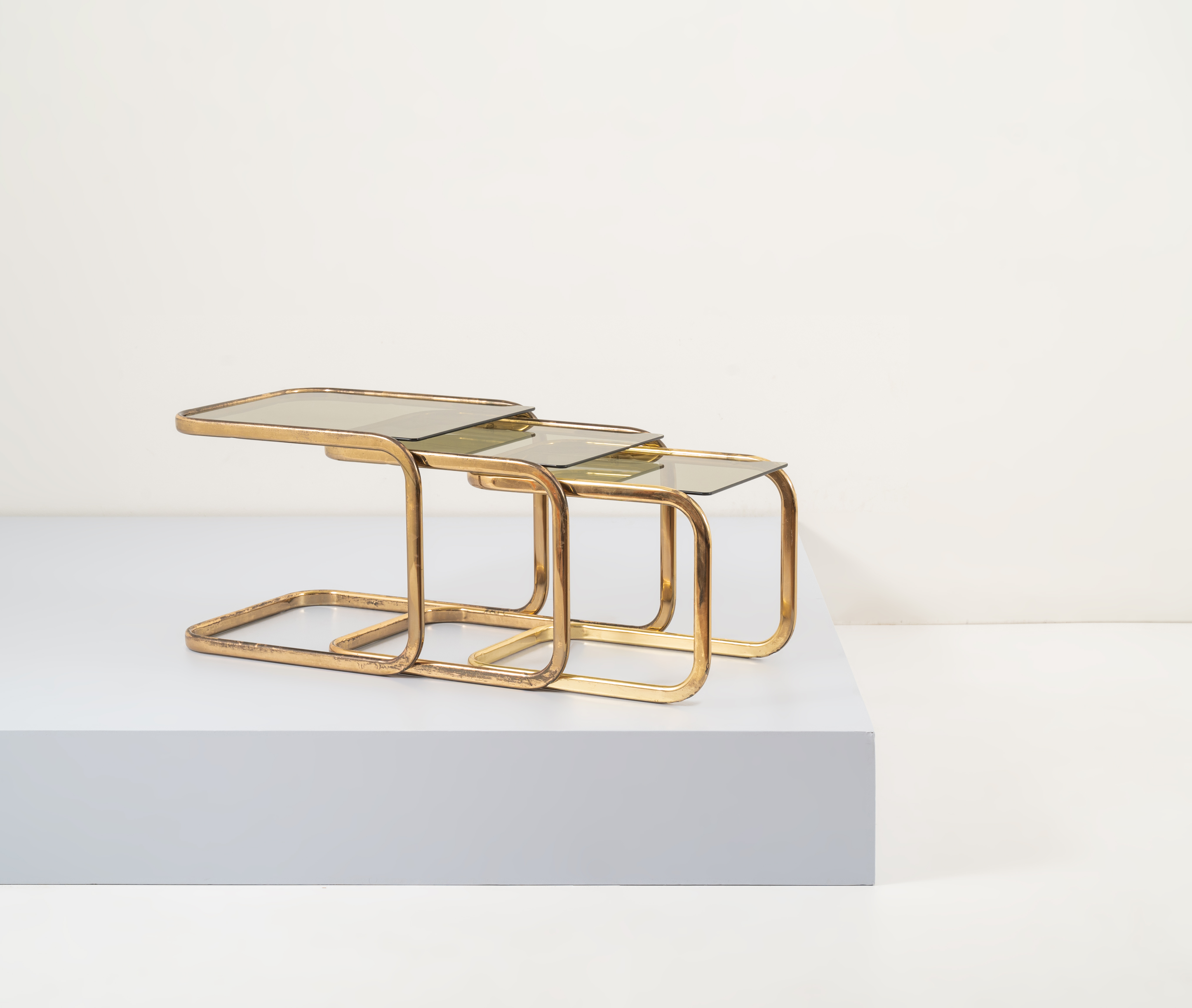 Tre tavoli impilabili da salotto con struttura in metallo dorato, fianchi curvati, piano rettangolare in vetro fumè. Segni di uso e graffi.