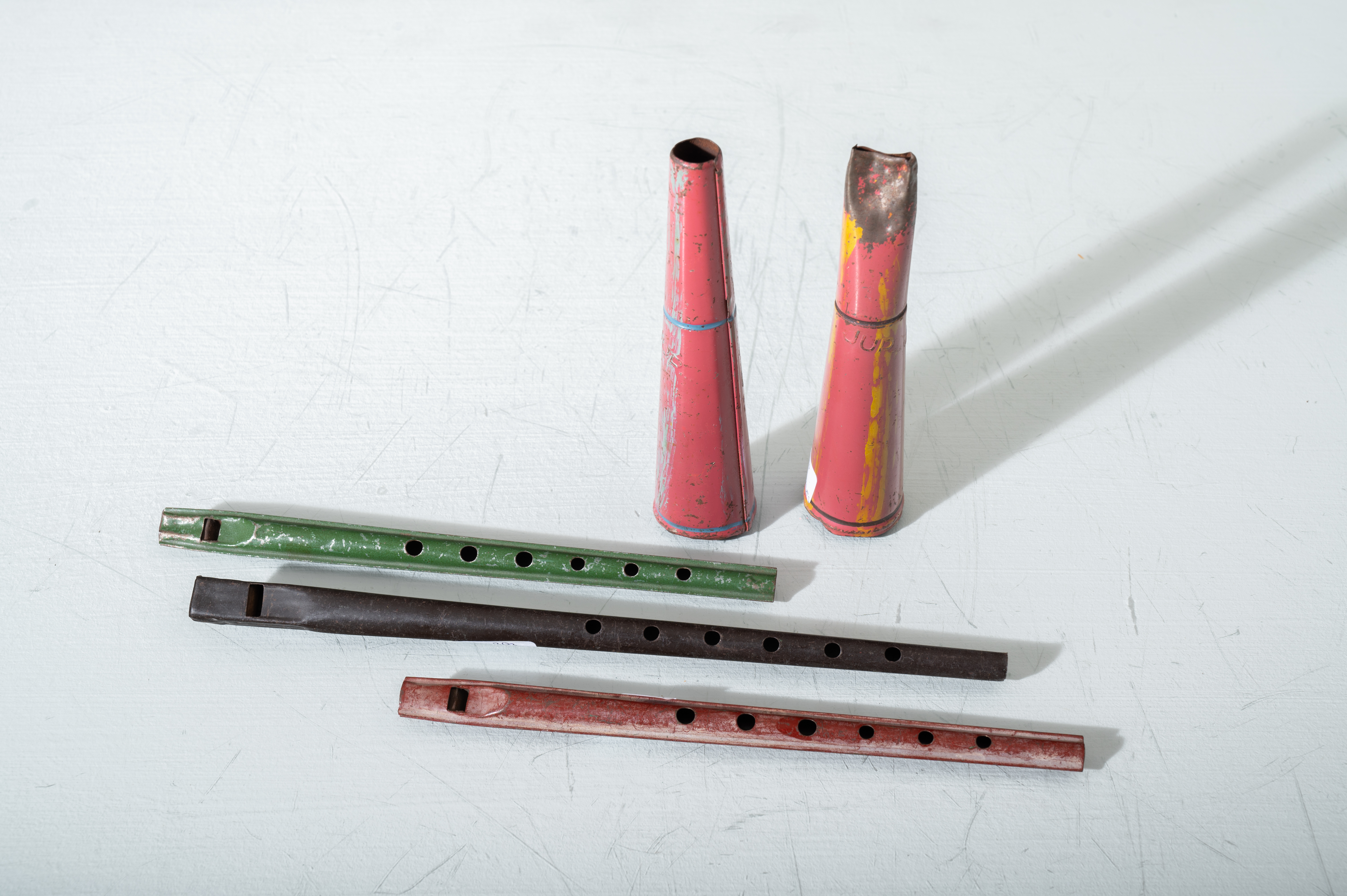 Tre piccoli flauti e due trombette in metallo (usure).