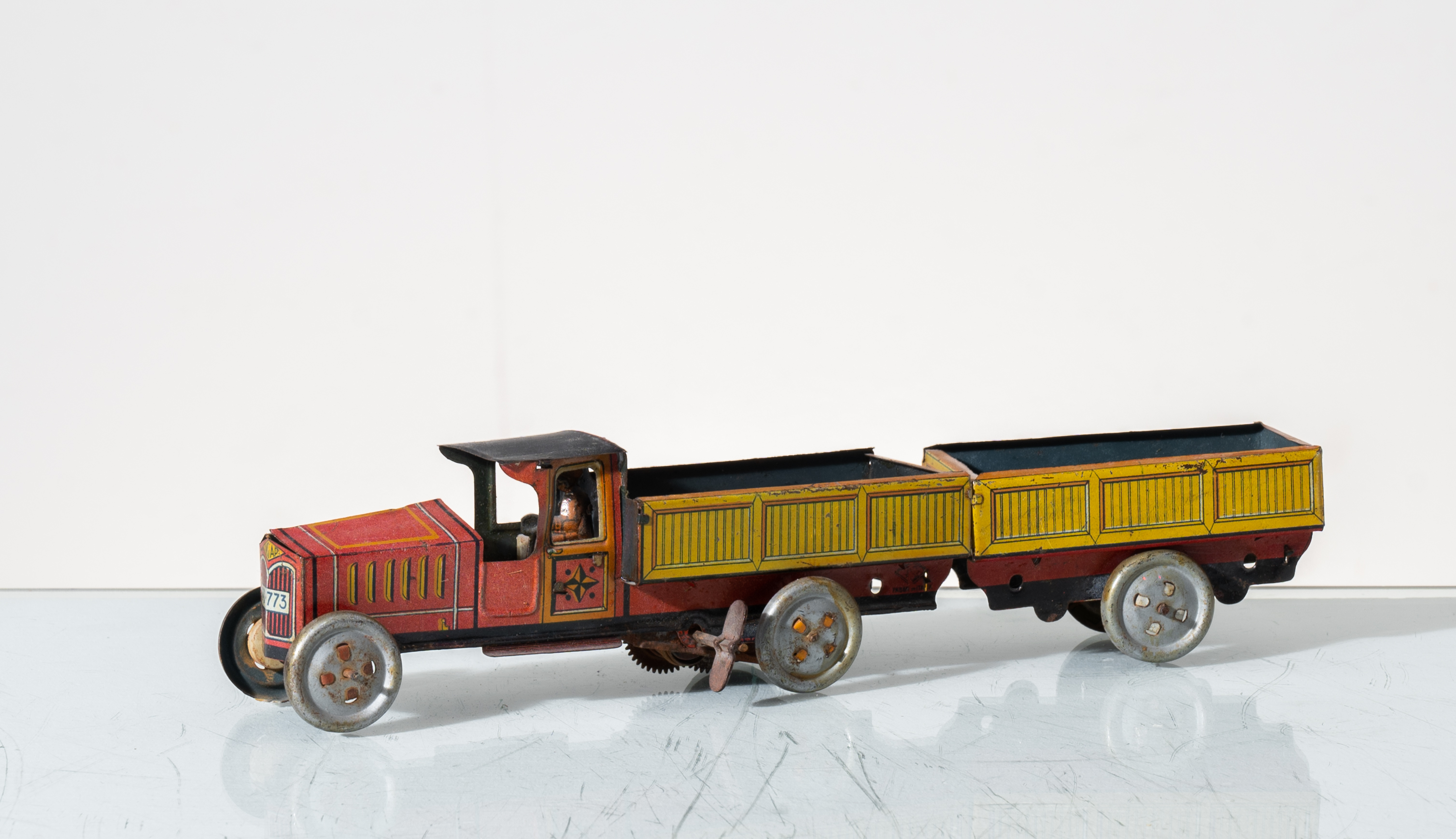 Camioncino con rimorchio giocattolo in latta con meccanismo a molla (usure).