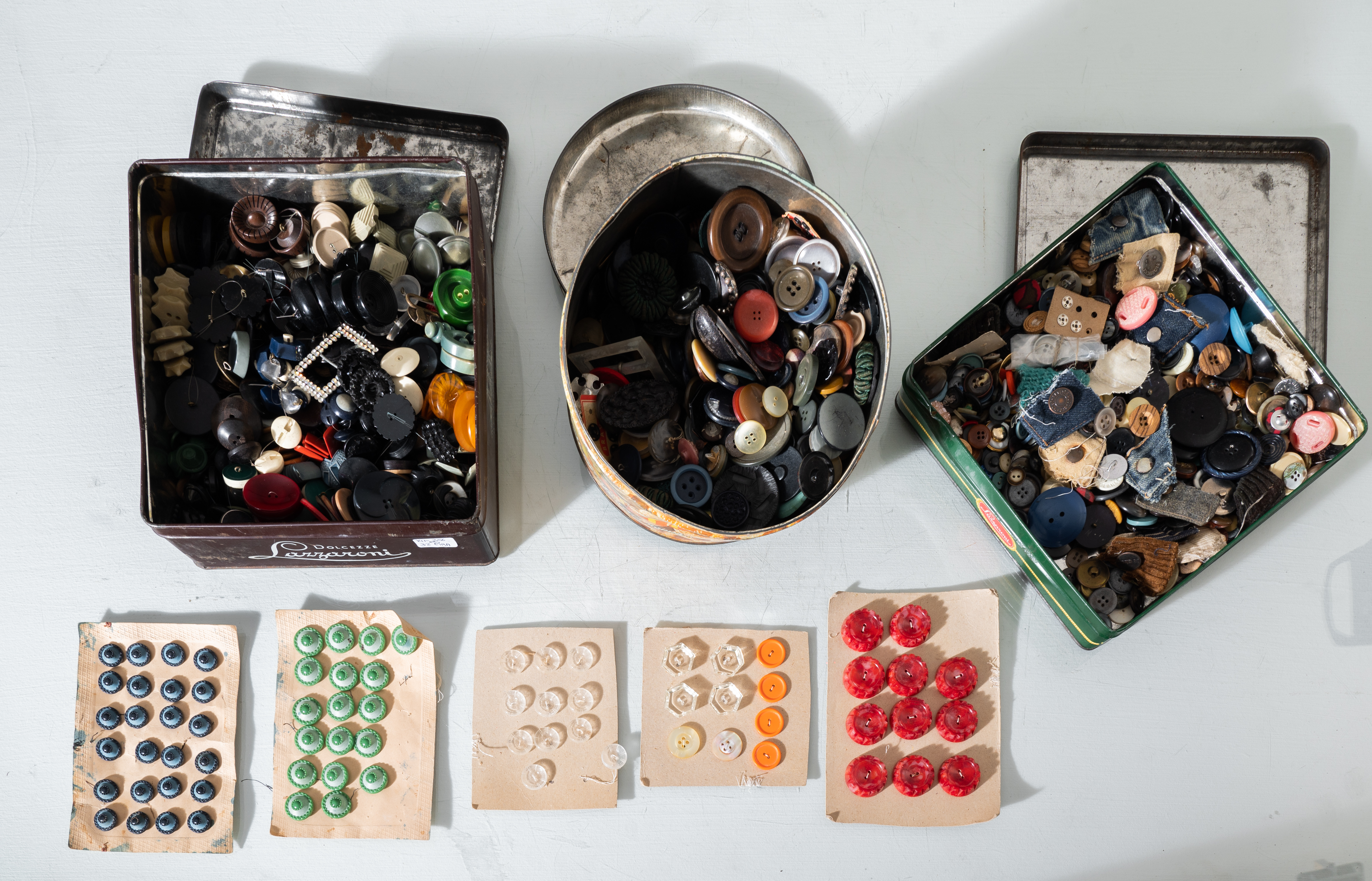 TRE SCATOLE d'epoca in latta contenti collezione di bottini d'epoca in materiale, forma e dimensioni differenti.