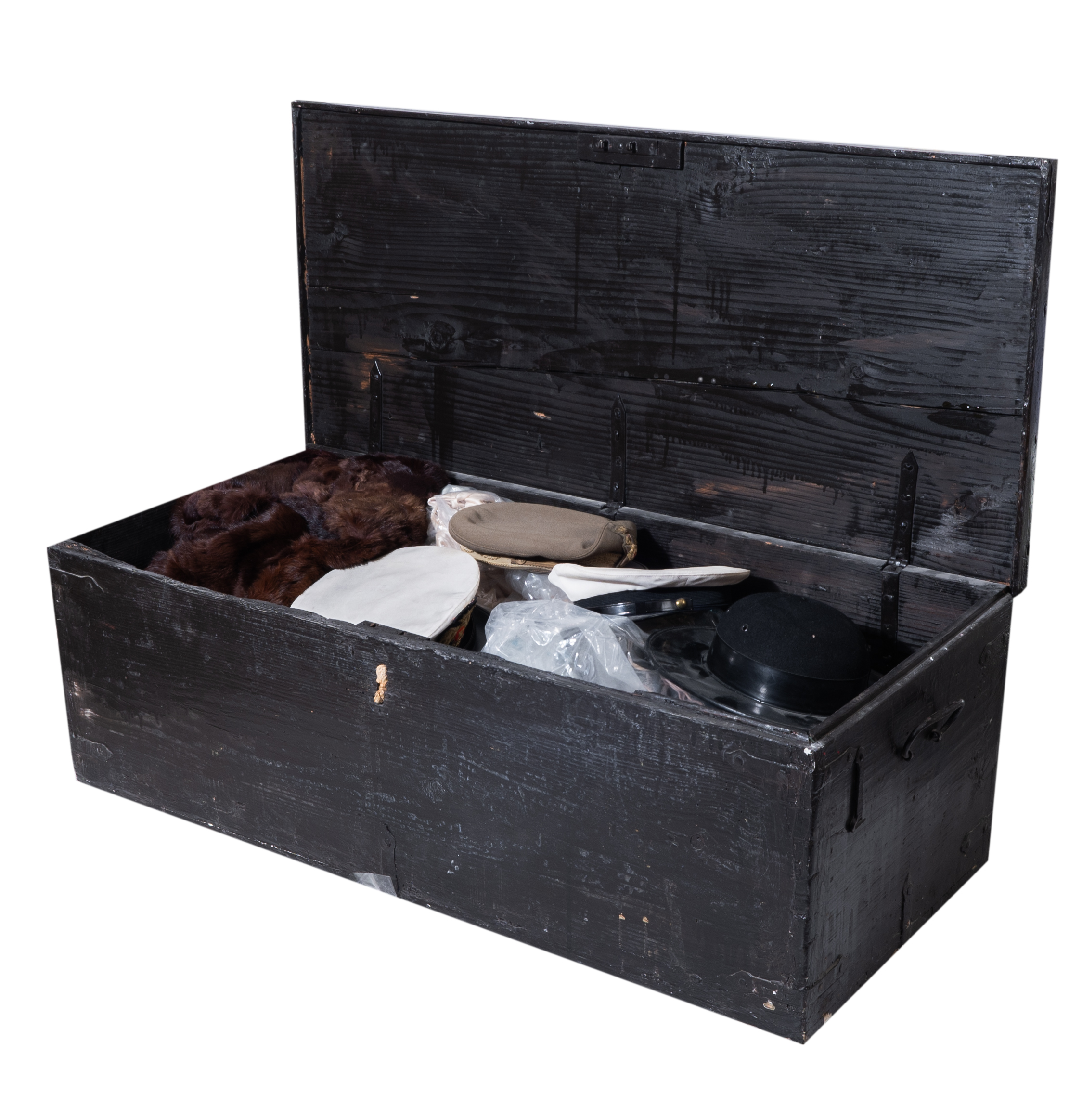 BAULE in legno contenente cinque ombrelli, sei grucce in legno, diciotto cappelli, un ventaglio, tre abiti, quattro lotti di accessori di abbigliamento, una divisa e cinque cappelli militari tutto di diversi materiali, fatture e colori (usure, difetti e mancanze).