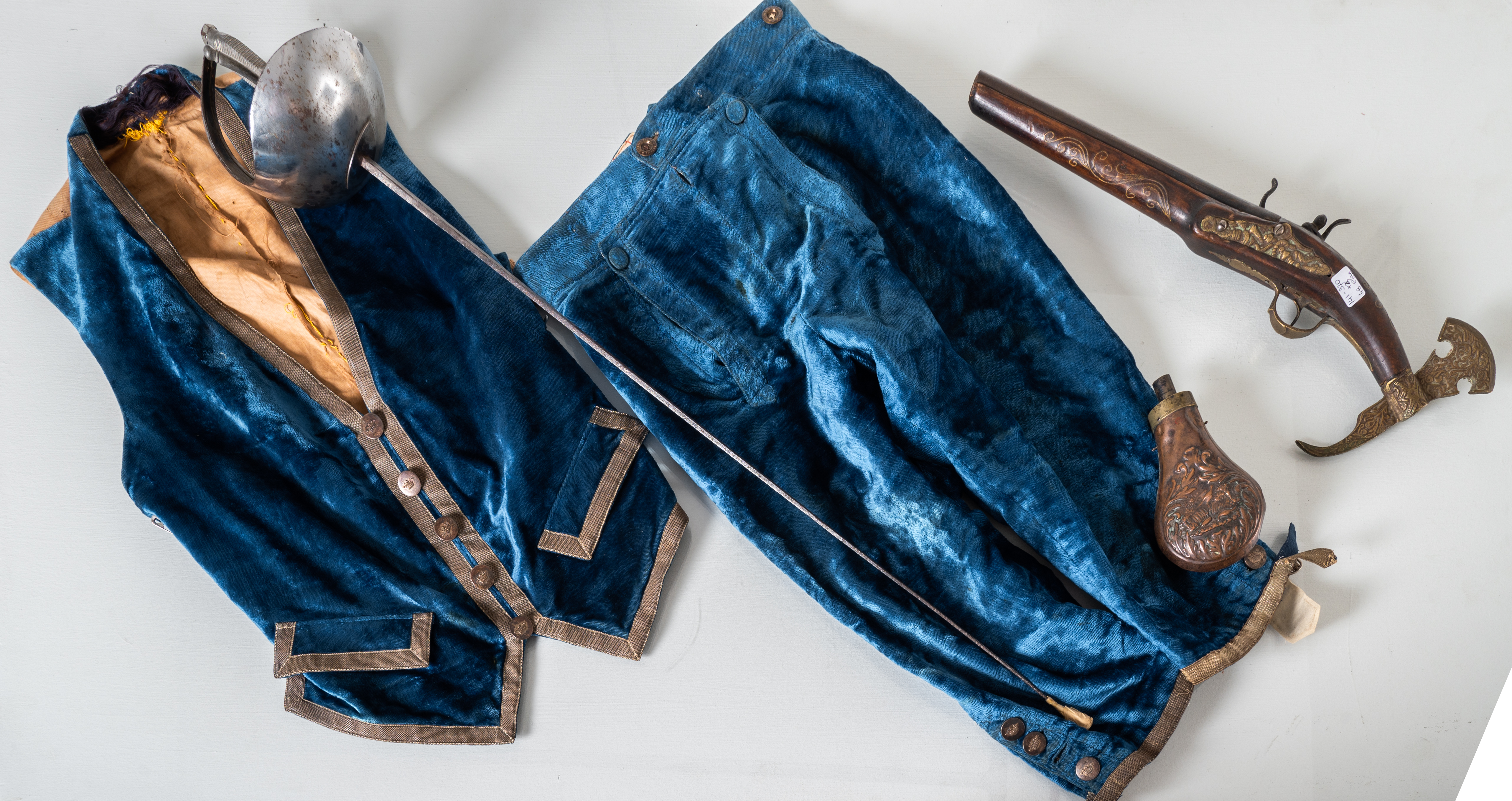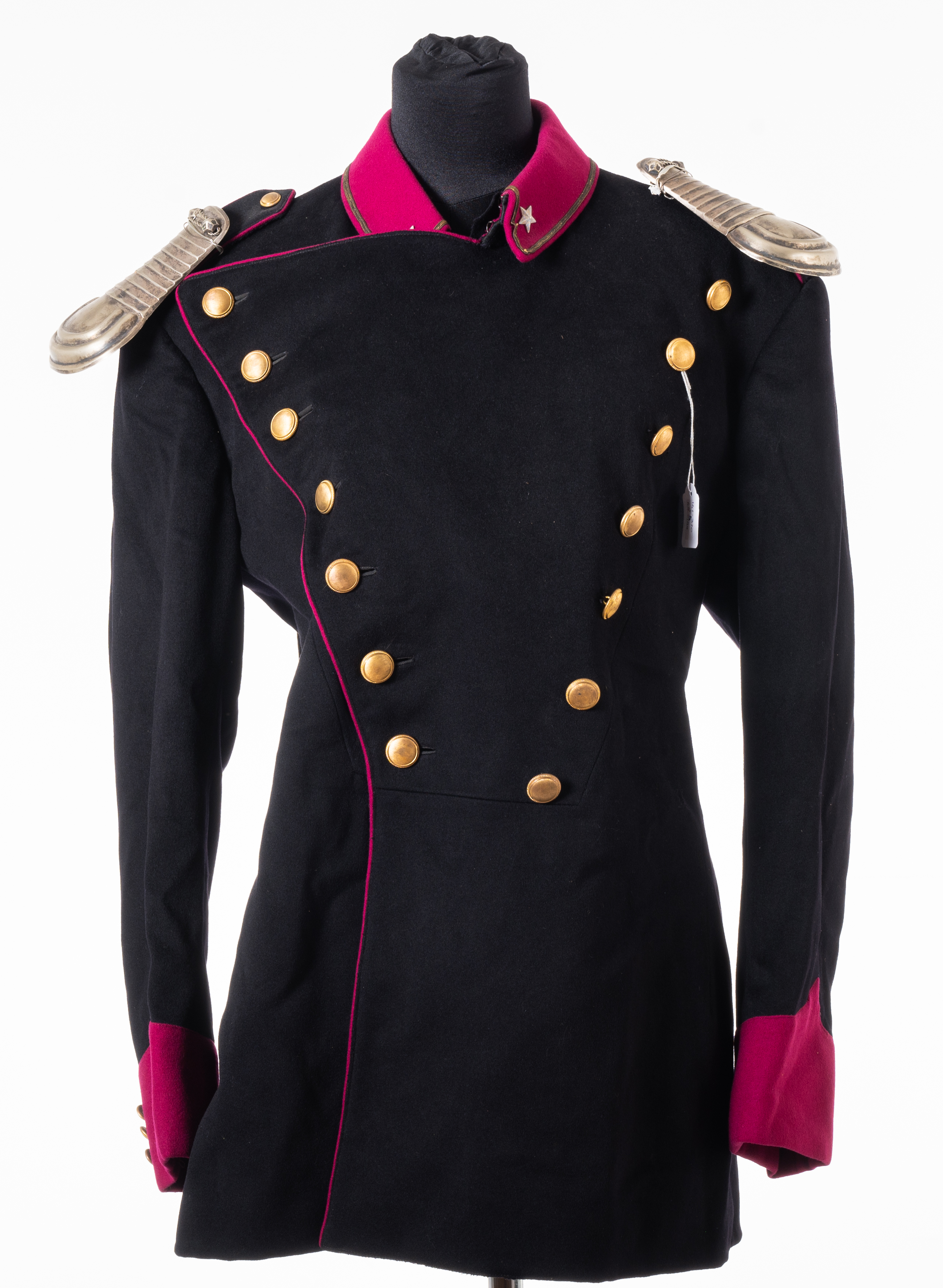 Divisa militare teatrale composta da giacca, calzoni e gilet in tessuto nero e blu, corredato da finte armi teatrali (usure, difetti e mancanze).