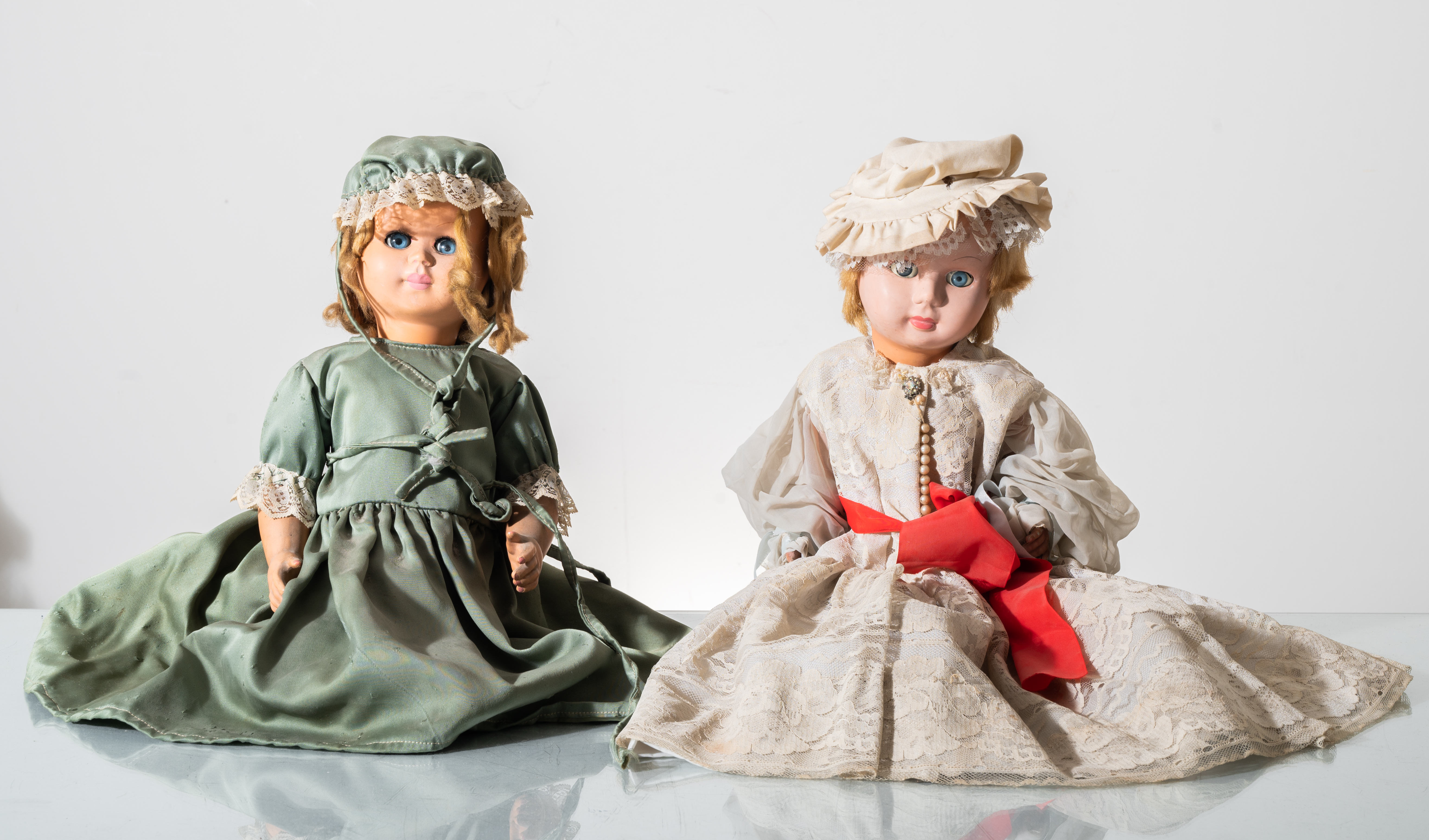 DUE BAMBOLE di cui una con abiti verdi ed una con abito in pizzo crema (usure e difetti).
