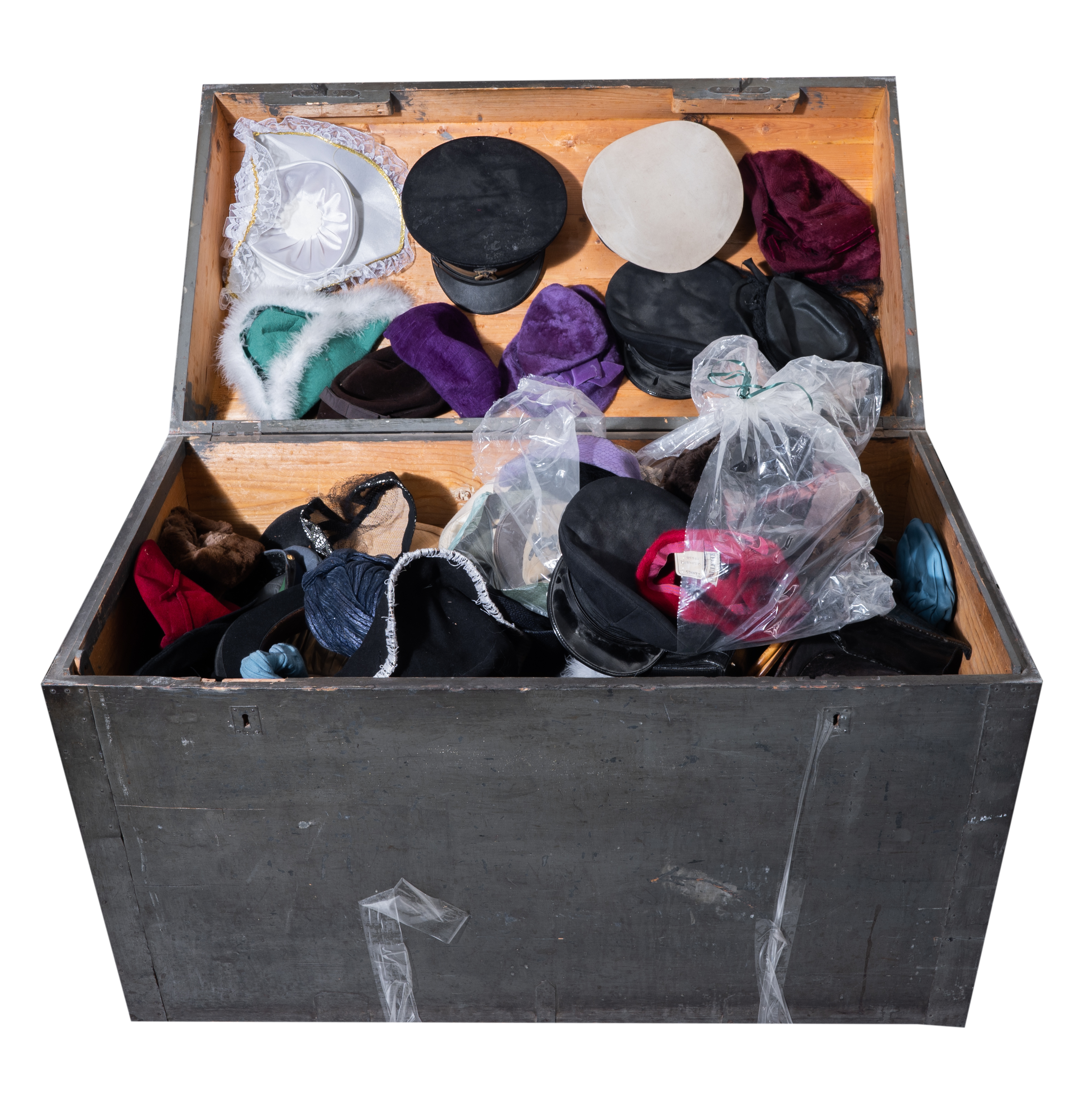 BAULE in legno contenente abiti ed accessori teatrali composti da ottanta cappelli, quattordici abiti e dieci borse di varie modelli, materiali e colori (usure, mancanze e difetti).