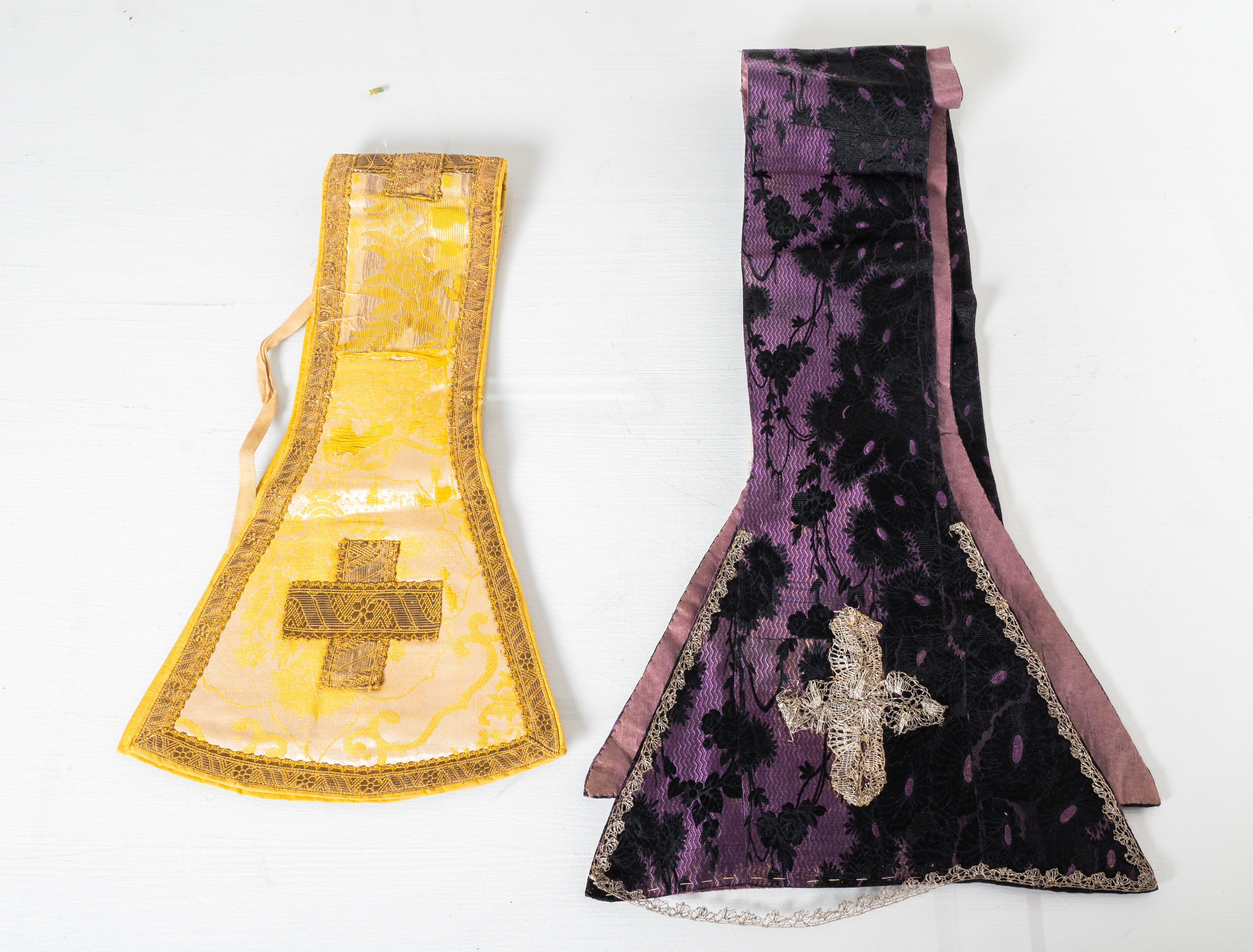 Cinque pianete del XIX secolo e due stole in tessuto e colori differenti (usure, difetti, mancanze).
