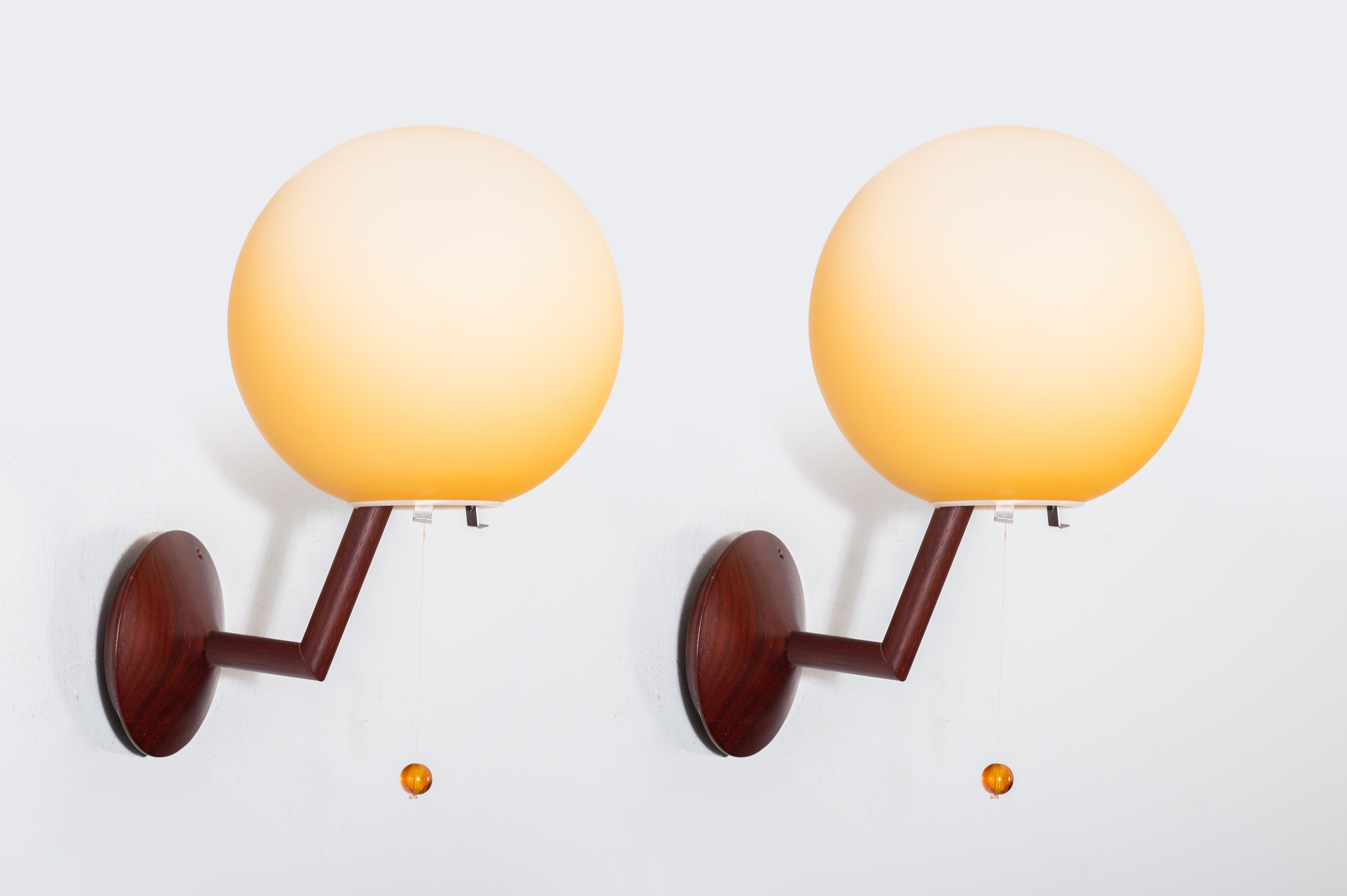 Coppia di lampade da parete ad una luce, struttura in legno, diffusore in vetro opalino arancione.