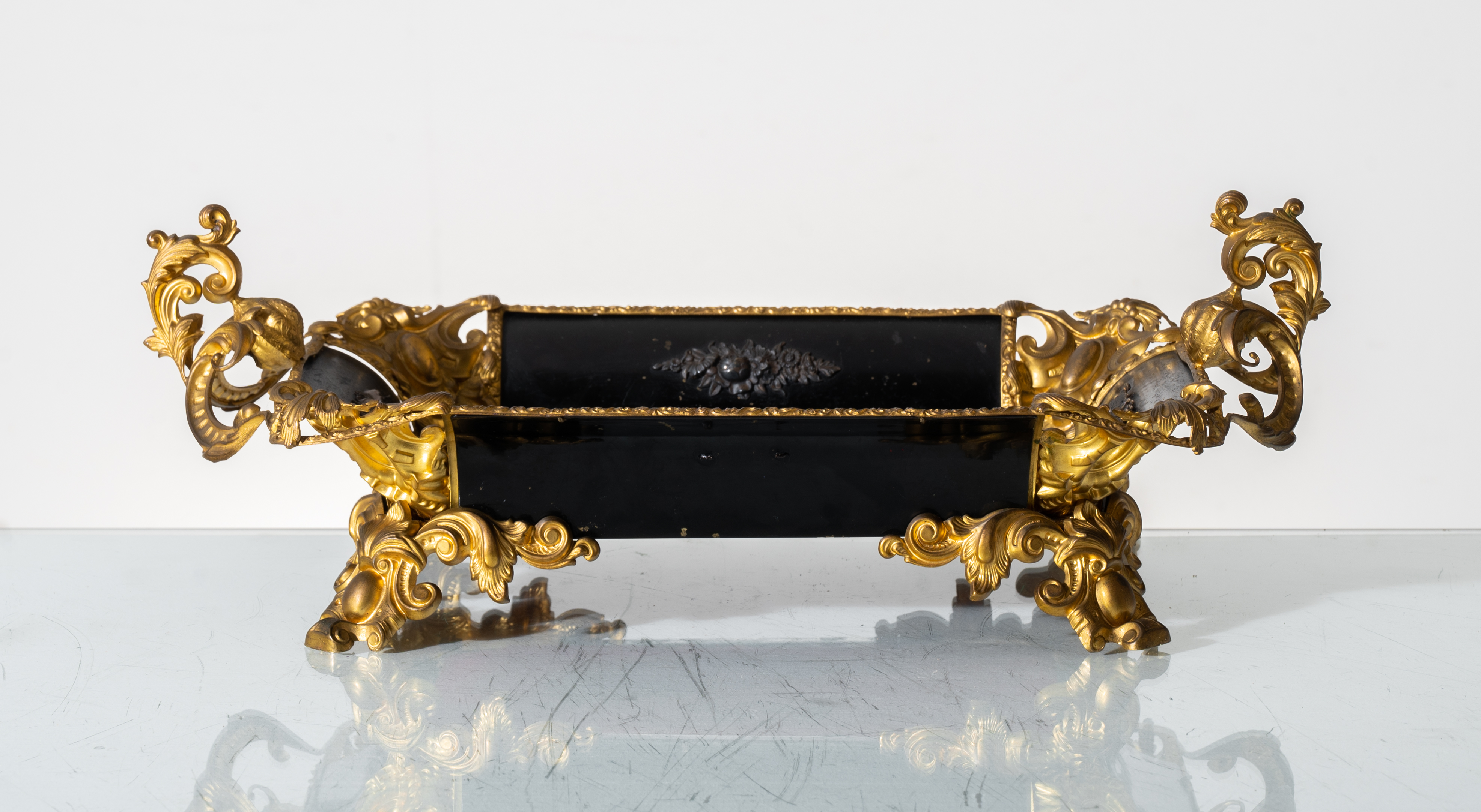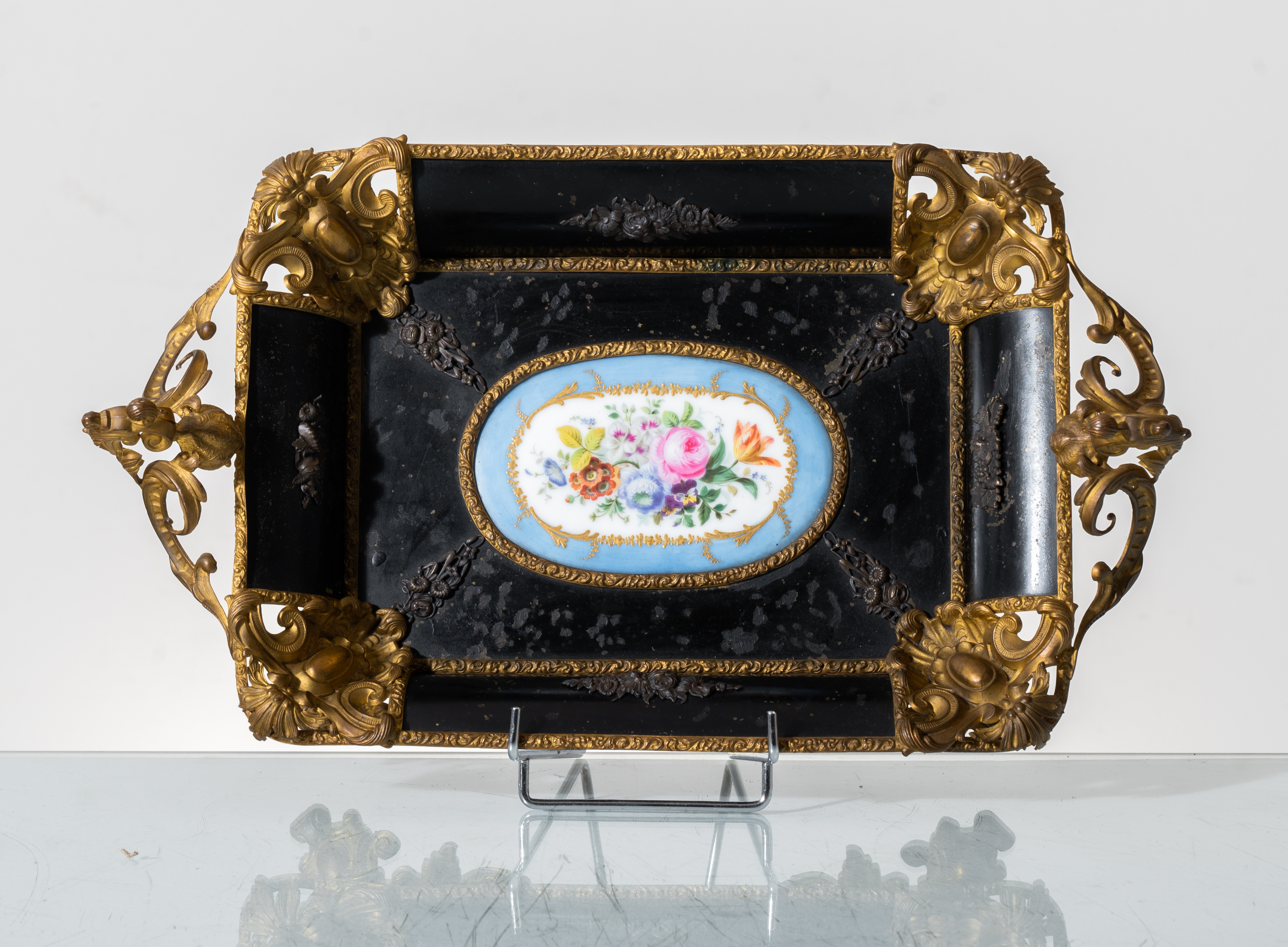 Centrotavola in metallo brunito e dorato, con placca in porcellana di Sèvres alla base.