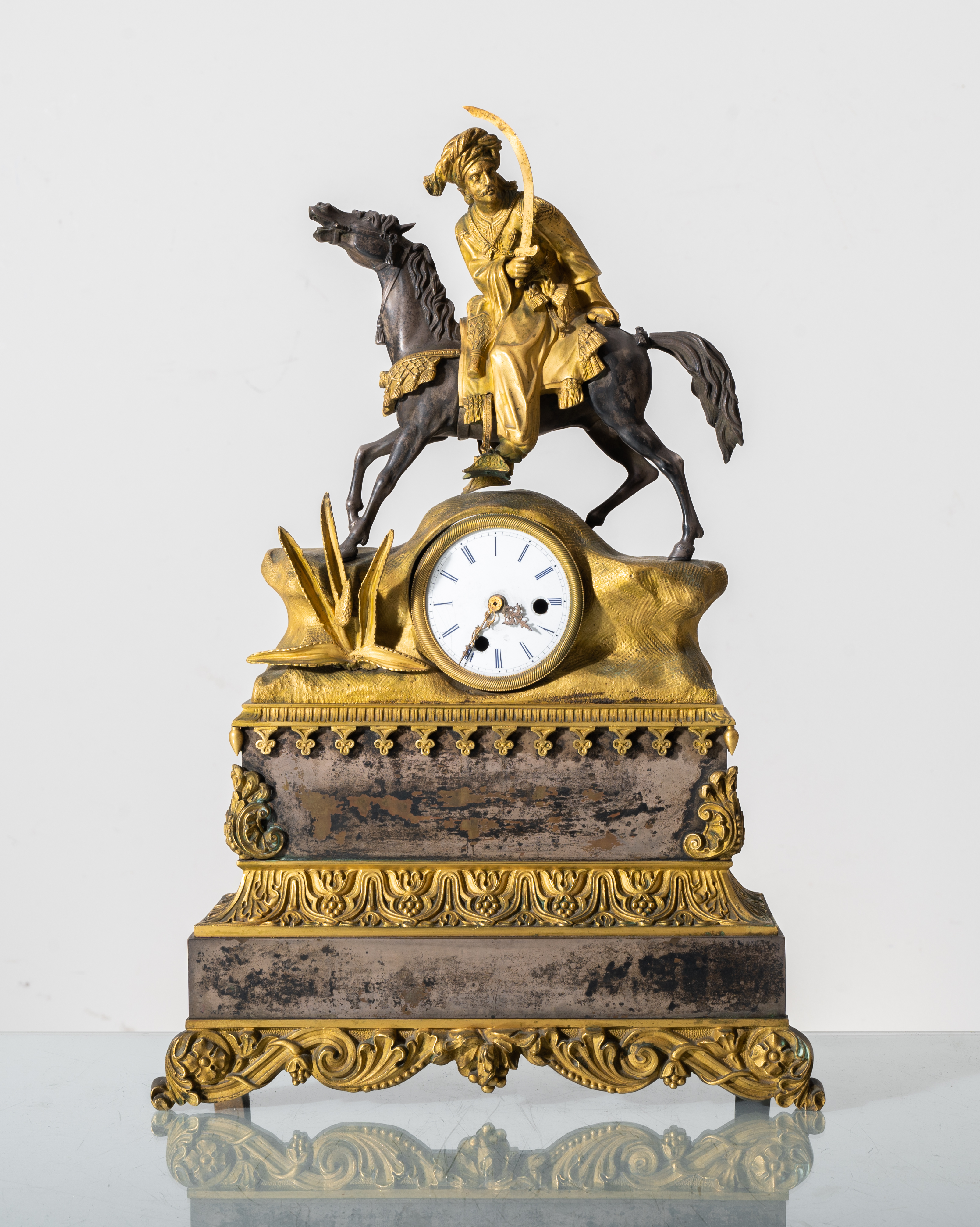 Orologio in metallo dorato con scultura raffigurante "Guerriero" (mancanze).