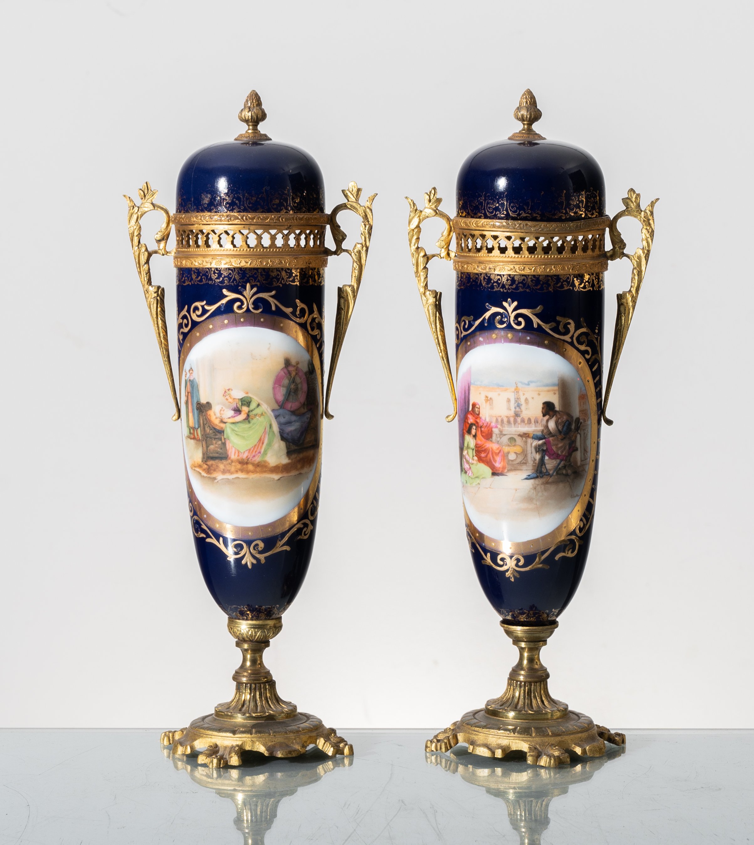 Coppia di potiche in bronzo e porcellana dipinta nei toni del blu, decorati con medaglioni dipinti raffiguranti "Scene tratte da Shakespeare", lumeggiature in oro (restauro).
