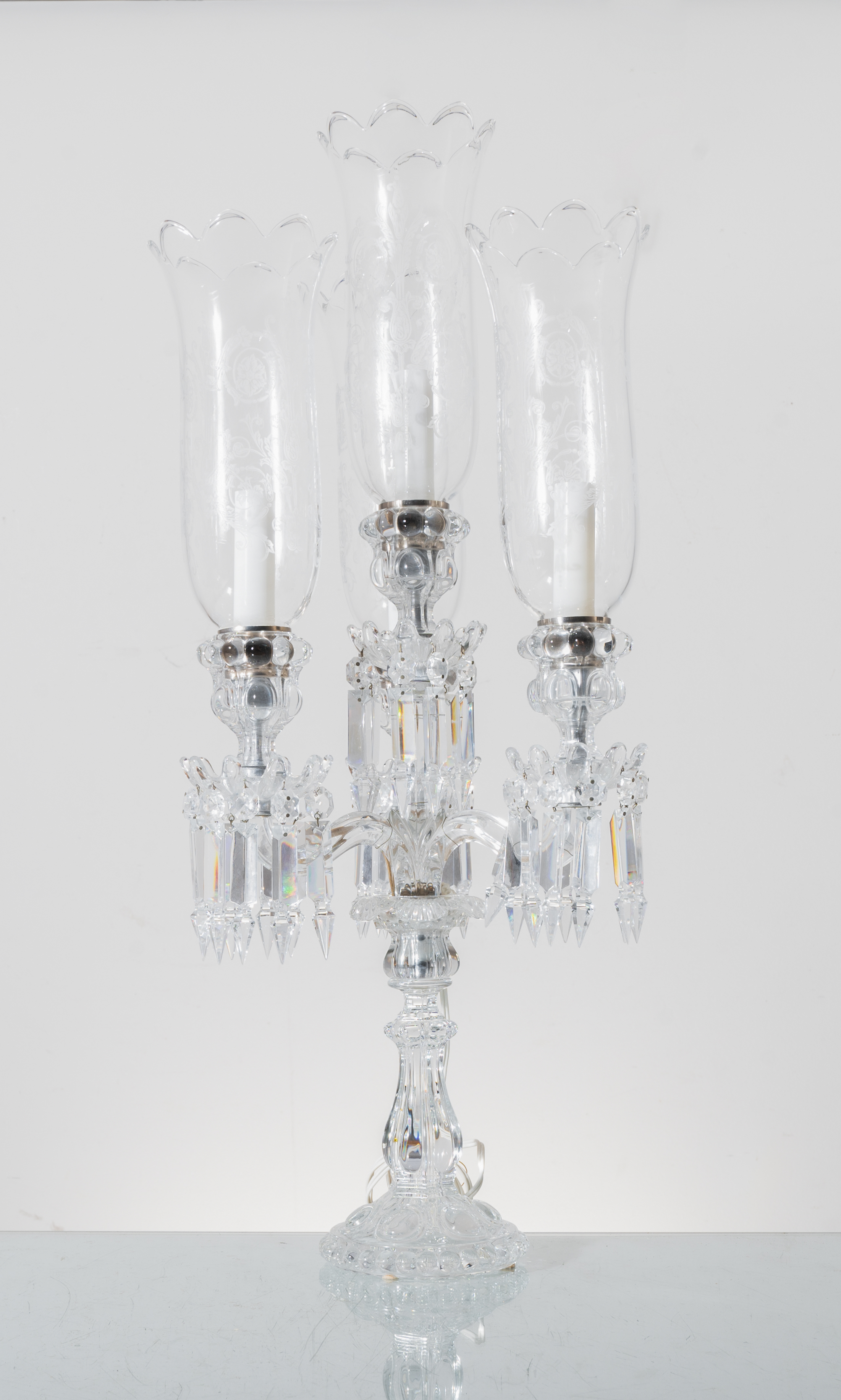 Candelabro in cristallo a quattro fiamme, bocce incise (elettrificato) (lievi usure nei pendenti ed una rottura).
