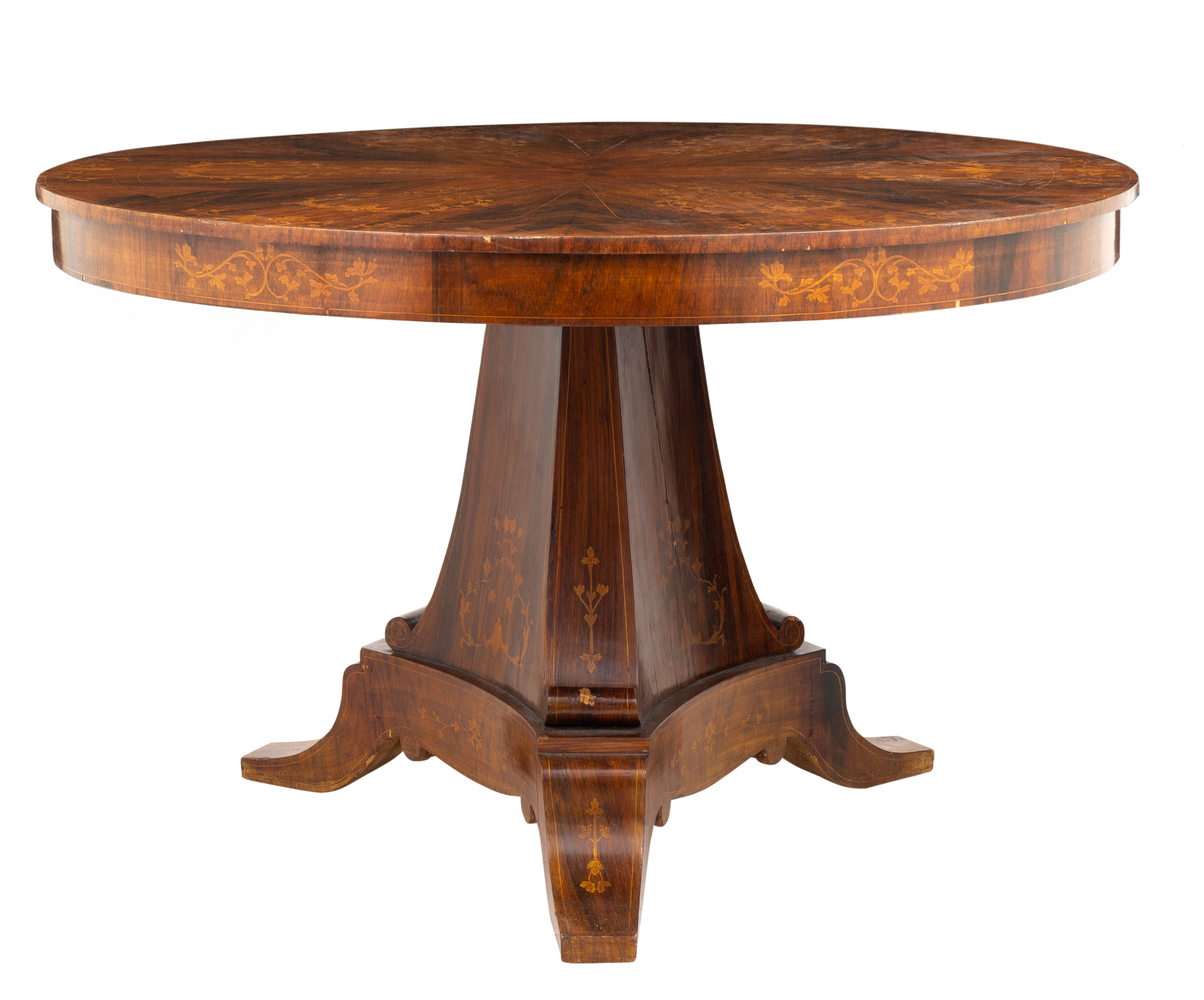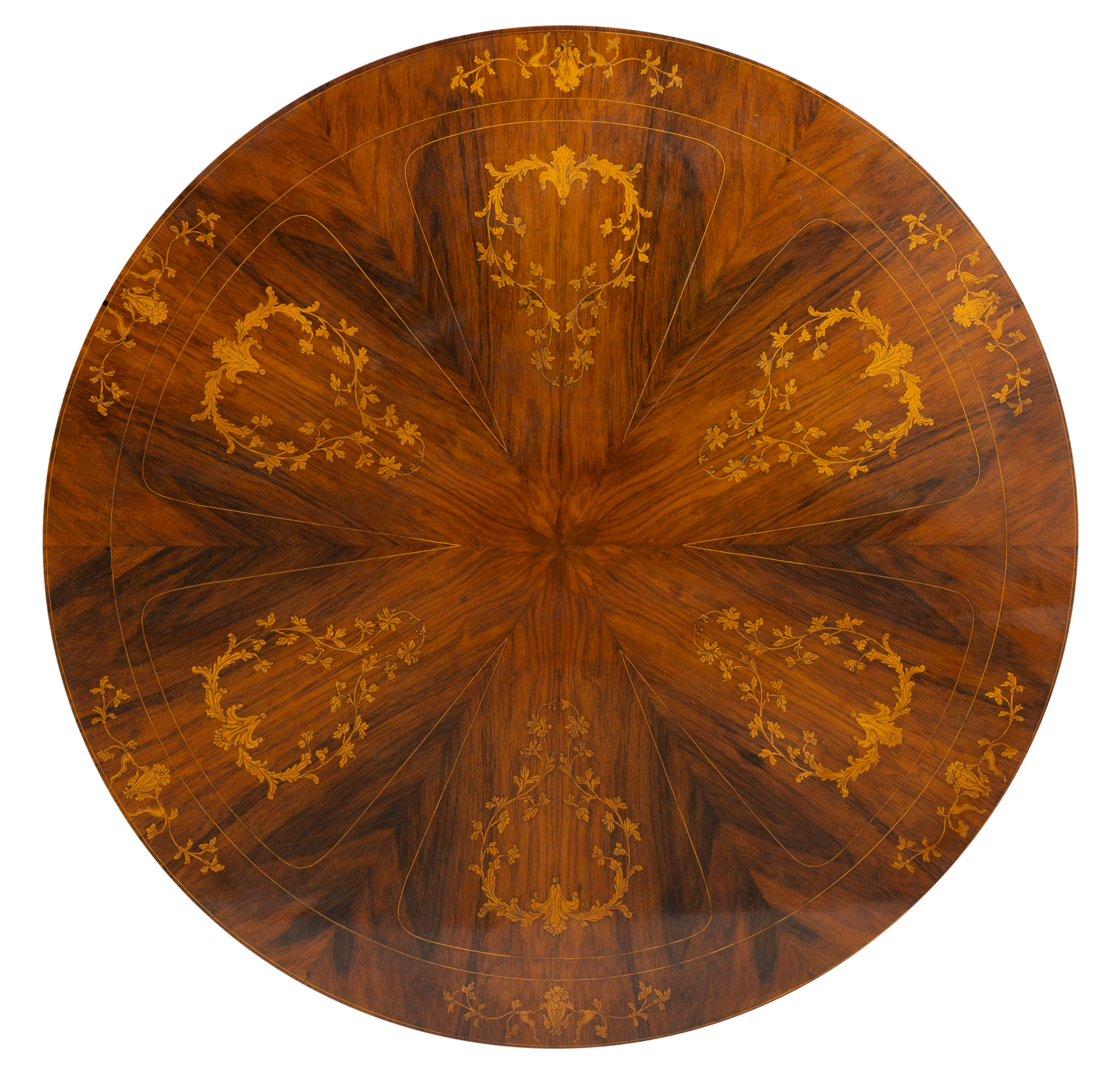 Tavolo stile Carlo X in legno esotico e tarsie in bosso.