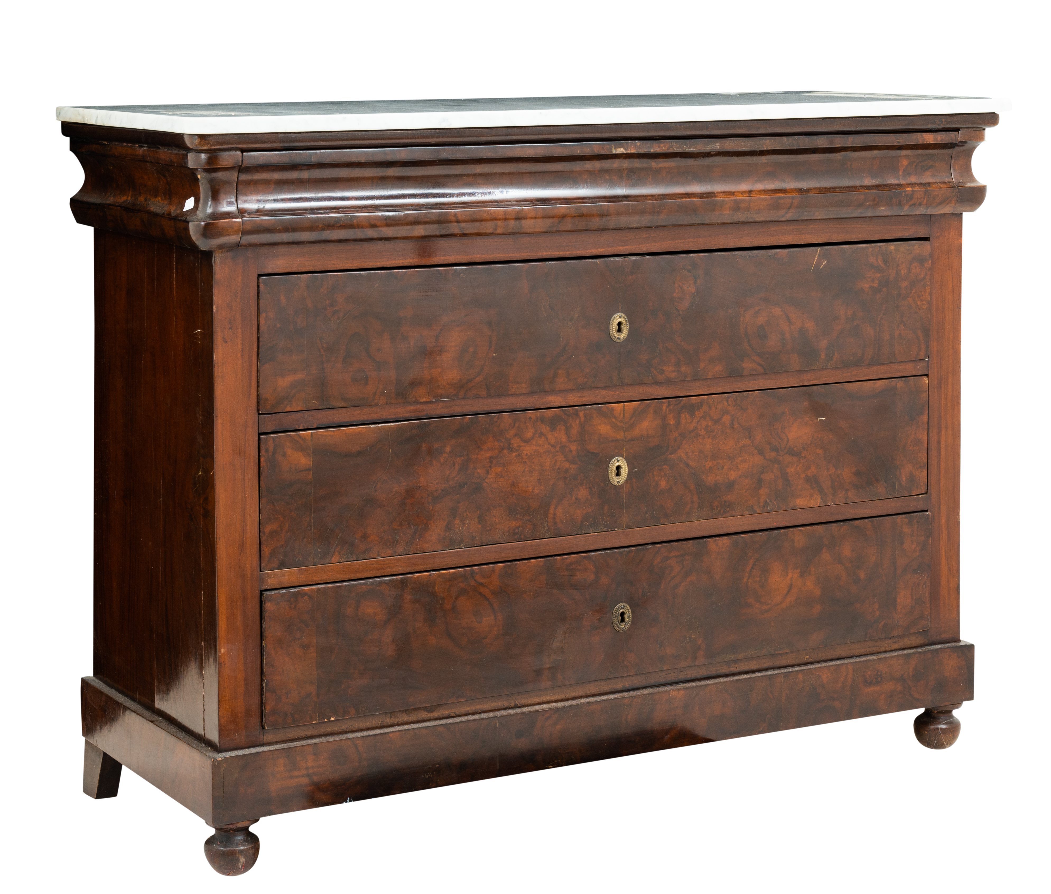 Cassettone stile Luigi Filippo con quattro cassetti in legno di mogano, piano in marmo bianco venato.