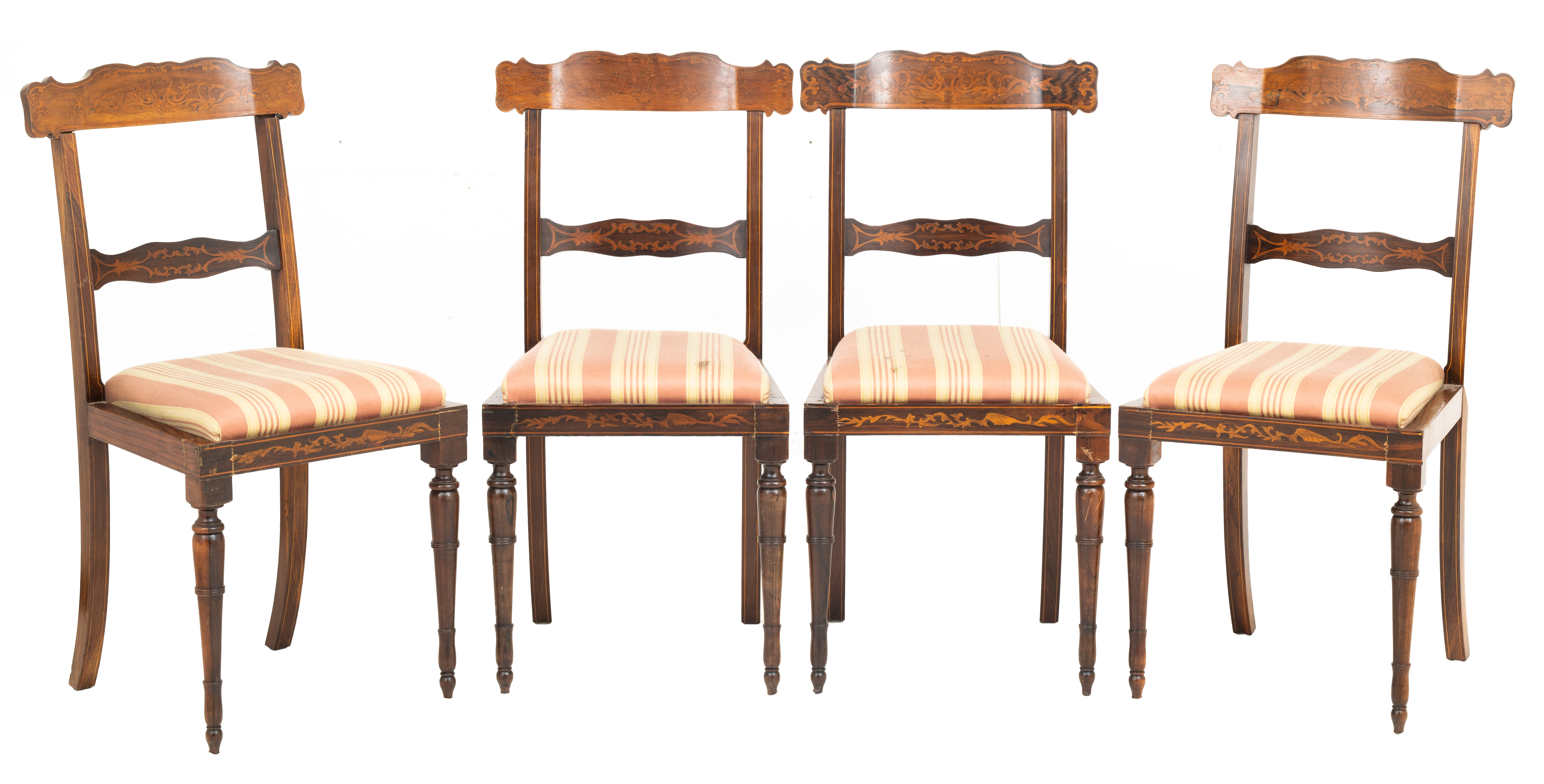 Quattro sedie stile Carlo X in legno esotico e tarsie in bosso.