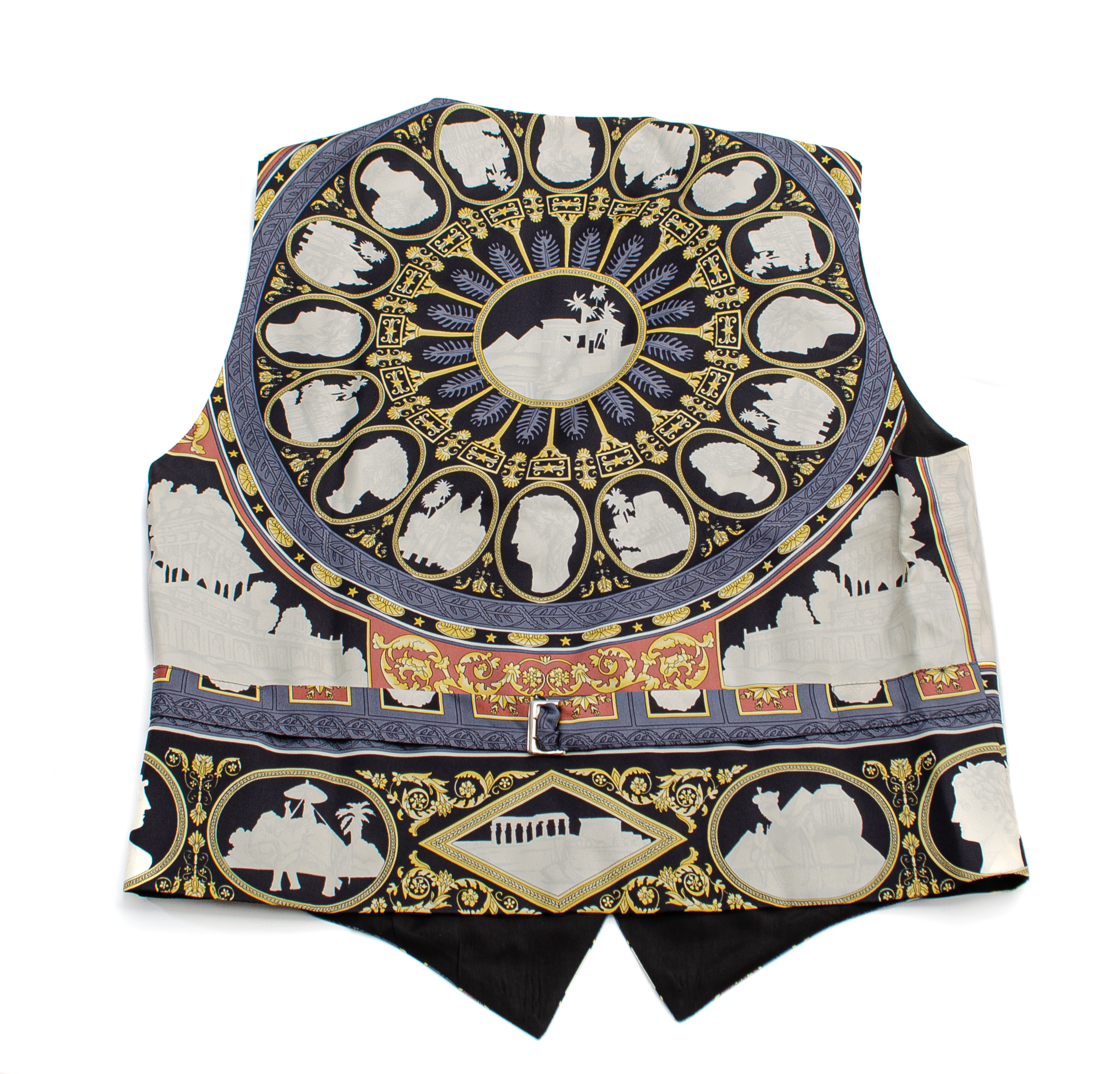 Gilet in seta nera con decori neoclassici grigio, bianco, giallo oro e marrone, bottoni in madreperla. Etichetta di produzione. Taglia 46.