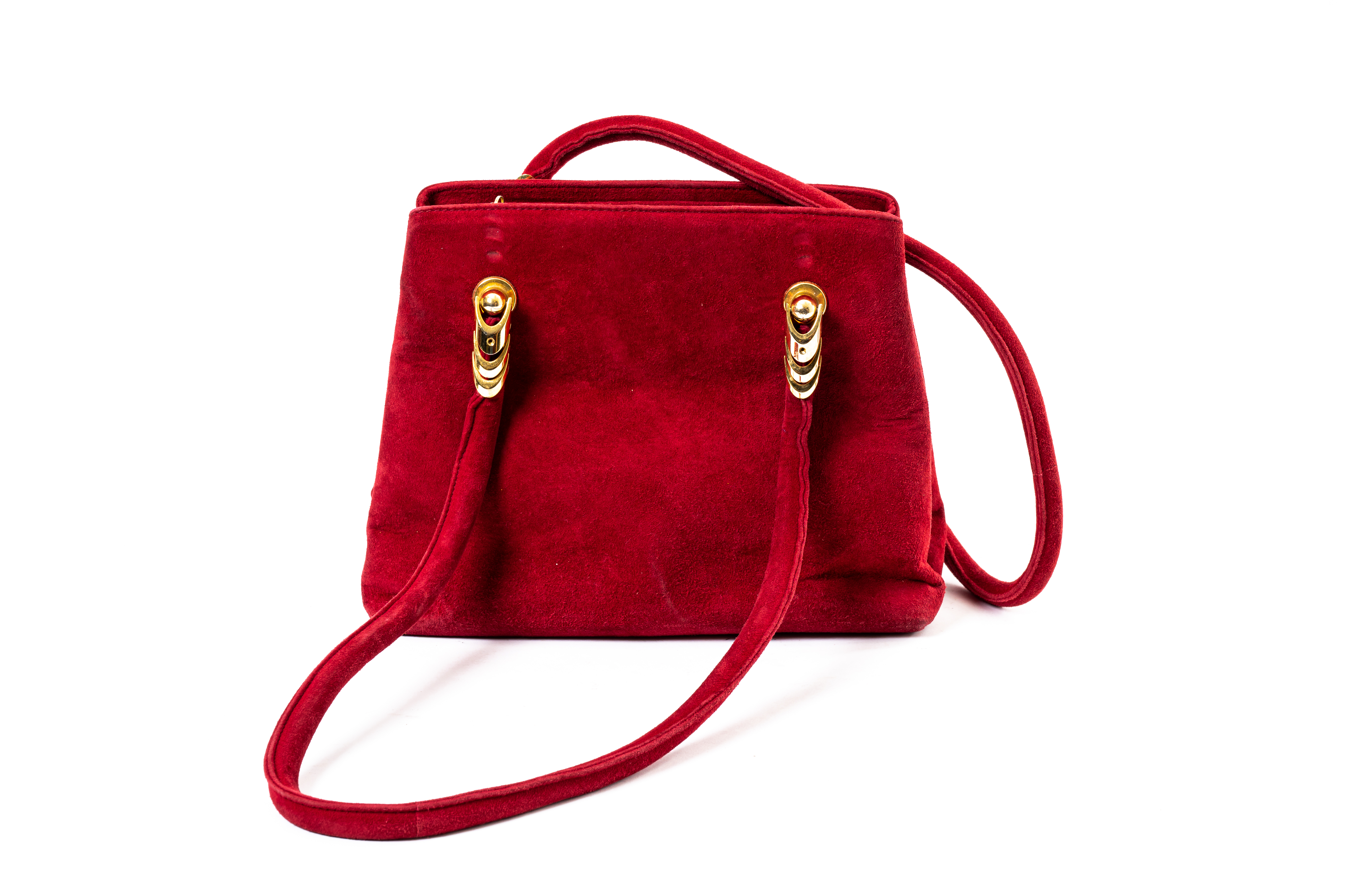 Borsa a spalla in camoscio rosso di forma trapezoidale, chiusura sul bordo superiore, manici tubolari con attacchi in metallo dorato. Segni di uso. Marchio di produzione.