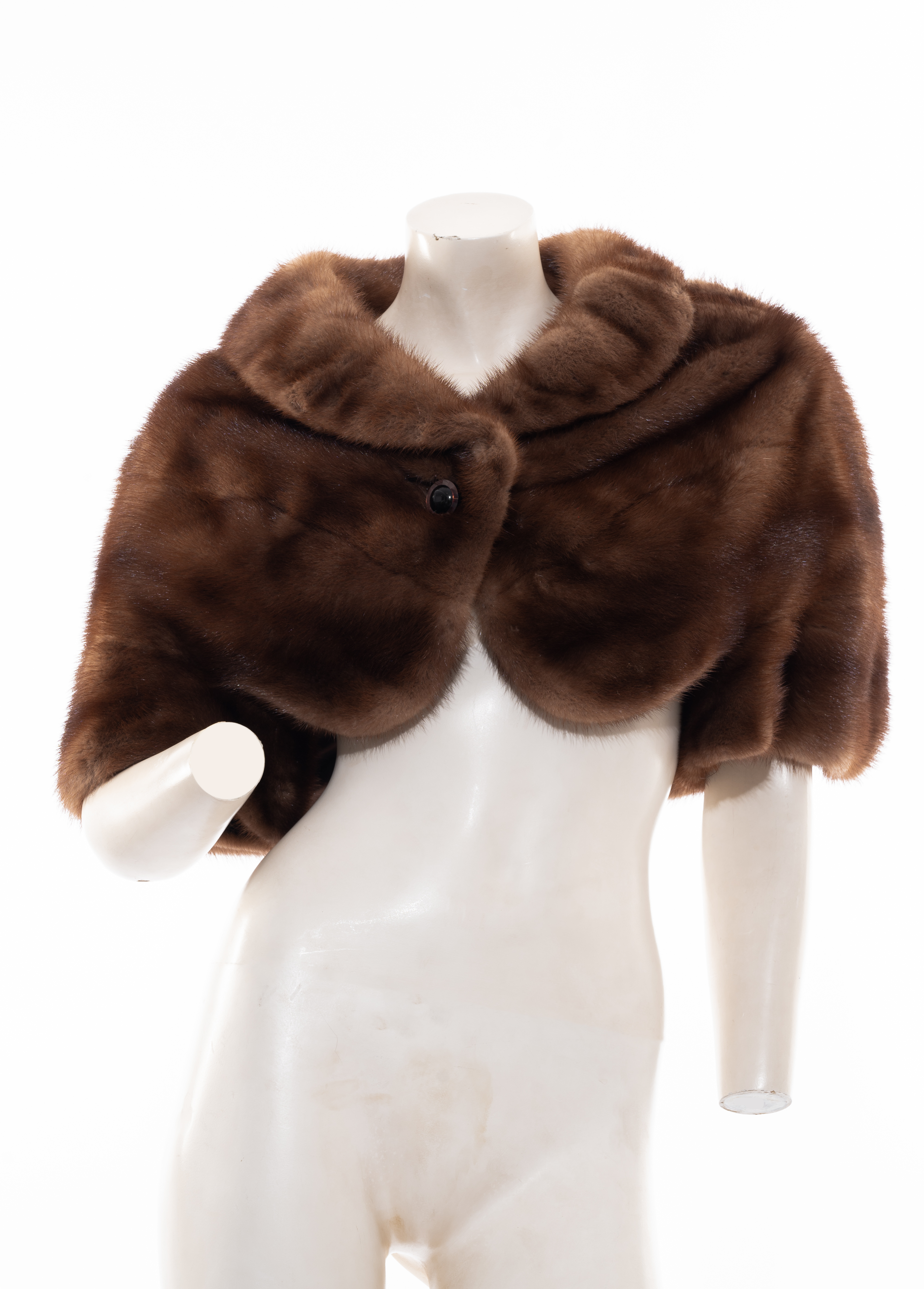 Copri spalle in pelliccia di visone miele, lavorazione a pelli intere orizzontali, ampio collo, chiusura con bottone gioiello. Taglia S. Etichetta di produzione.