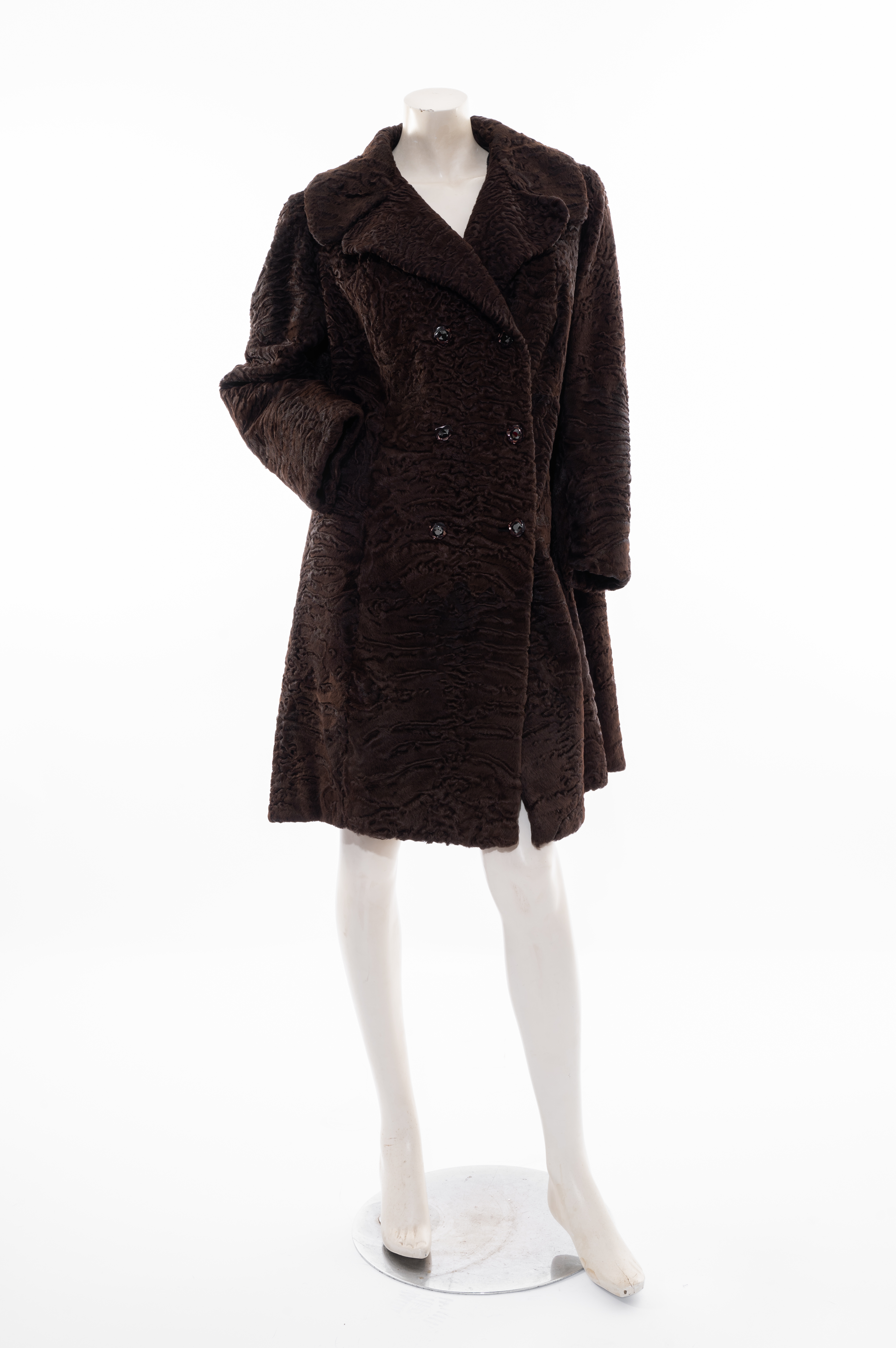 Cappotto in pelliccia di Breitschwanz marrone con pelli lavorate per intero, collo a doppio petto, bottoni gioiello, maniche lunghe, due tasche. Usura al collo. Taglia sartoriale M. Fodera interna con usure.