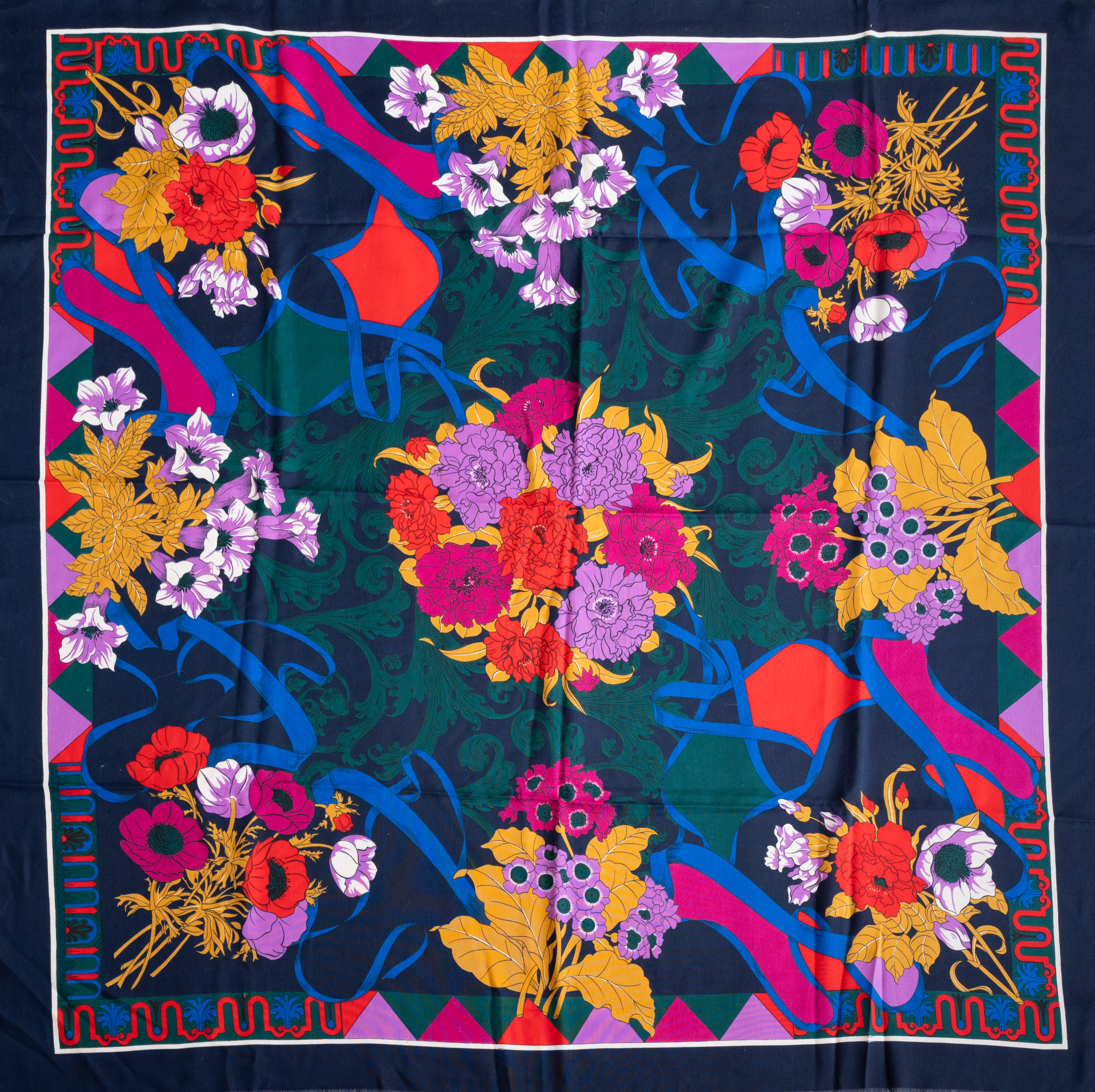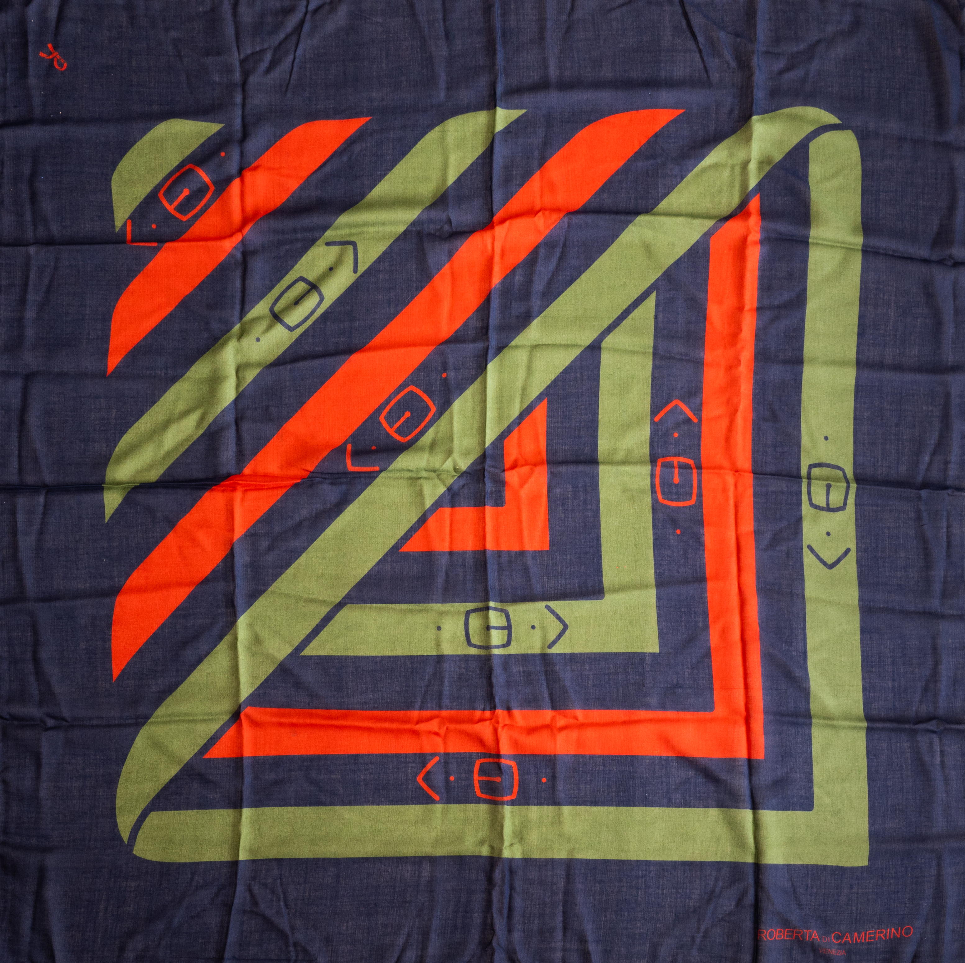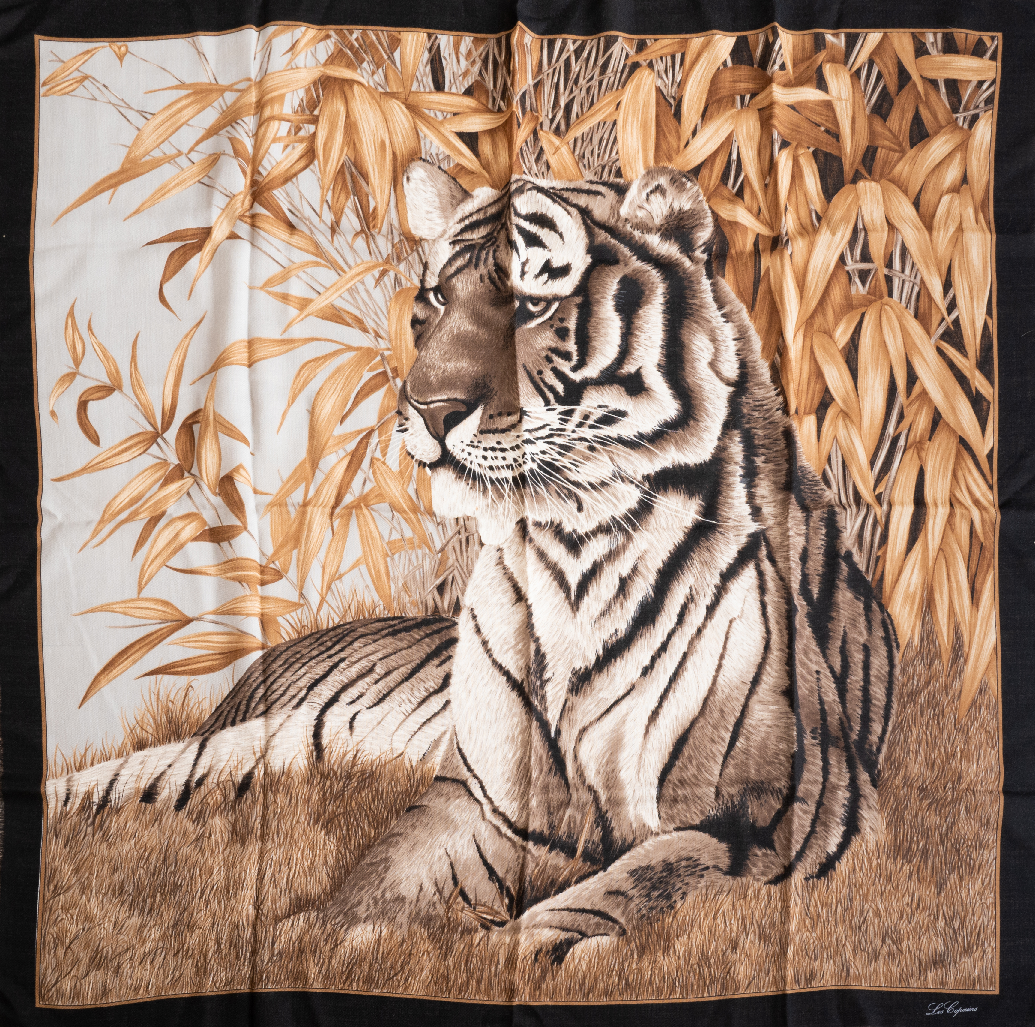 Tre scialli: Roberta di Camerino scialle in lana blu con decori a fasce verdi e rosse. Marchi di produzione; Les Copains scialle in lana con figura di tigre su fondo nero e grigio, cornice nera, marchio di produzione; Produzione Italiana uno scialle in lana con decori floreali policromi su fondo blu, difetti.