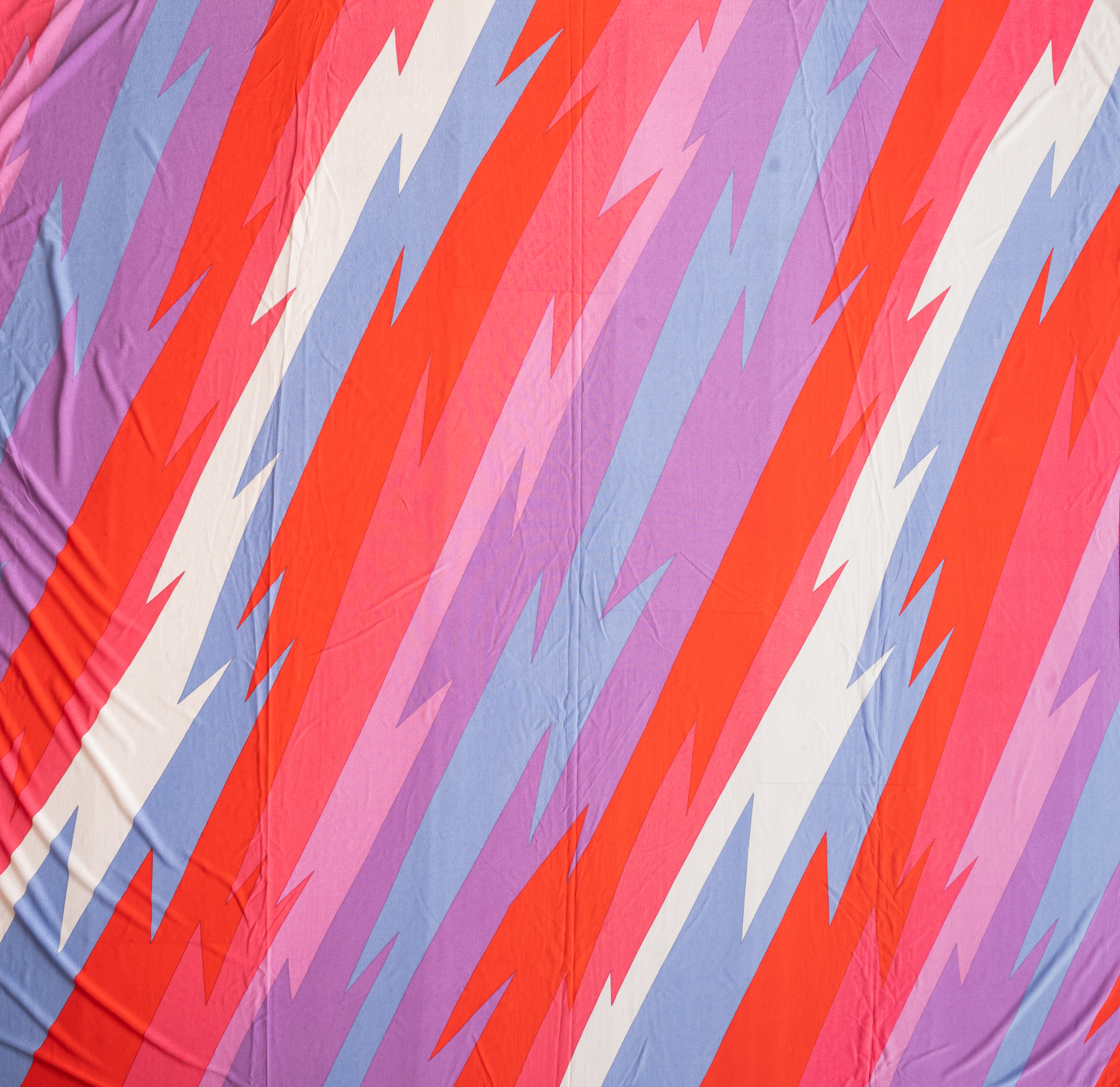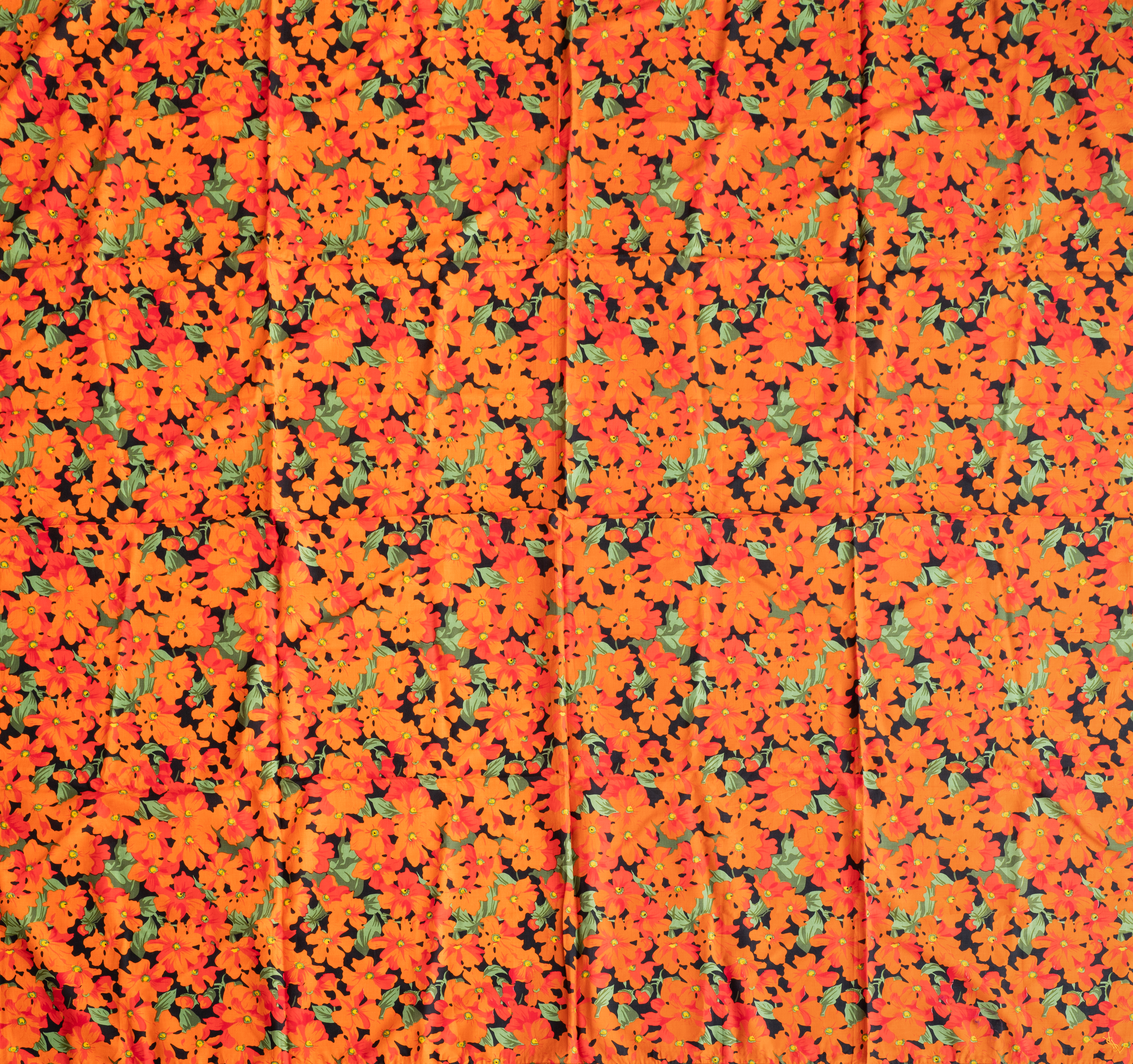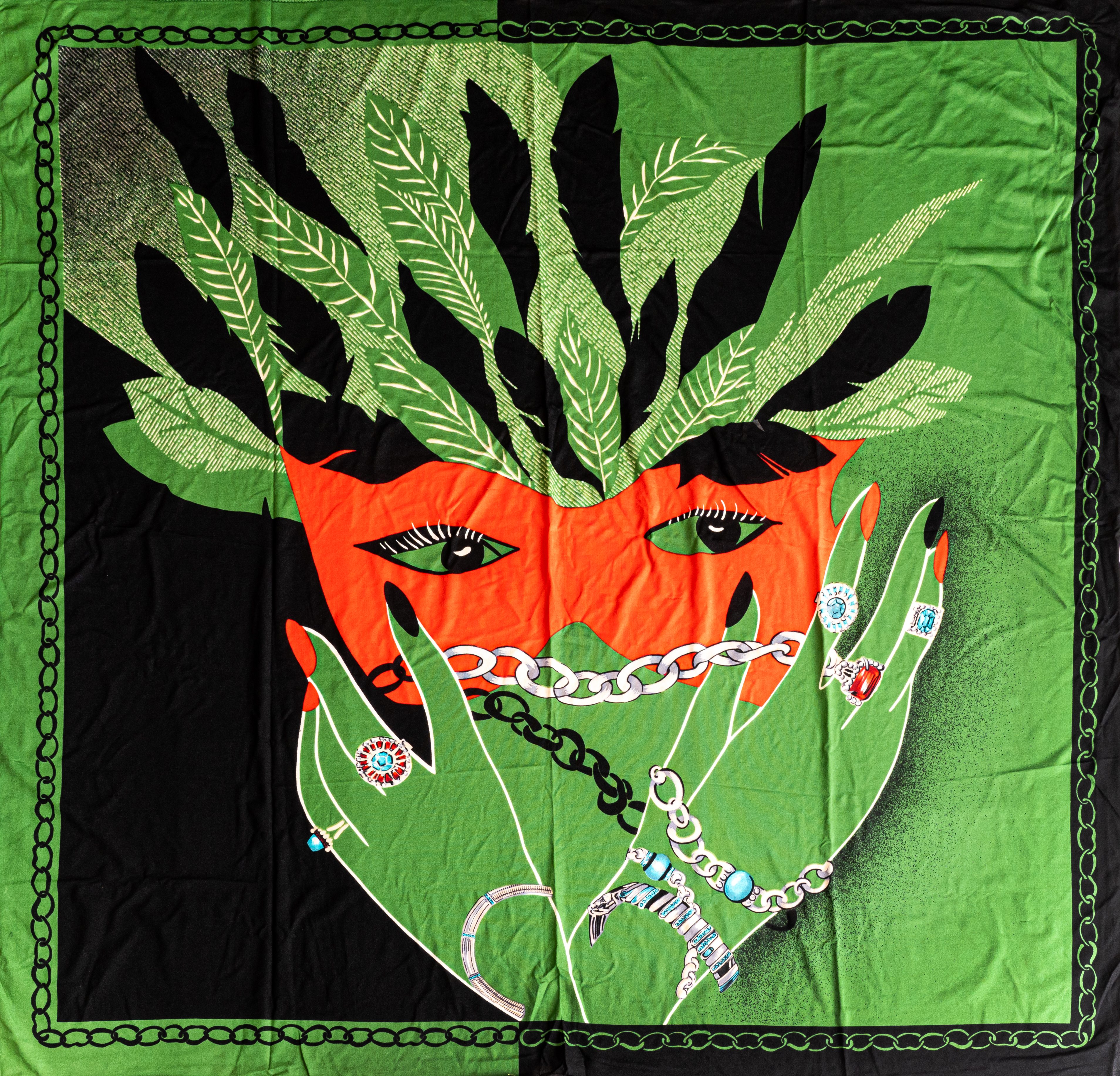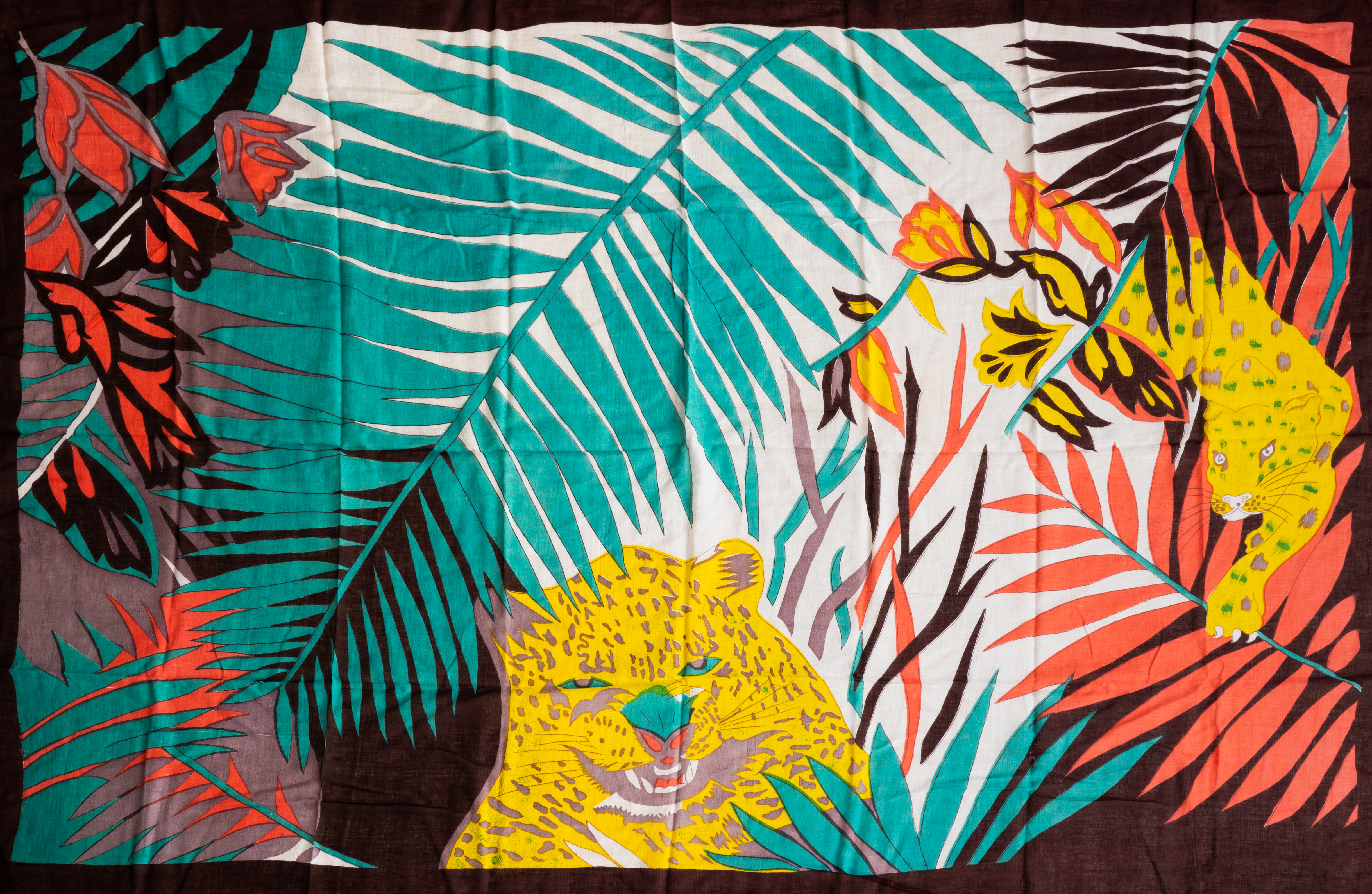 Pareo in tessuto a decorazione floreale nei toni dell'arancio, rosso e verde. Marchio di produzione. Pareo in tessuto a campo turchese, decoro con portantina e bijoux in bianco, cornice bianca. Marchio di produzione. Pareo in jersey con decoro astratto policromo. Marchio di produzione. Pareo in tessuto con decori policromi di frutta e fiori, campo nero e bianco, cornice bianca e nera. Marchio di produzione. Pareo in tessuto con decoro policromo di felini e flora esotica. Telo mare in spugna con decori geometrici turchesi, rossi e neri, cornice viola. Marchio di produzione. Pareo in tessuto a campo verde e nero con figura stilizzata di volto femminile, cornice verde e nera.