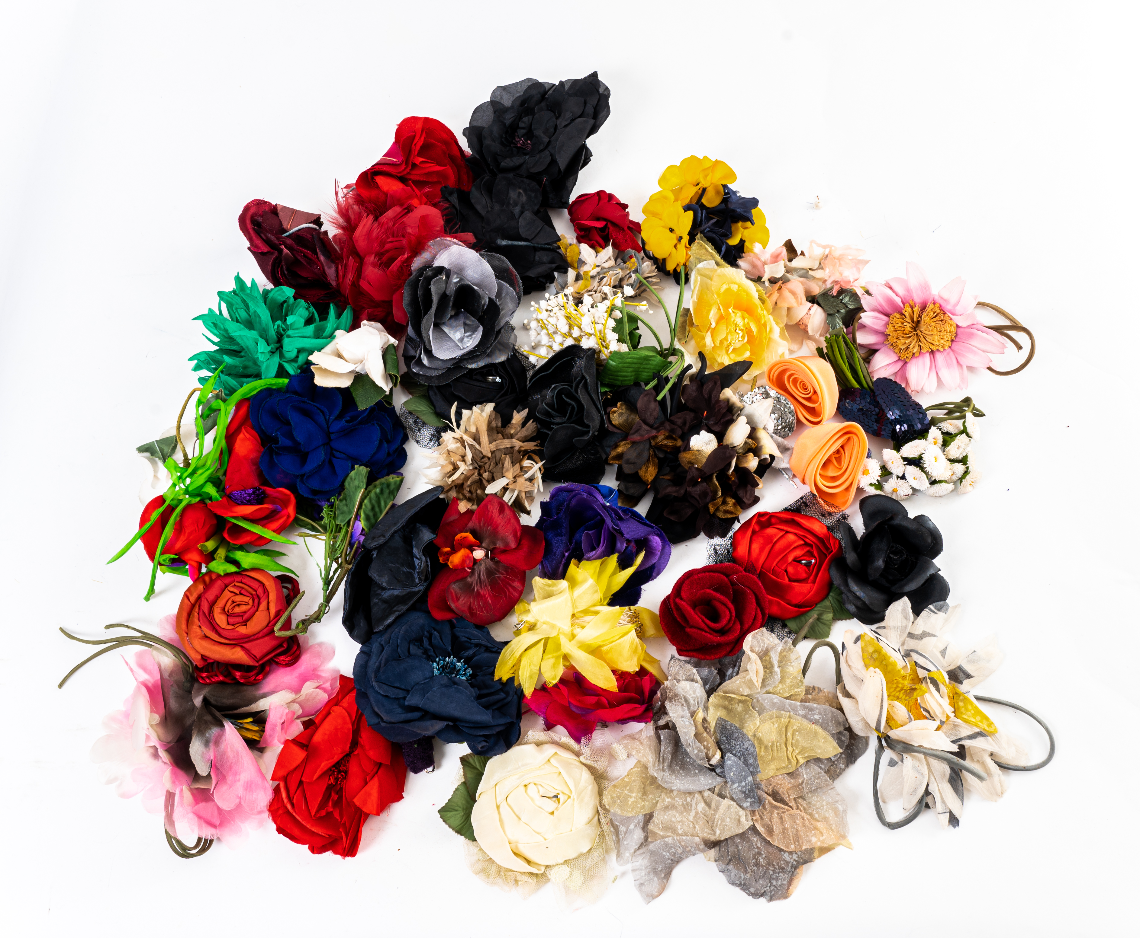 Collezione di quarantadue spille a fiori in tessuto di diversa tipologia e colore, alcuni recano etichetta di produzione. Segni di uso.