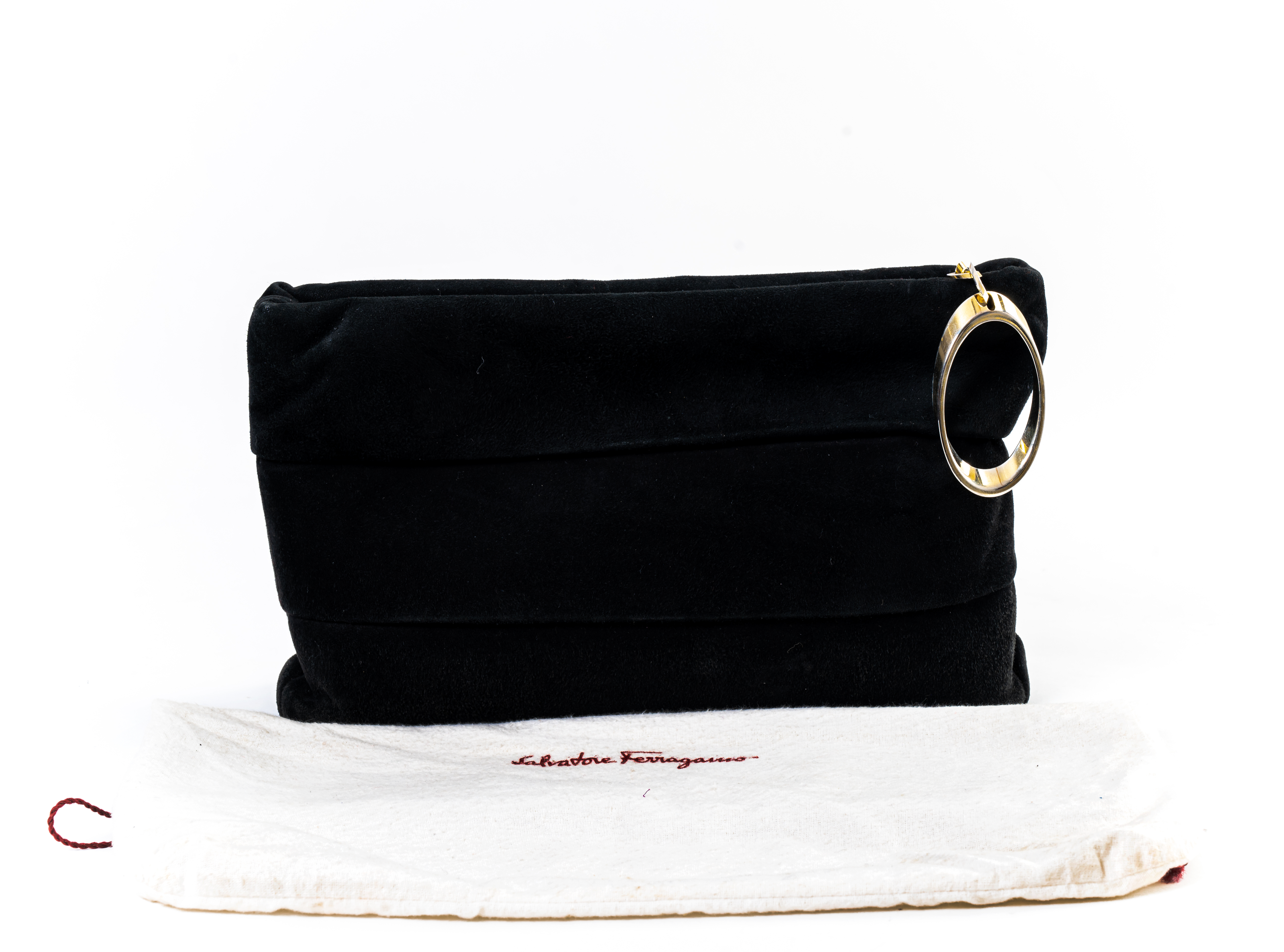 Borsa a mano modello busta in pelle scamosciata nera con tre fasce frontali, chiusura con zip superiore con cursore gioiello in metallo dorato, tasca interna. Dust bag. Segni di uso. Marchio di produzione e codice numerico.