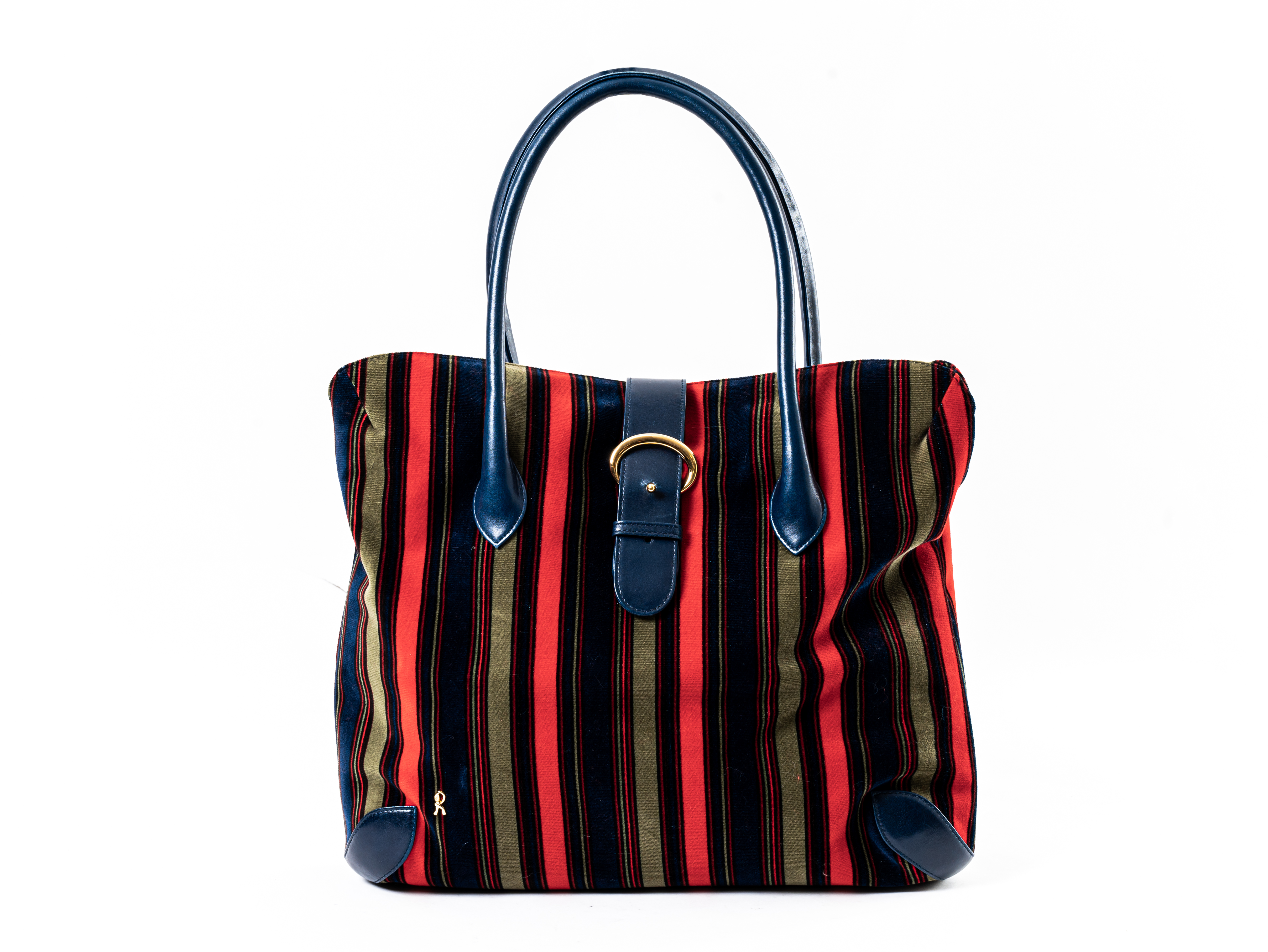 Borsa a mano modello shopper in velluto a righe rosse, verdi e blu, finiture in pelle blu, chiusura frontale a pressione con fibbia in metallo dorato, logo dorato in basso, due tasche interne. Marchio di produzione.