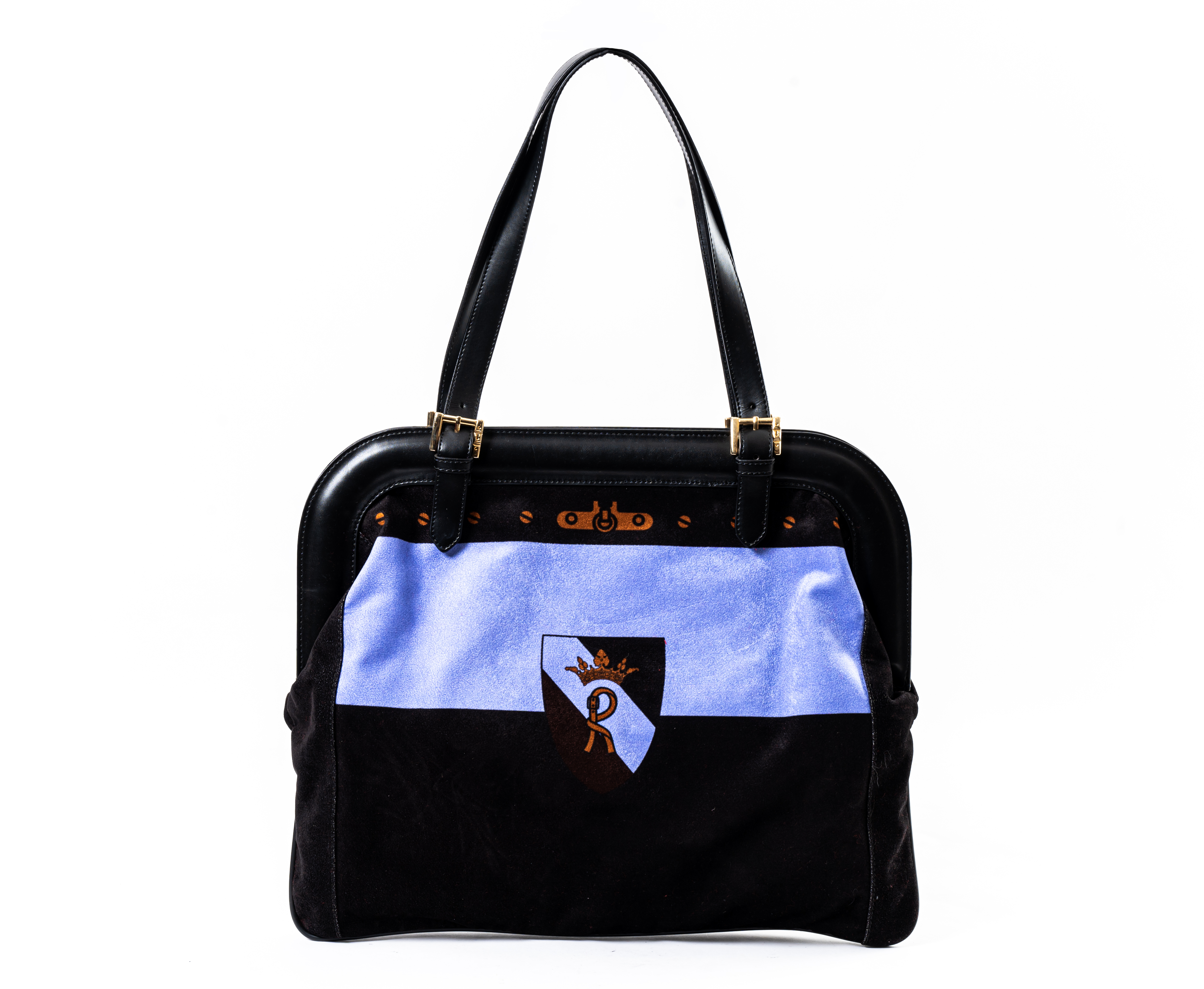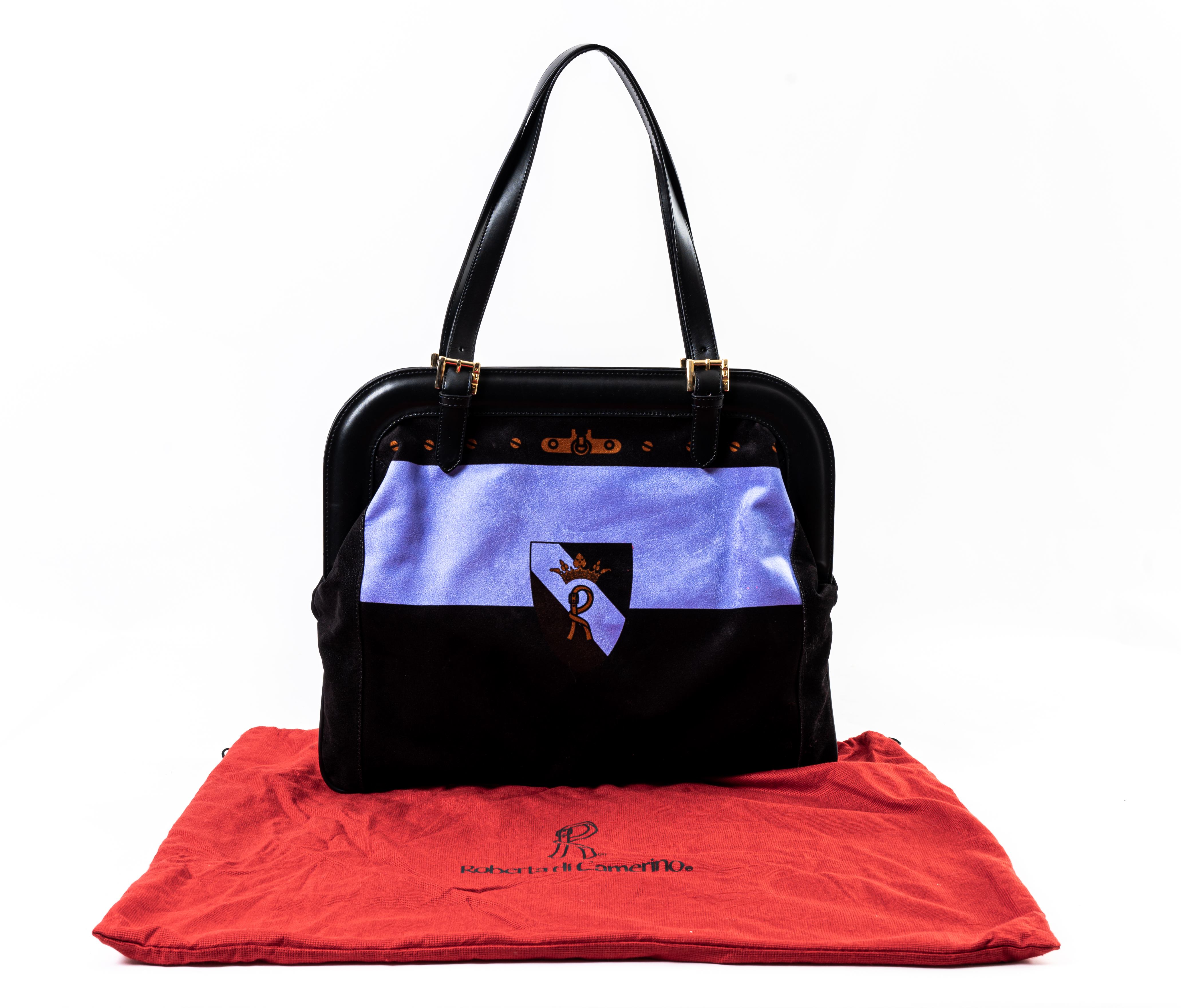 Borsa a mano in velluto stampato nero, fiordaliso e marrone, profilo superiore sagomato in pelle imbottita, logo centrale sul fronte, chiusura a scatto, due tasche. Dust Bag. Marchio di produzione.