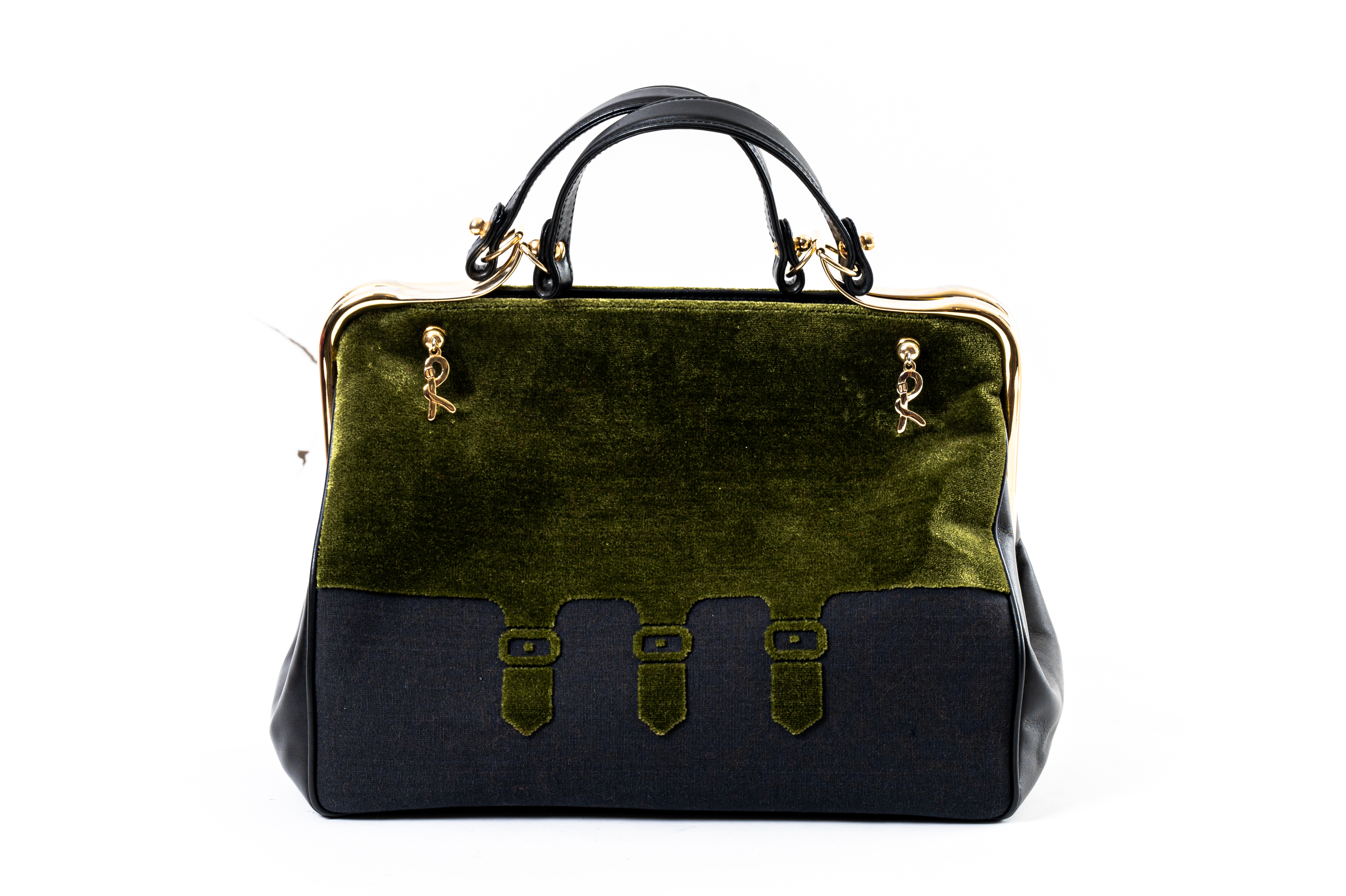 Borsa a mano modello “Doctor Bag” in velluto verde e tessuto nero, chiusura e profilo superiore sagomato in metallo dorato, due “R” sul fronte superiore, manico piatto, due tasche. Dust Bag. Marchio di produzione.