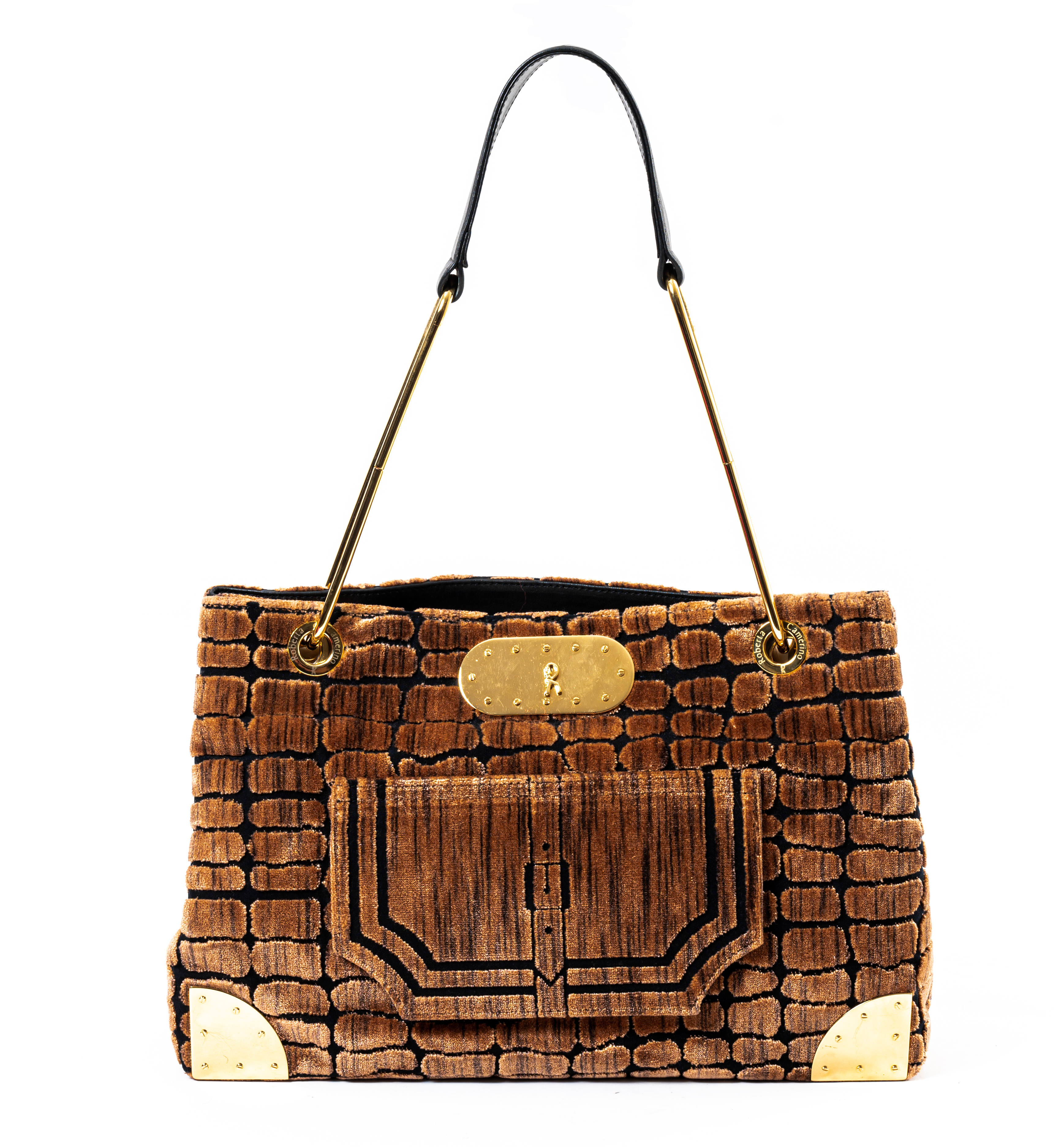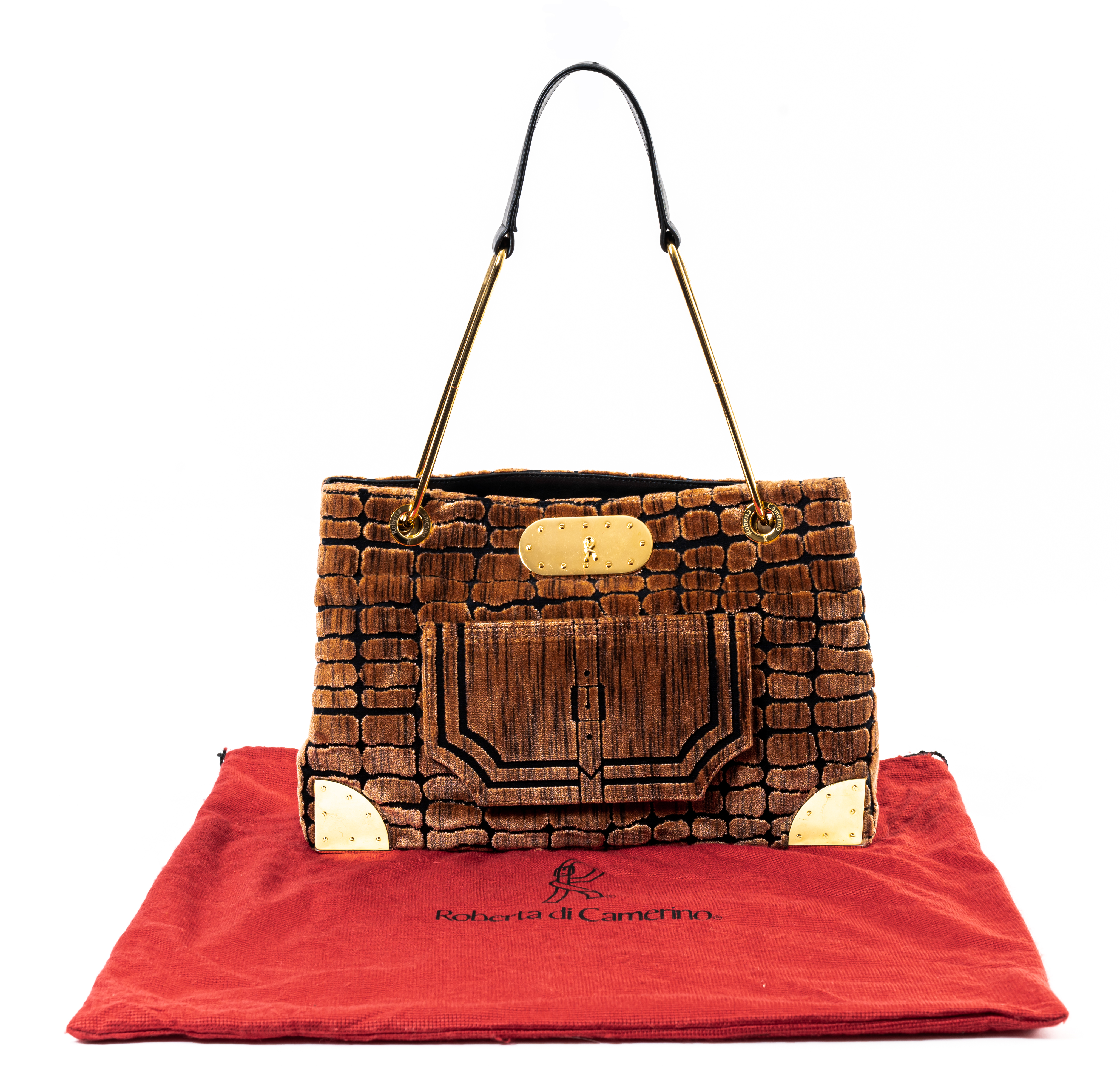 Borsa a mano e a spalla in velluto marrone e tessuto nero, manico in piatto in pelle con due grandi anelli ovali in metallo dorato, logo su piastra dorata in alto al centro, chiusura sul bordo superiore, tasca esterna, due tasche interne. Minuterie in metallo dorato e logato. Dust Bag. Marchio di produzione.