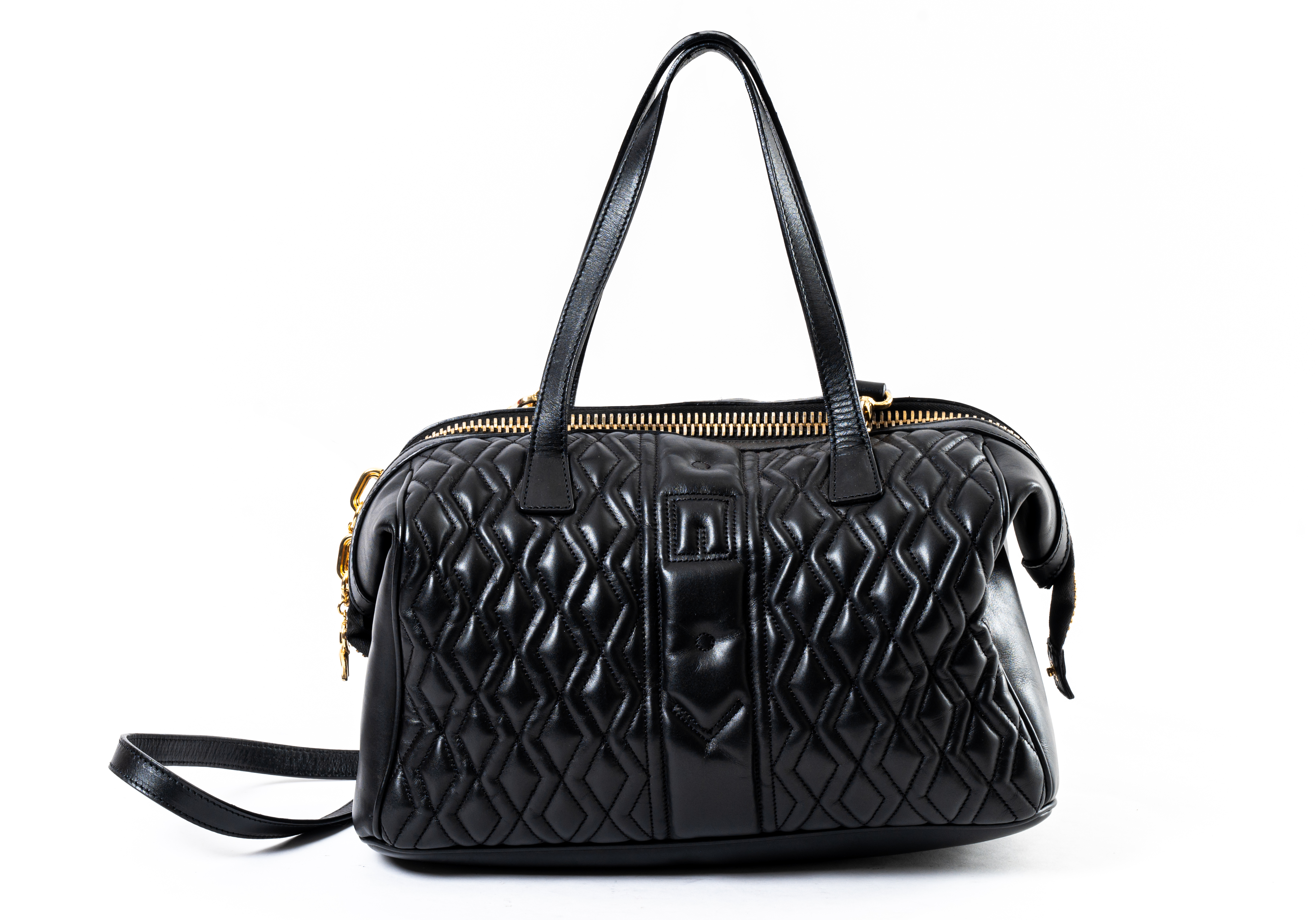 Borsa a mano modello “Bauletto” in pelle nera stampato, decori con imbottitura, chiusura superiore con cerniera, cursore con logo “R” in metallo dorato, tasca interna manici tubolari e tracolla. Dust Bag. Marchio di produzione.
