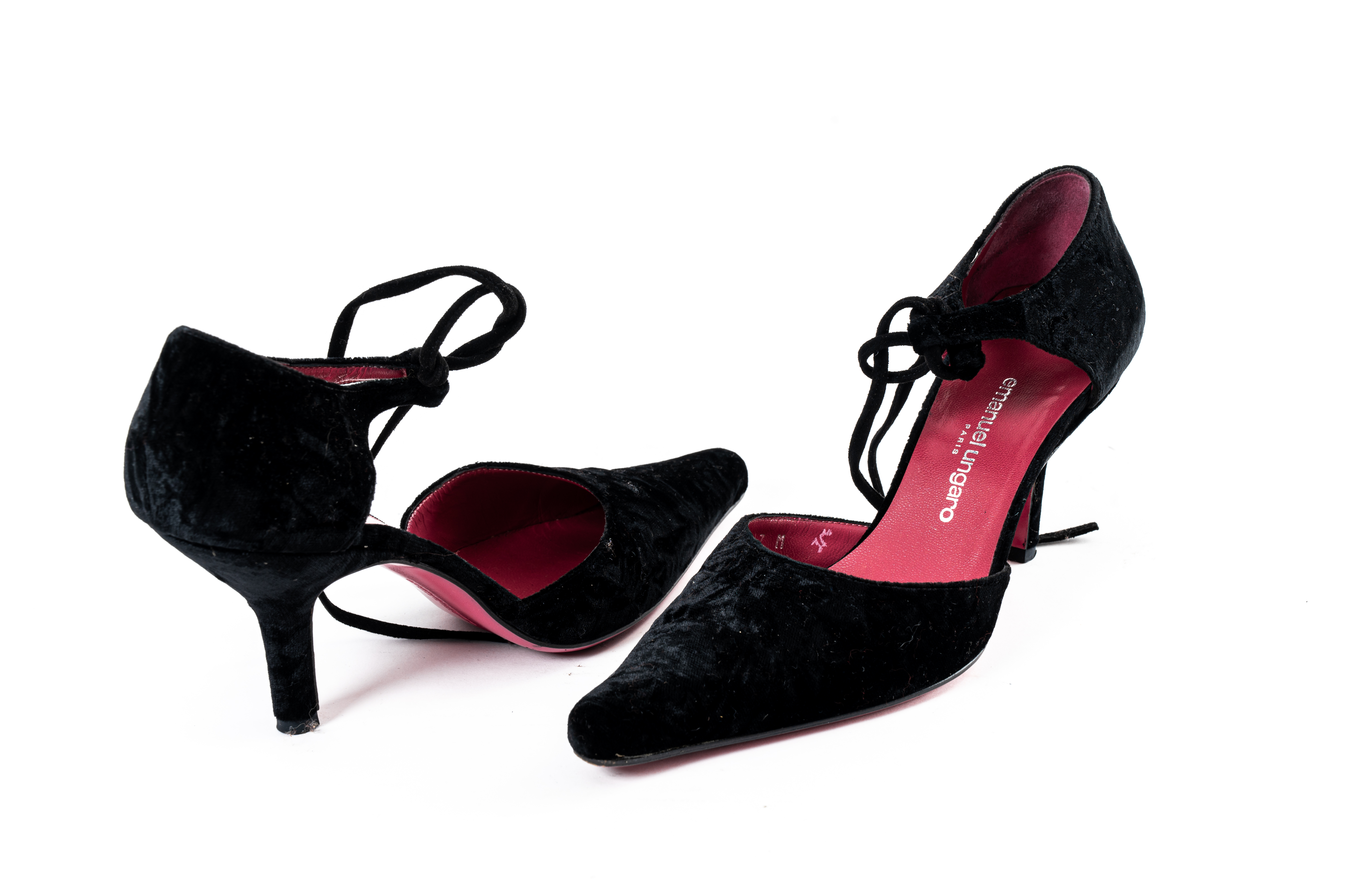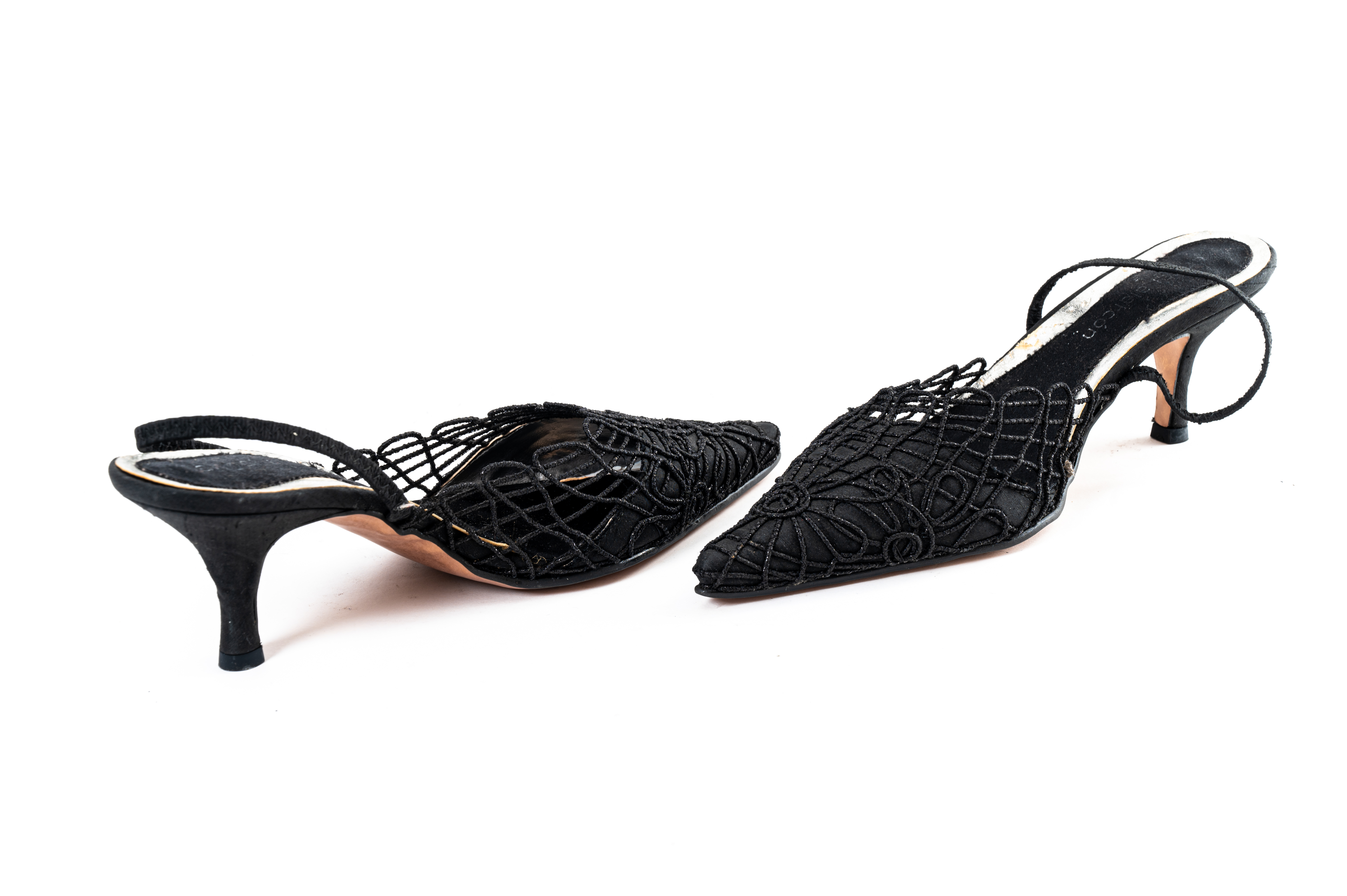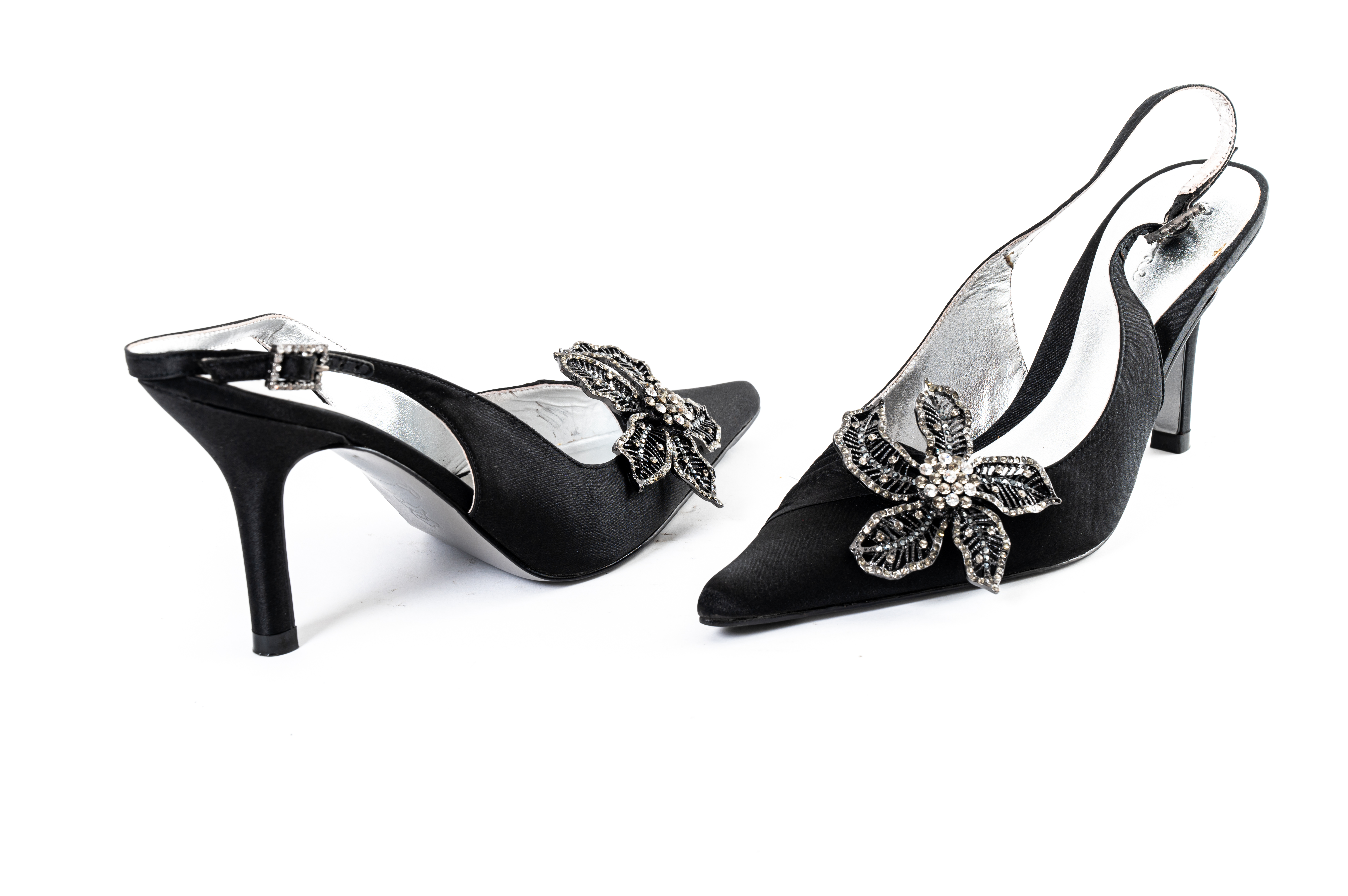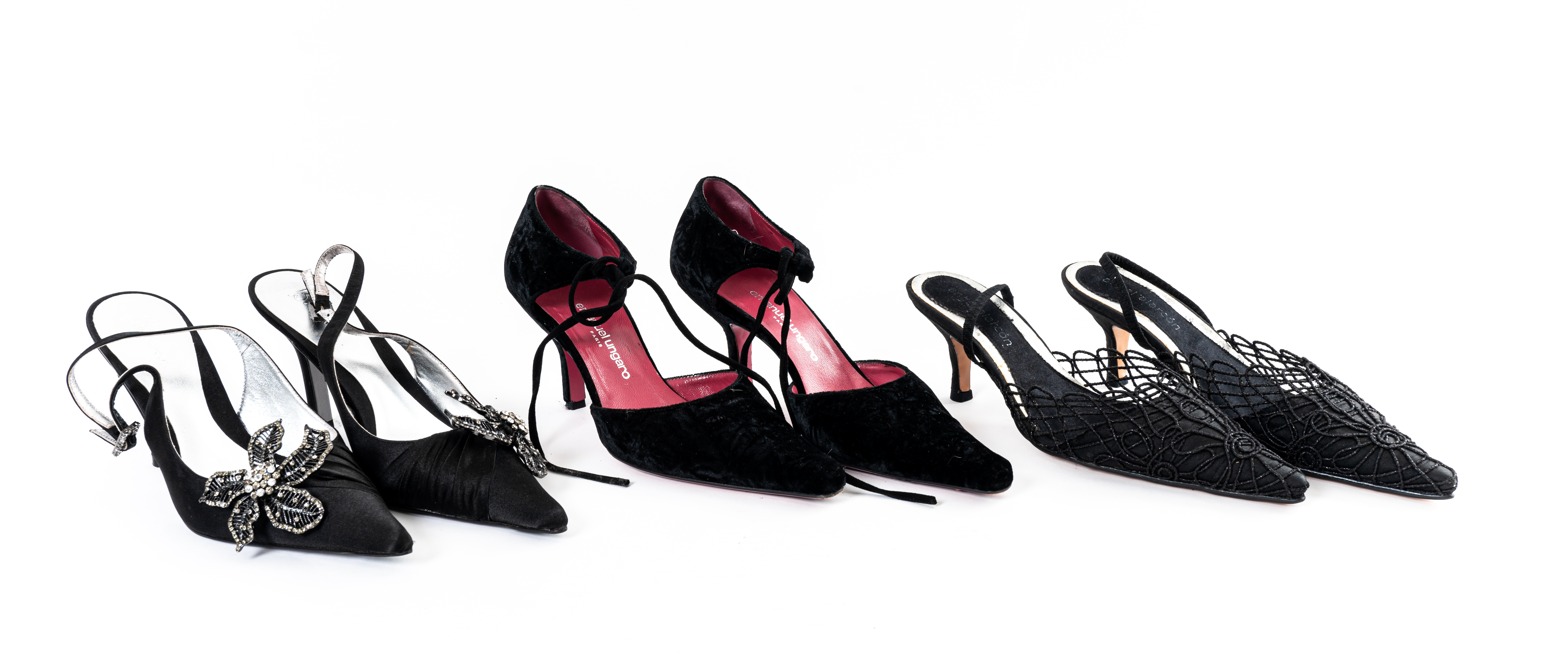 Un paio di decolettè in seta nera, fibbia e fiore gioiello con montatura in metallo argentato e zirconi. Taglia 37. Marchio di produzione. Un paio di decolettè in velluto nero con chiusura alla caviglia. Taglia 7. Marchio di produzione. Un paio di decolettè in seta nera e pizzo a trama larga. Taglia 37. Marchio di produzione.