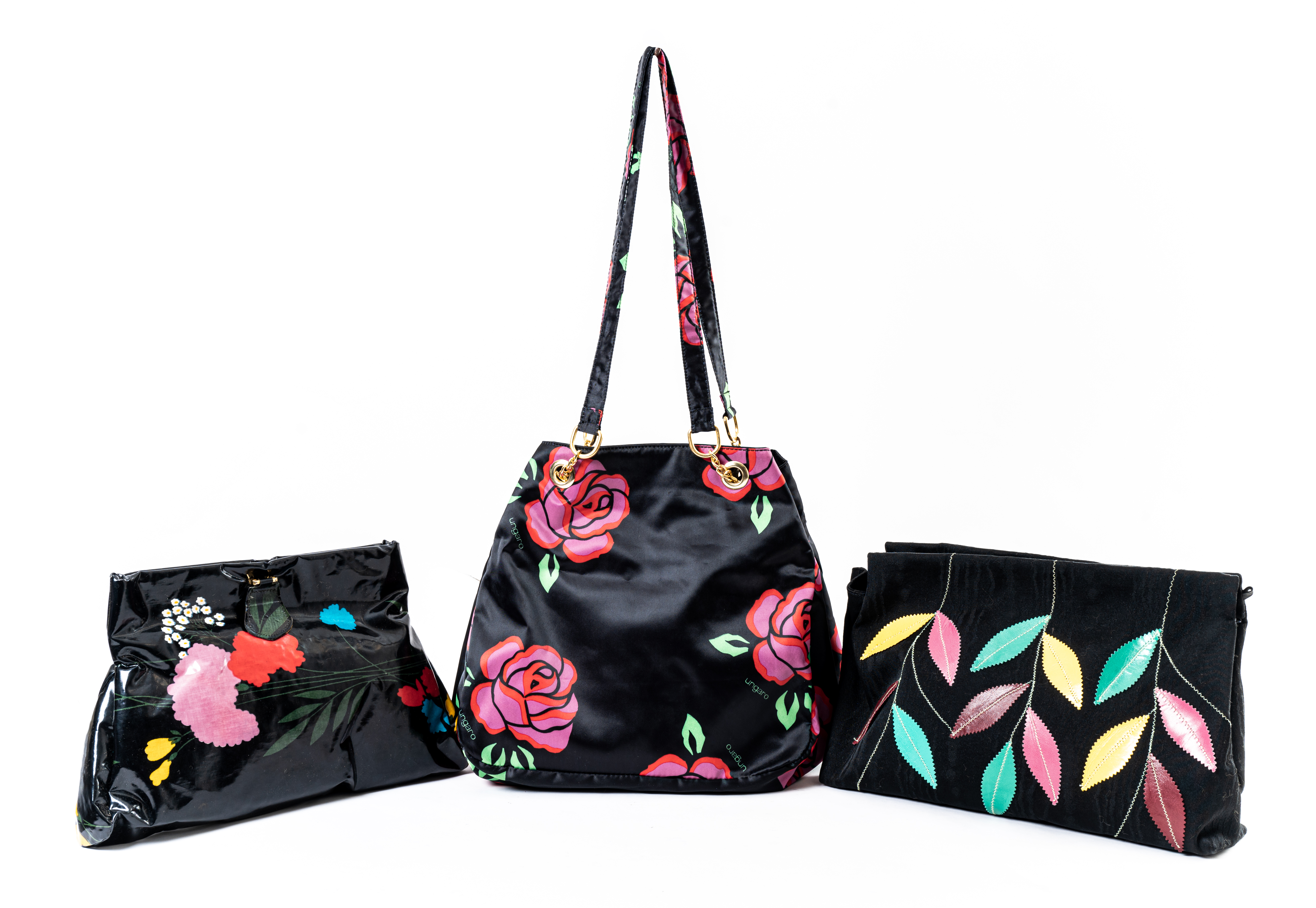 Borsa a spalla Ungaro in tessuto lucido nero con rose fuxia e rosse, chiusura superiore, tracolla piatta, minuterie in metallo dorato, tasca interna. Marchio di produzione. Borsa a mano modello a busta in materiale sintetico nero lucido e decorato con fiori policromi, chiusura superiore, tasca interna. Borsa a mano modello a busta in camoscio nero e decorato con foglie policrome, chiusura superiore, tasca interna.