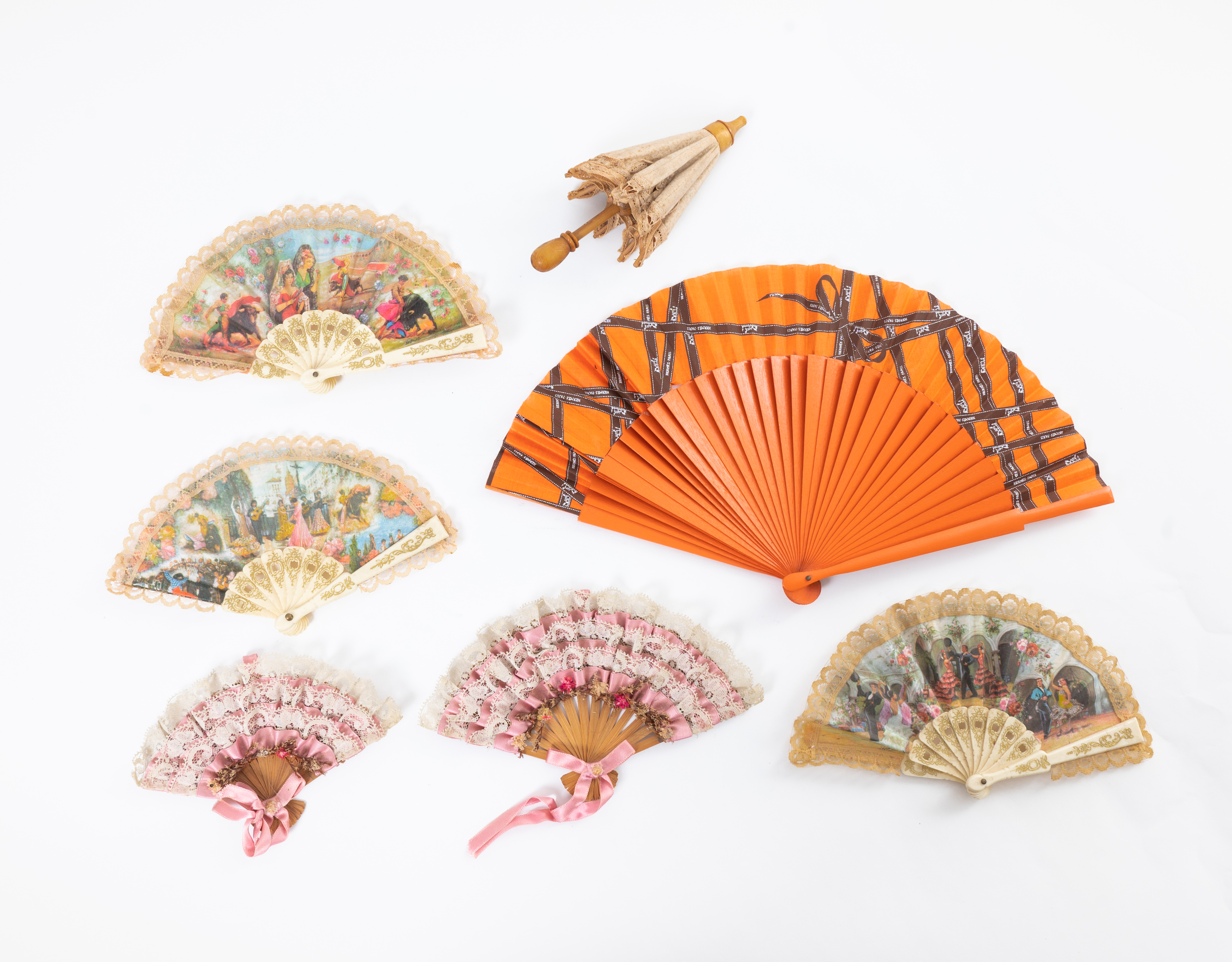 Un ventaglio con stecche in legno laccato arancione, pagina arancione decorata con nastri marroni logati Hermès. Cinque ventagli da bambola con decori policromi differenti. Un ombrellino da bambola con stecche in legno e pizzo avorio.