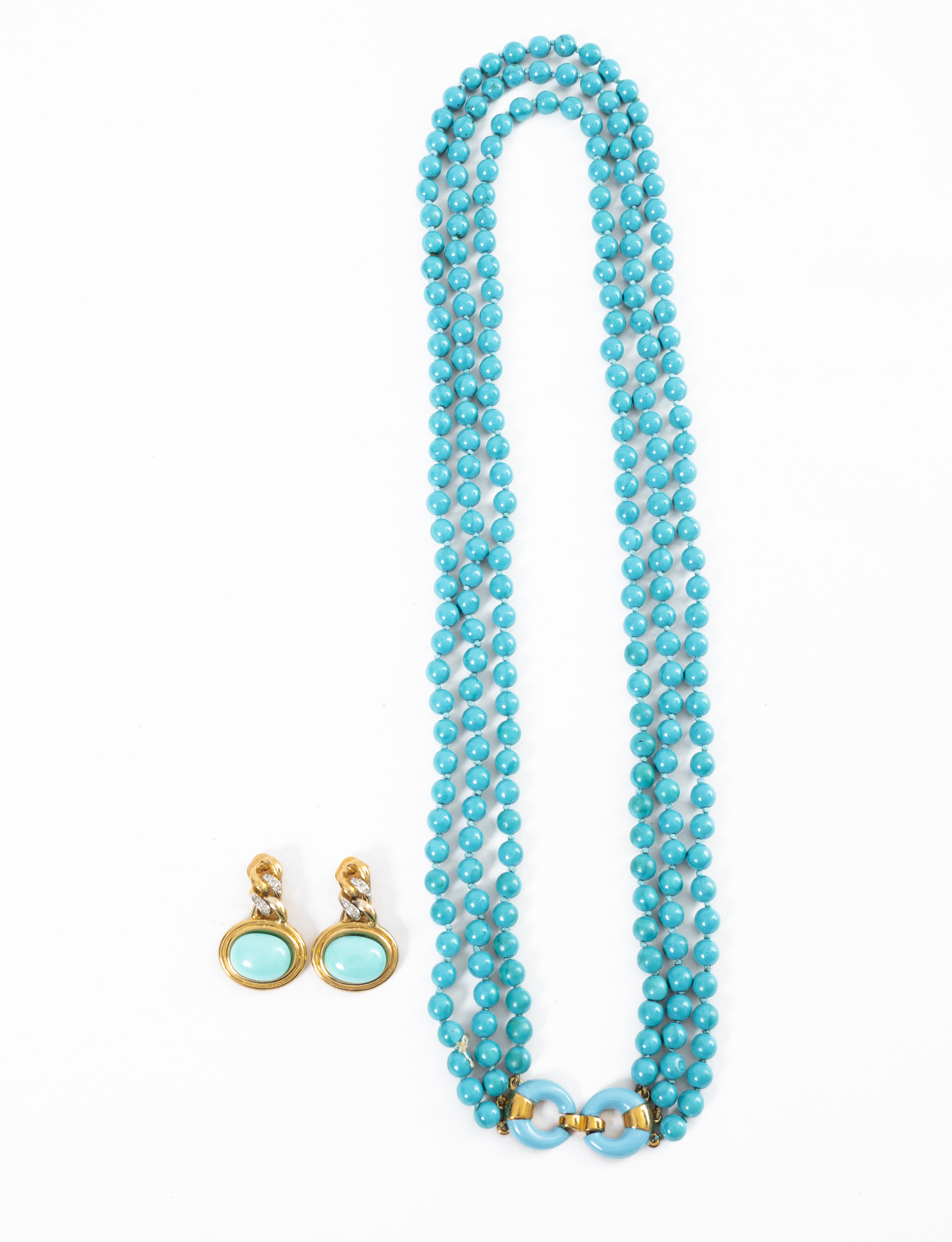 Collana a tre fili di sfere in turchese sintetico, susta gioiello con montatura in metallo dorato. Orecchini pendenti con montatura in metallo dorato, catene con diamanti sintetici, cabochon in turchese sintetico. Chiusura a clips.