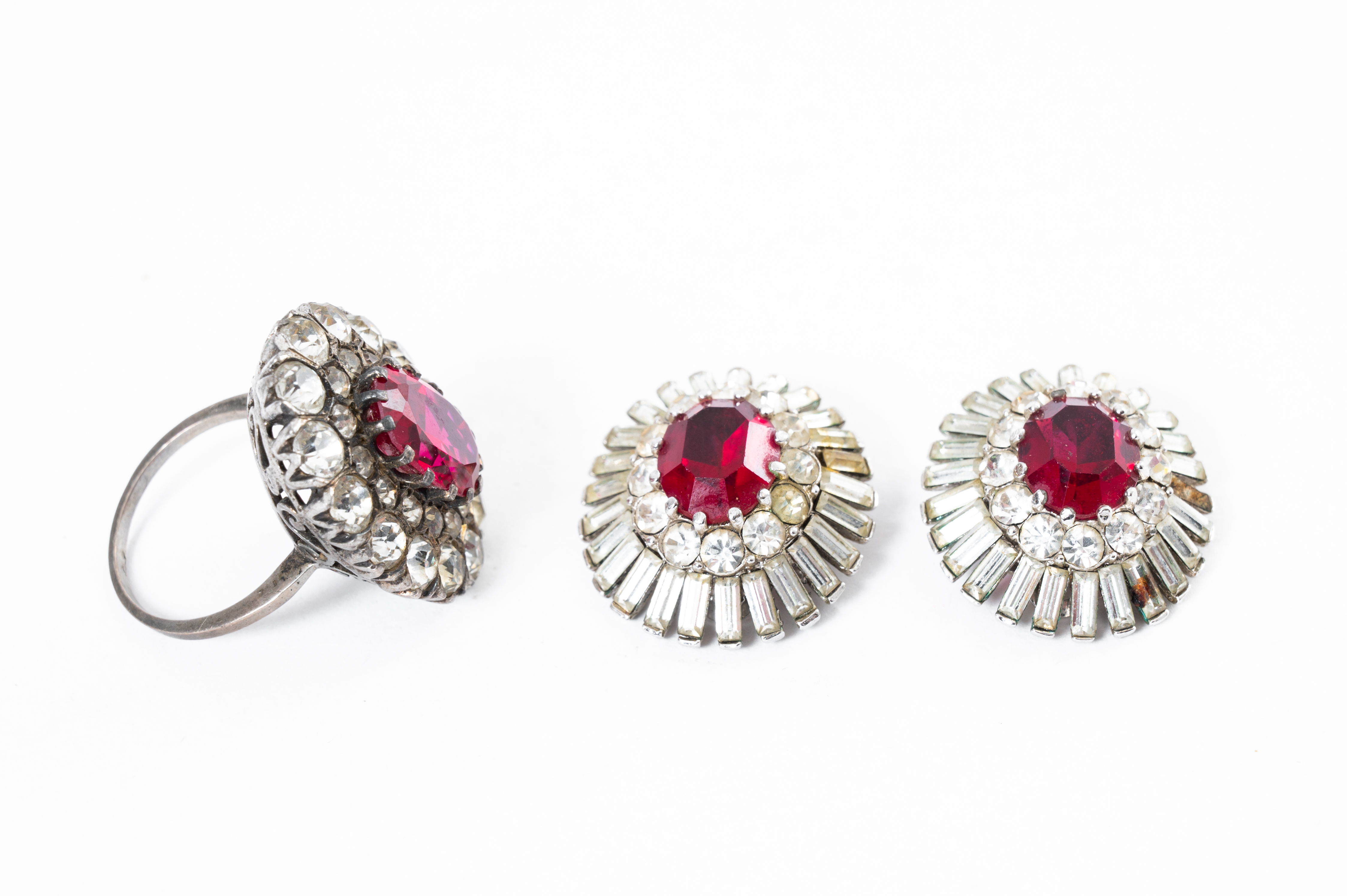 Orecchini con montatura in metallo argentato, grosso rubino sintetico di taglio ovale contornato da diamanti sintetici taglio brillante e taglio baguette, chiusura a clips. Anello con montatura in metallo argentato, grosso rubino sintetico di taglio ovale contornato da diamanti sintetici.